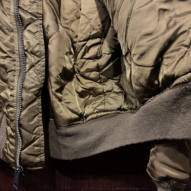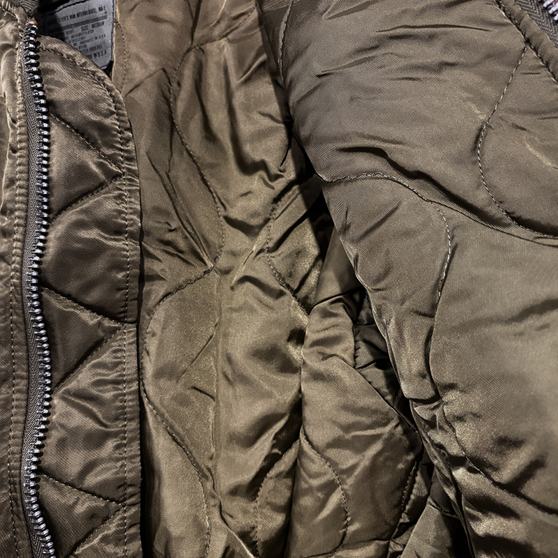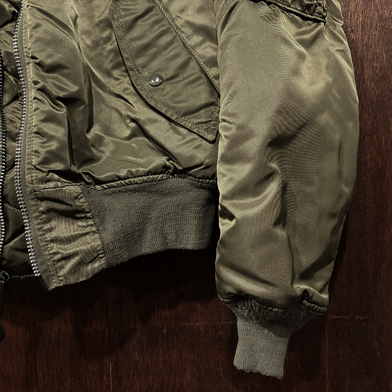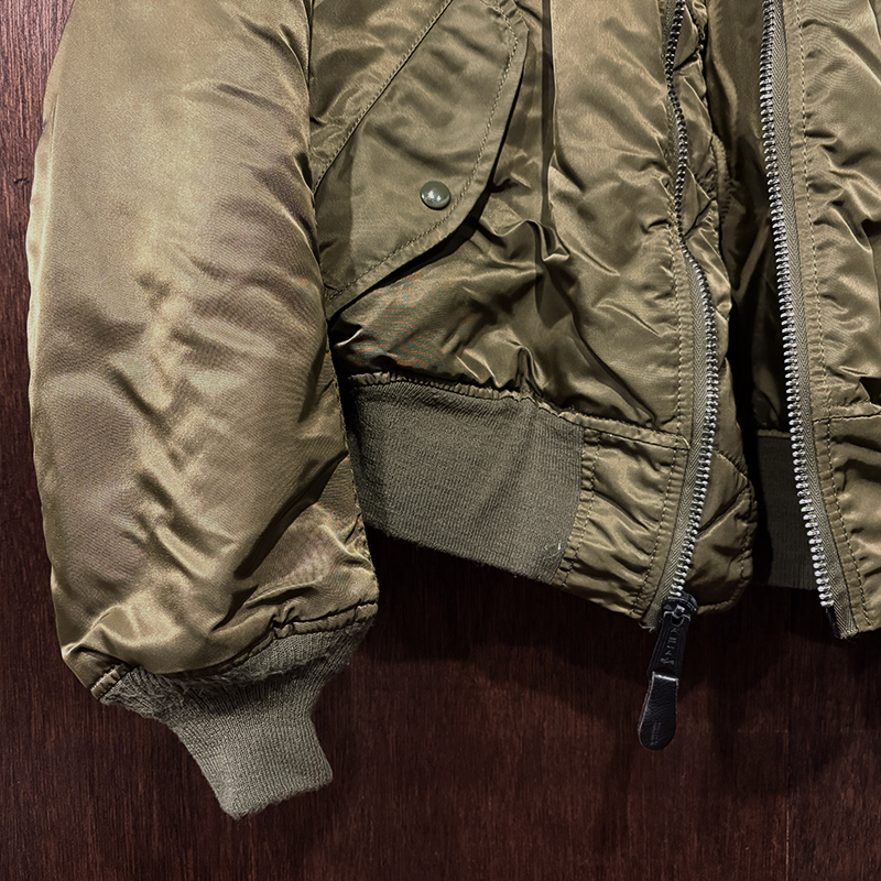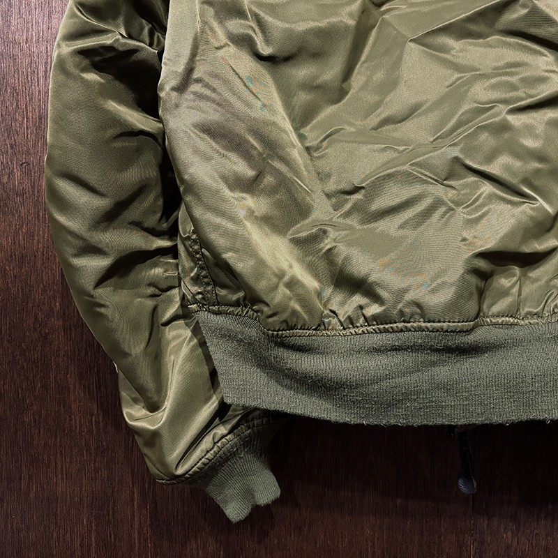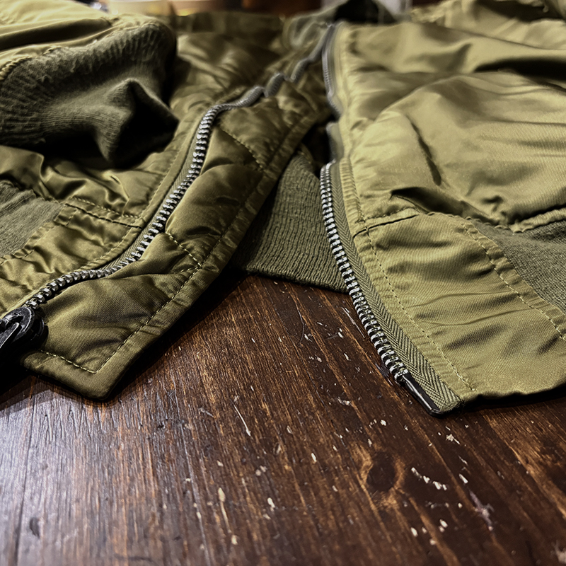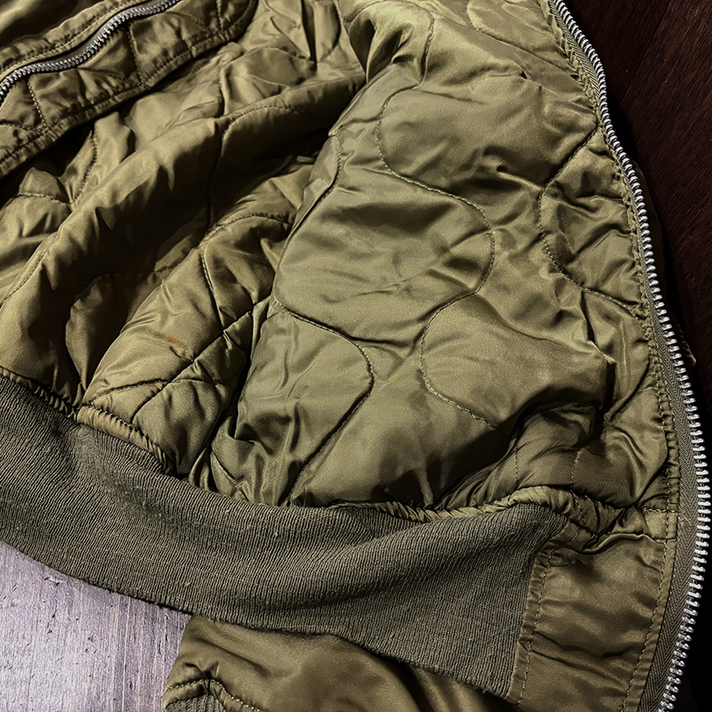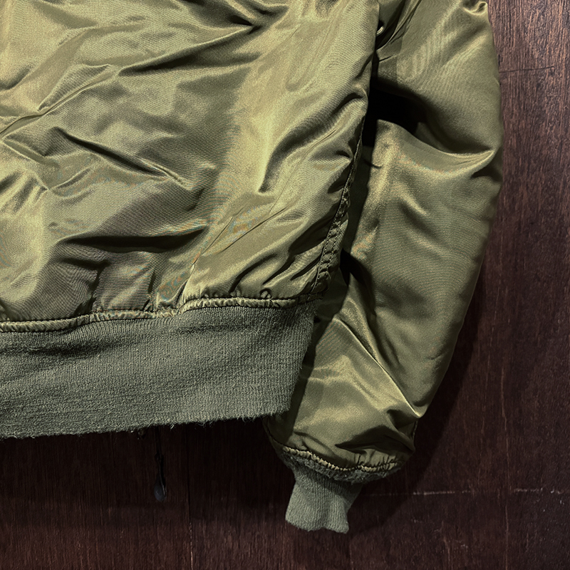 本品はUSAFのインターメディエイトゾーンセクションの地上勤務隊員向けとして支給されたフライトジャケットであるグランドクルーMA-1、中でも本品は非常に希少なリーフカラーが乗った独特のカーキカラーの66ナイロンツイルシェルにインナーは同じくカーキグリーンの波型キルテッドインナーが大きな特徴となっており、従来までのコクピット用に採用されていたインディアンオレンジインナーから変更された特異なディテールを持つMA-1となっています。