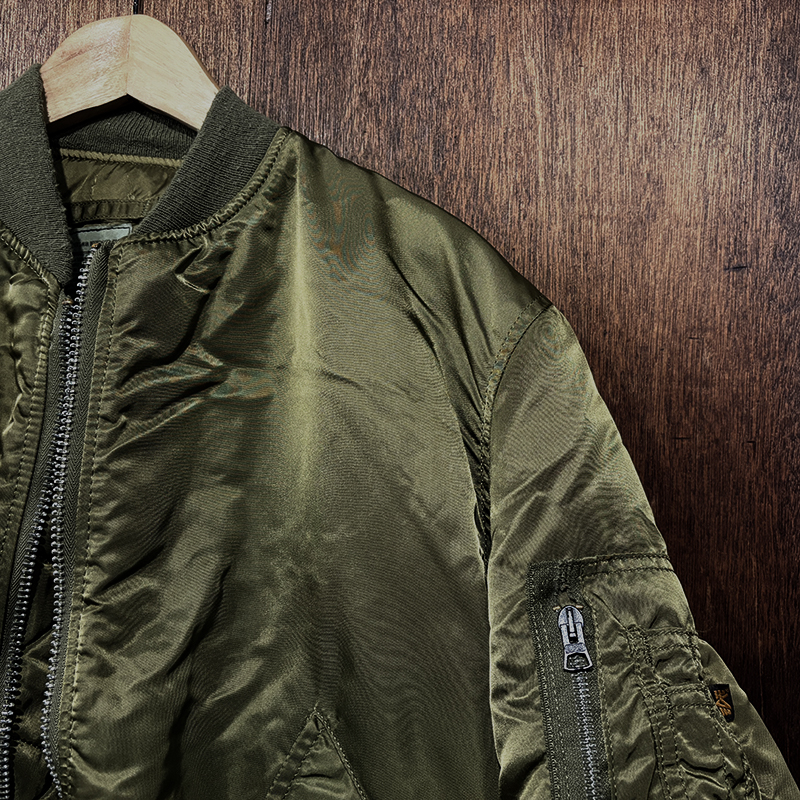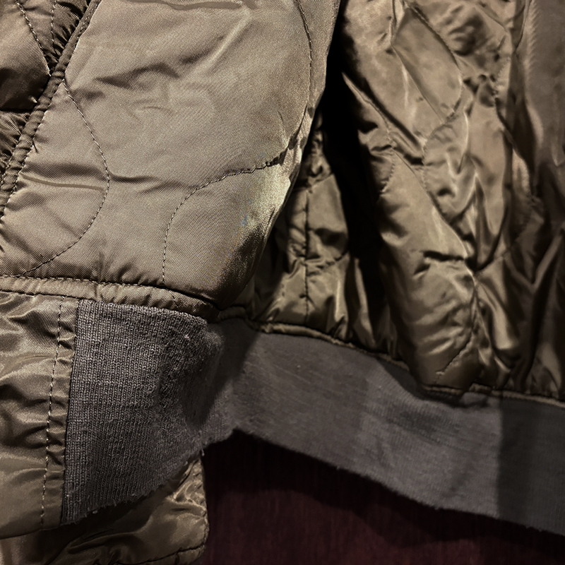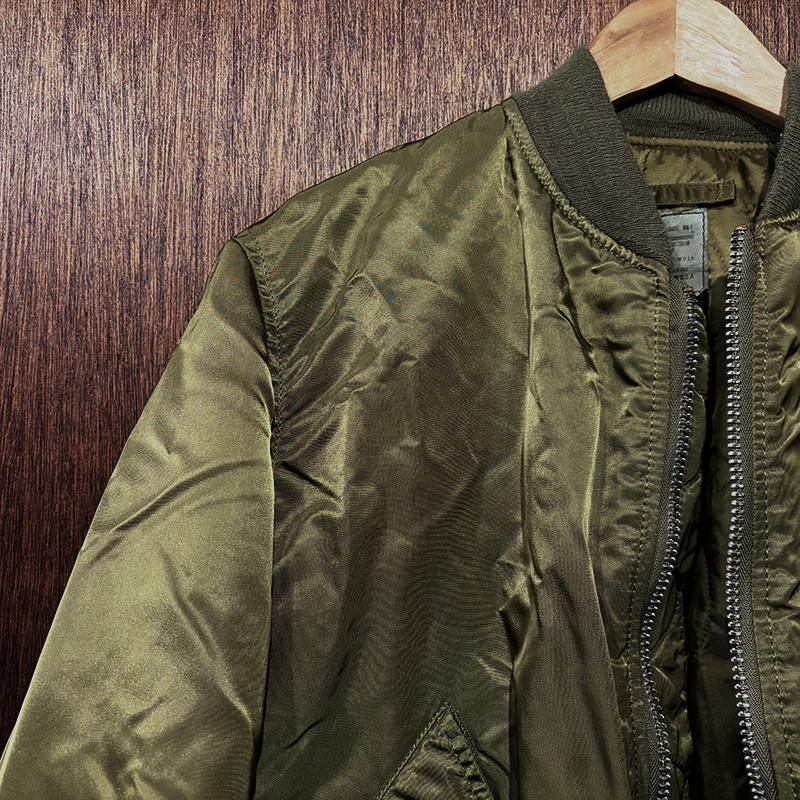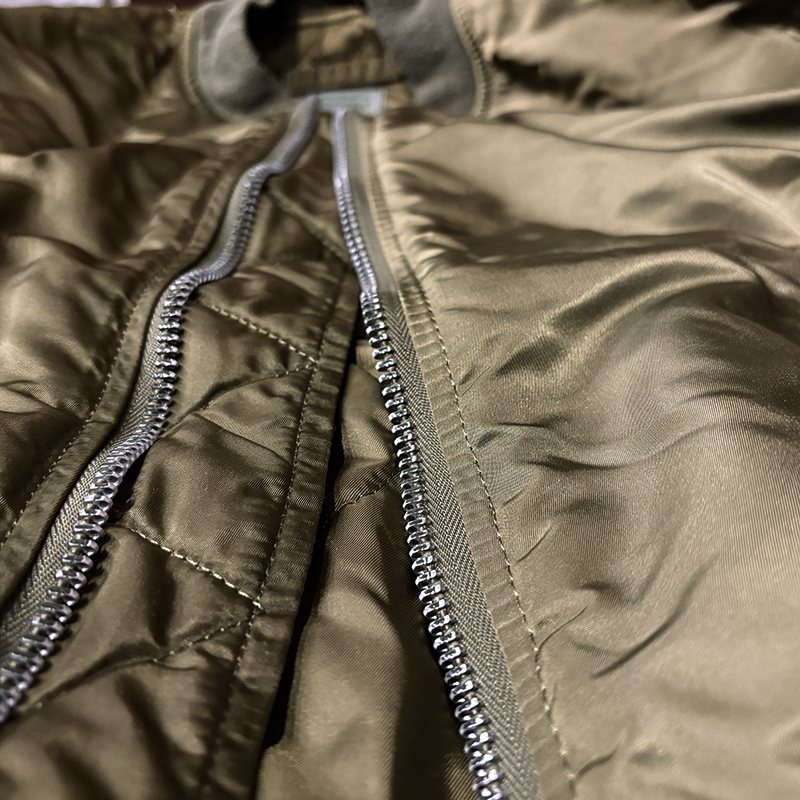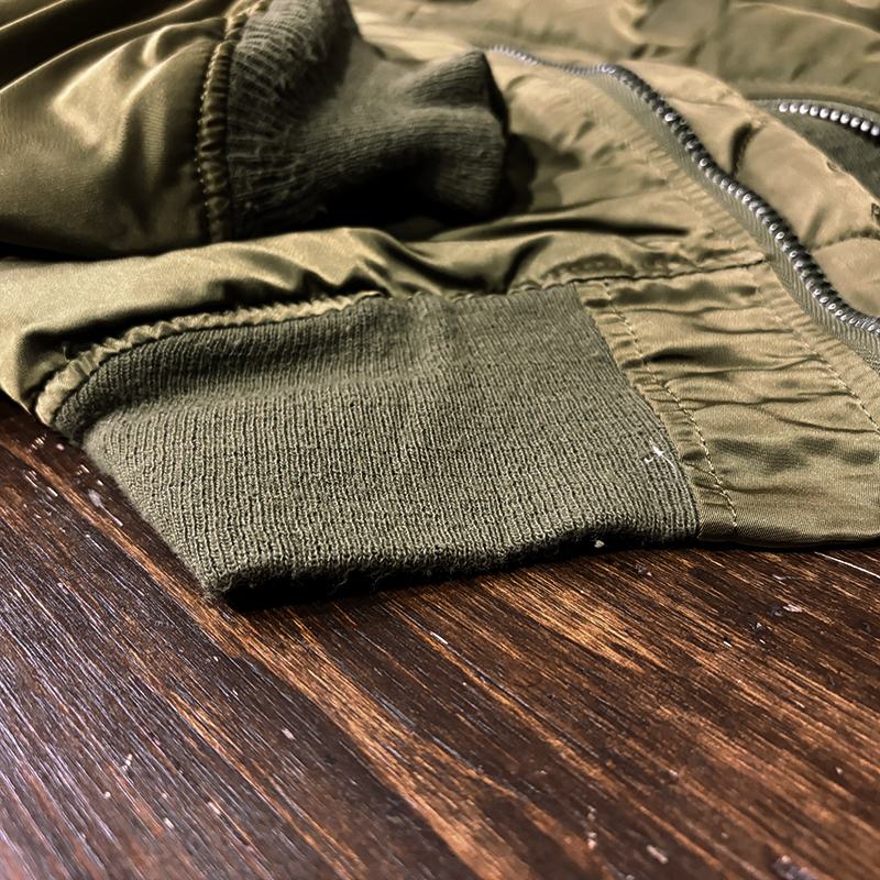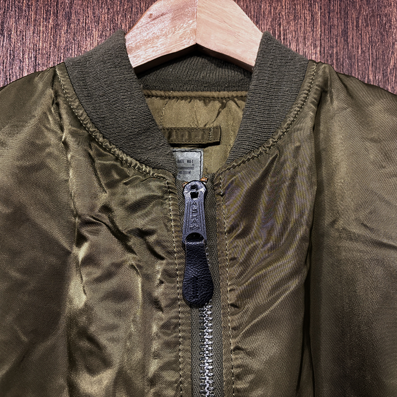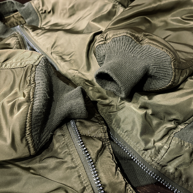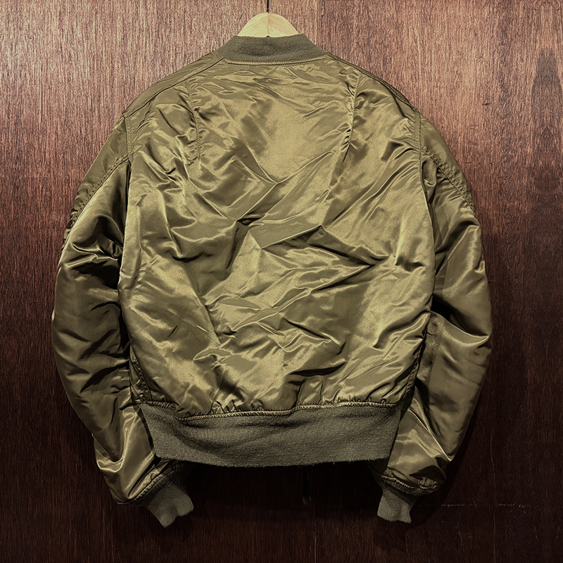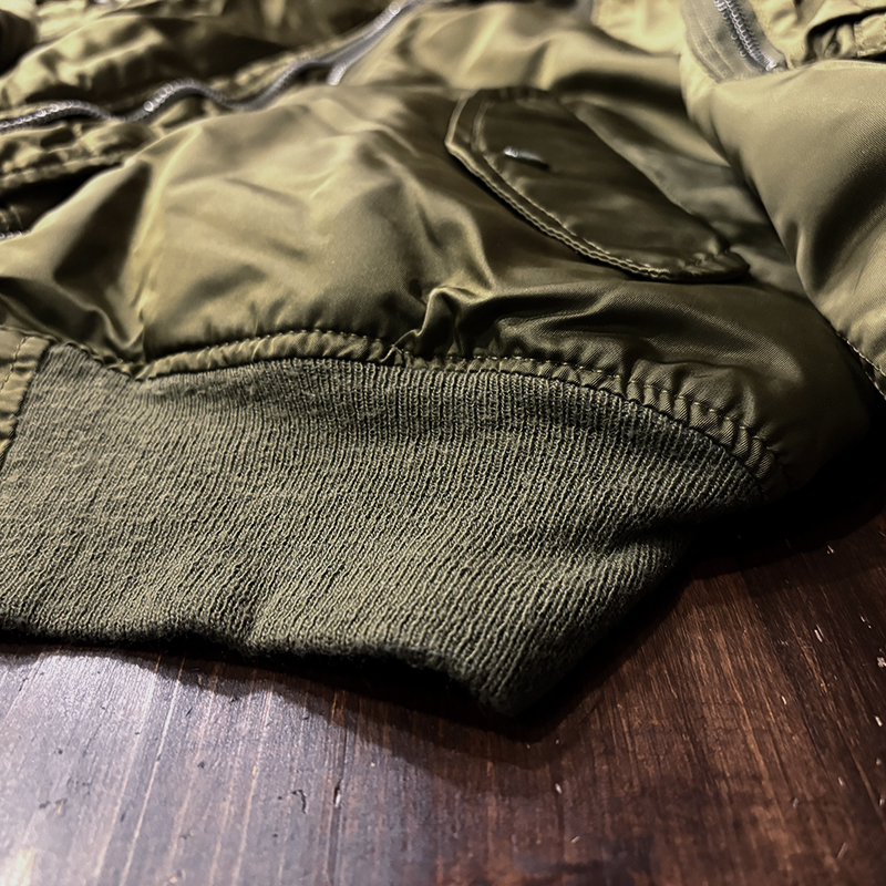 本品はUSAFのインターメディエイトゾーンセクションの地上勤務隊員向けとして支給されたフライトジャケットであるグランドクルーMA-1、中でも本品は非常に希少なリーフカラーが乗った独特のカーキカラーの66ナイロンツイルシェルにインナーは同じくカーキグリーンの波型キルテッドインナーが大きな特徴となっており、従来までのコクピット用に採用されていたインディアンオレンジインナーから変更された特異なディテールを持つMA-1となっています。