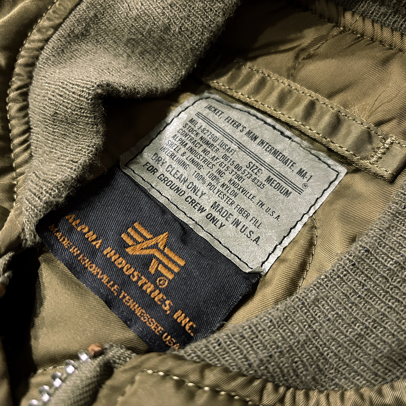 USAFインターメディエイトゾーン用、コントラクターとしても名門のアルファ社のグランドクルーMA-1、モデルとしても希少ですがさらに数の少ないリーフカーキの独特の渋い色味が魅力のレアカラーでMADE IN USAの一着です、アウトドア、ライディング、タウンとあらゆるシーンに、是非ご検討ください。