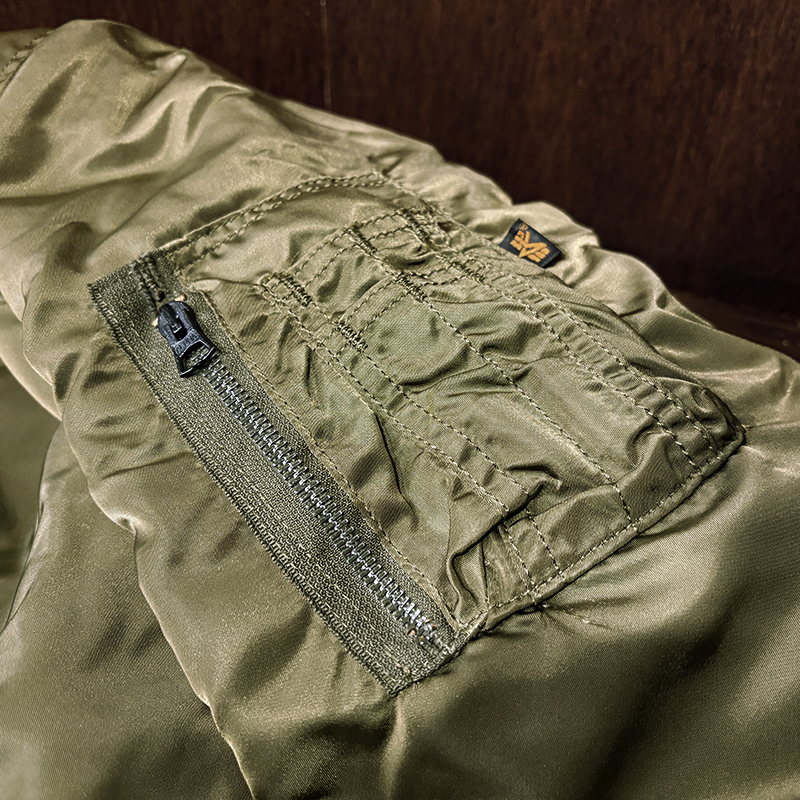 アウター側は従来までのMA-1のディテールを踏襲したものとなっており、襟袖裾のリブ仕様に、ブルーイングのフロントジッパー、そしてウィンドストームフラップ、アームにはシガレットポケット、フロントボディ左右のフラップハンドウォーマーポケットなど、後年のMA-1らしいディテールが盛り込まれています。