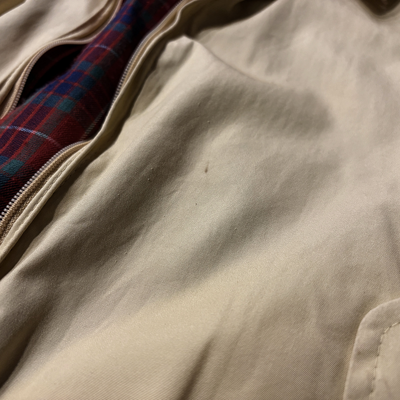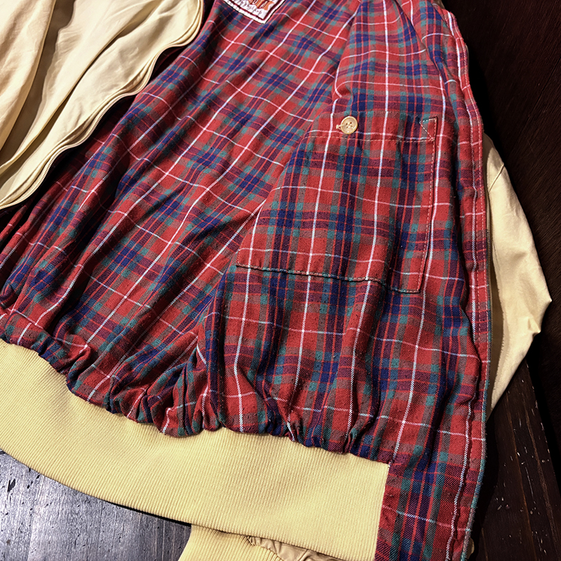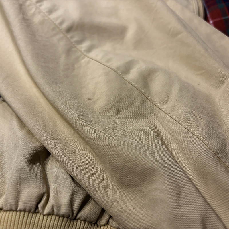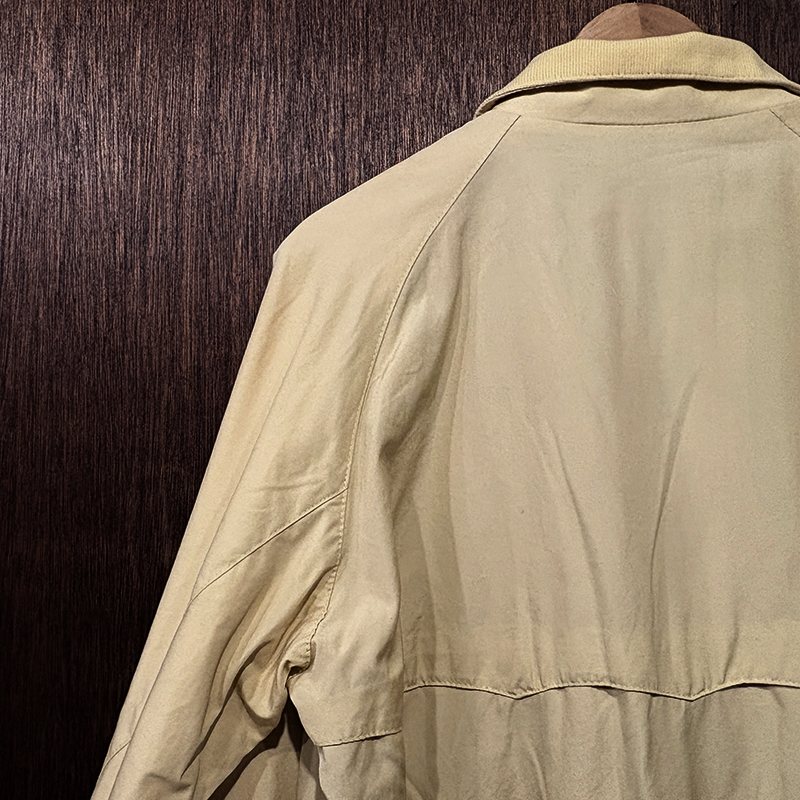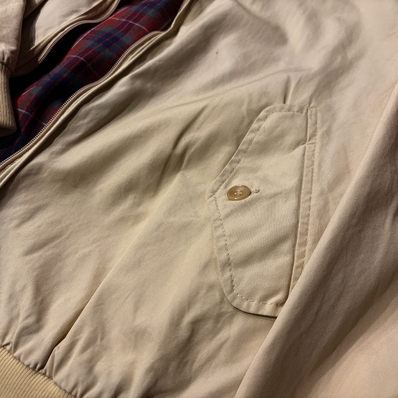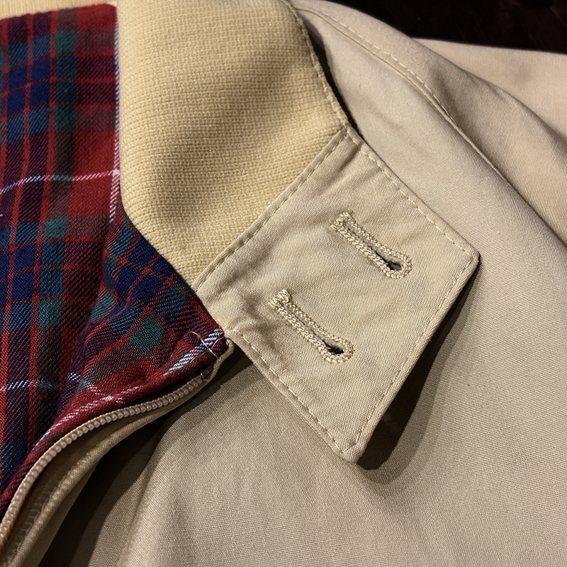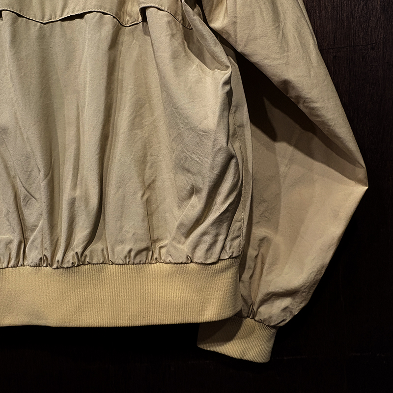 本品は元来ゴルフ等のシーン向けとしてデザインされたG9モデルのスポーツジャケットで、中でも貴重なビンテージバラクータ、フロントジップは独特の引き手を持つOptiジップ、アウターシェルは当時のシェルらしいコットン100%のシャリ感のある軽快な仕様で独特の生地目の詰まったマテリアルが大変良い風合いの一着となっています。