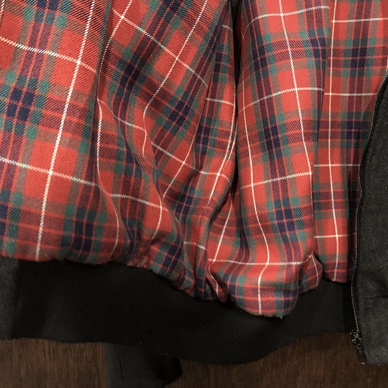 カラーは落ち着いたチャコールのダークグレイカラーで落ち着いた印象、インナーは同社ハリントン定番のフレーザータータン、赤と濃緑の掛け合わせがアクセントとなっています。