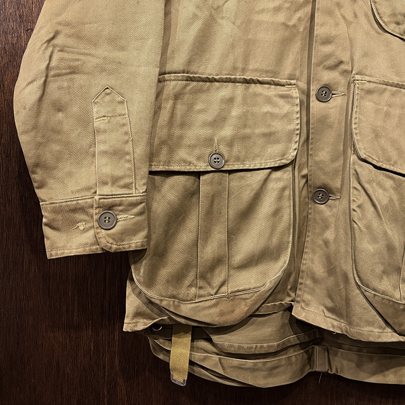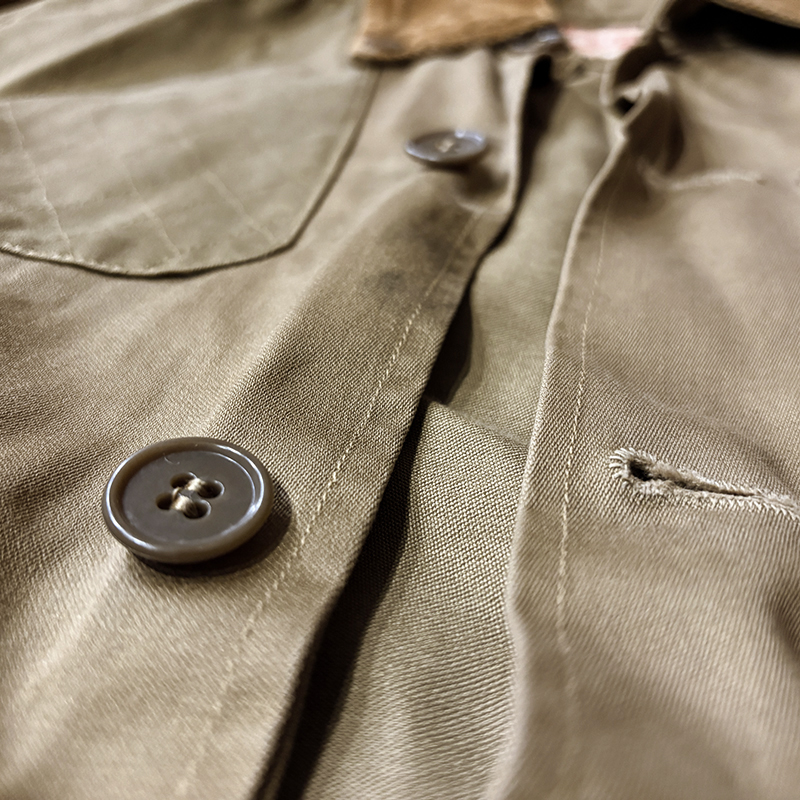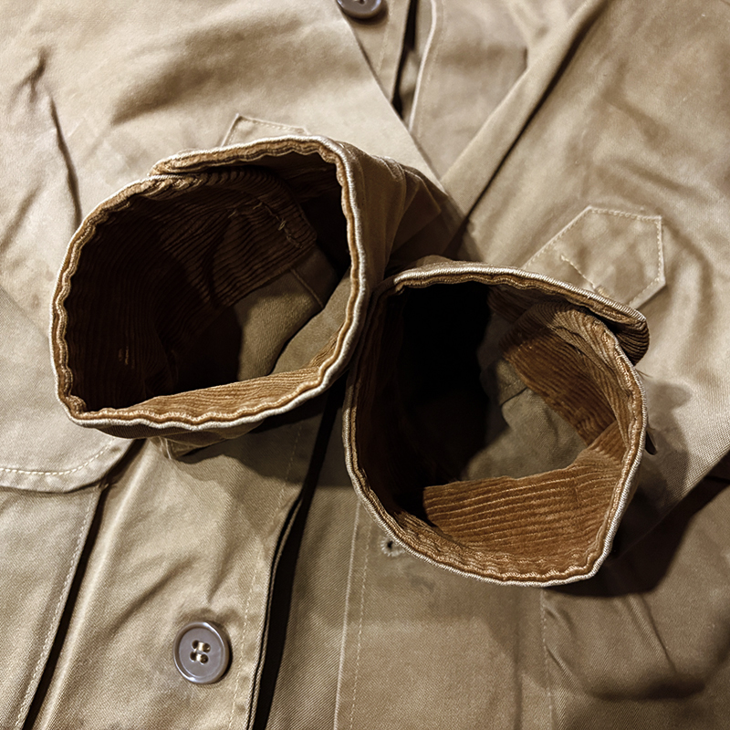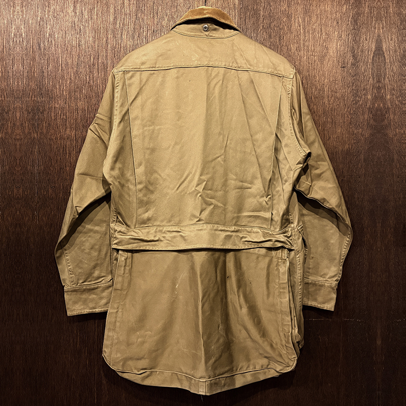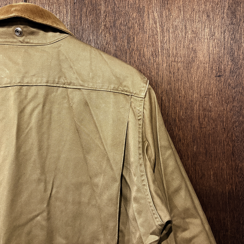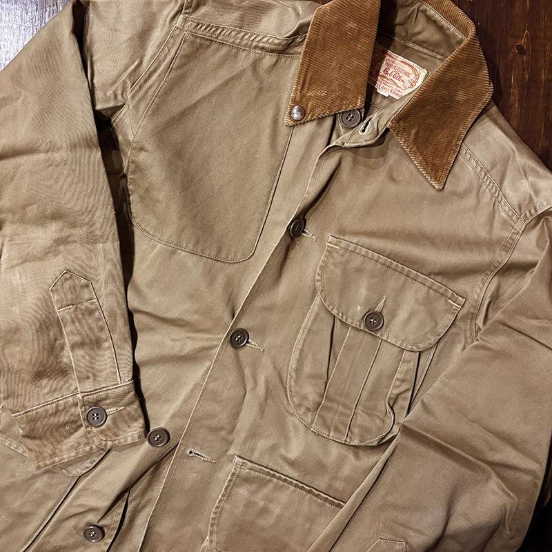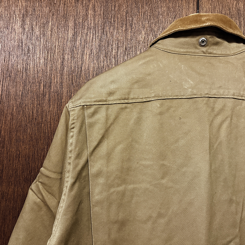 本品のハンティングジャケットは、おおよそ50年代当時のKing of Khaki とも称されたメーカーであるGaley&Lord’s社が供給していたKlondike(クロンダイク)コットンサテン生地を使用した非常に凝った一着、肉厚なサテン生地は光沢感が感じられ、襟元はブラウンコーデュロイの切り替えし、ハンティングディテールとしてのマチ付きのポケットはじめ、バックの大容量のサイドのTalonジッパー付属のゲームポケット、胸元にはガンパッチがつき、当時らしいディテールが詰まった重厚な一着です。
