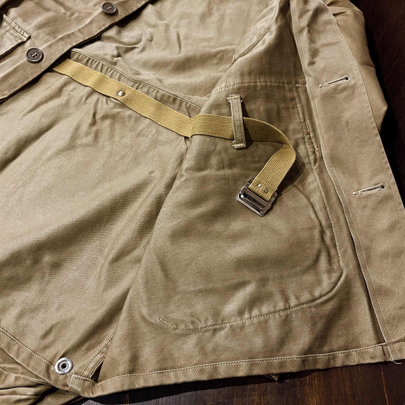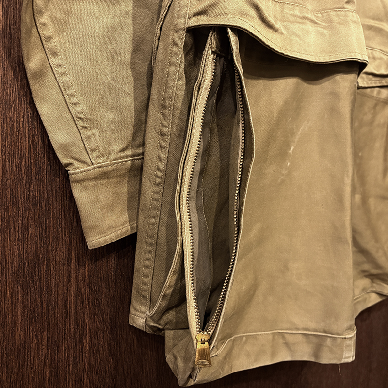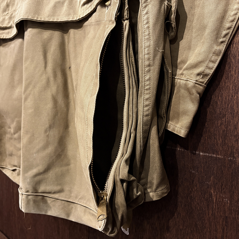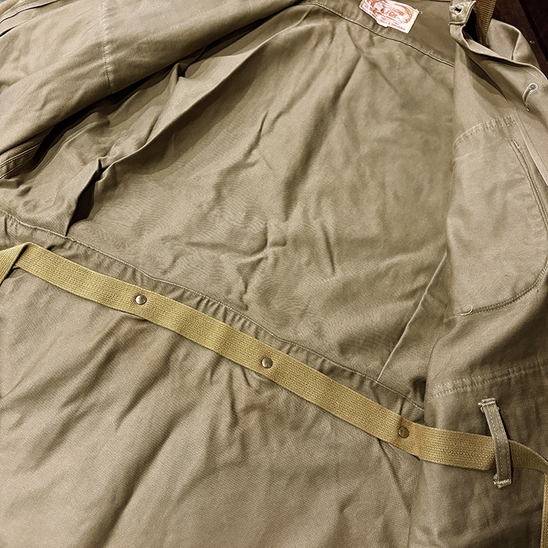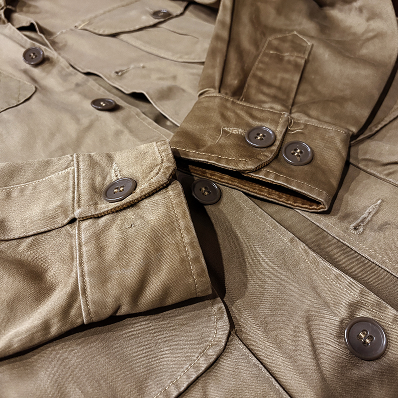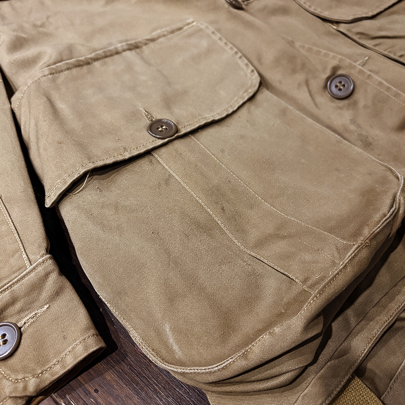 本品のハンティングジャケットは、おおよそ50年代当時のKing of Khaki とも称されたメーカーであるGaley&Lord’s社が供給していたKlondike(クロンダイク)コットンサテン生地を使用した非常に凝った一着、肉厚なサテン生地は光沢感が感じられ、襟元はブラウンコーデュロイの切り替えし、ハンティングディテールとしてのマチ付きのポケットはじめ、バックの大容量のサイドのTalonジッパー付属のゲームポケット、胸元にはガンパッチがつき、当時らしいディテールが詰まった重厚な一着です。
