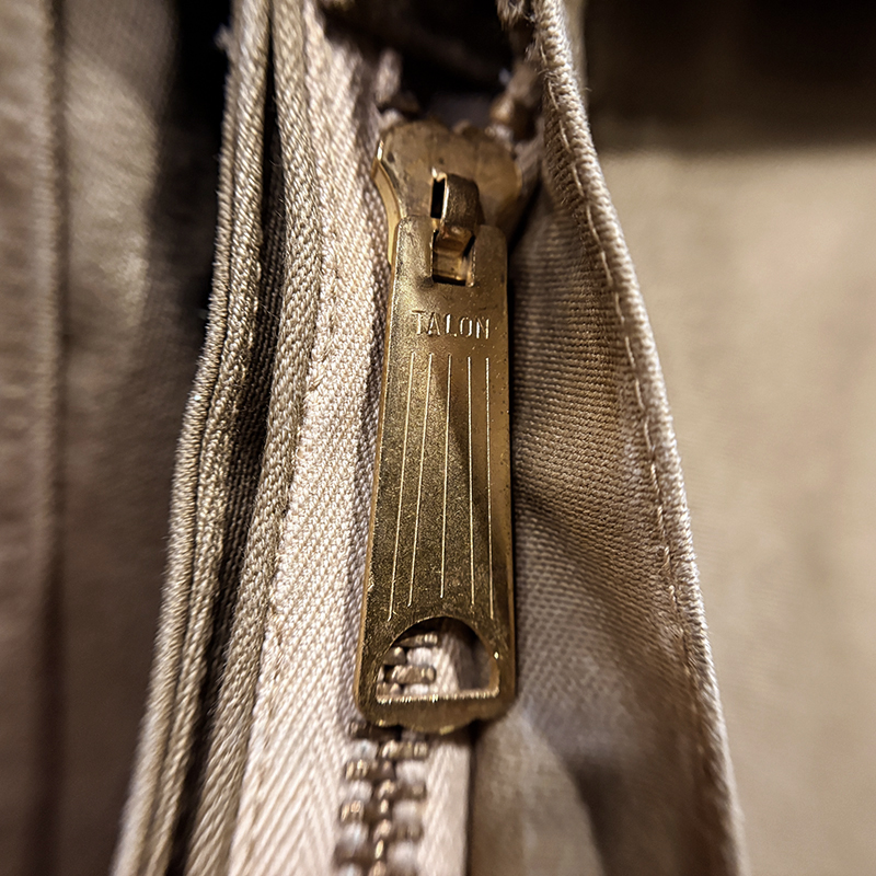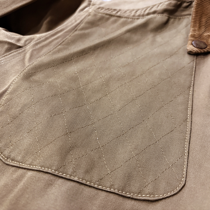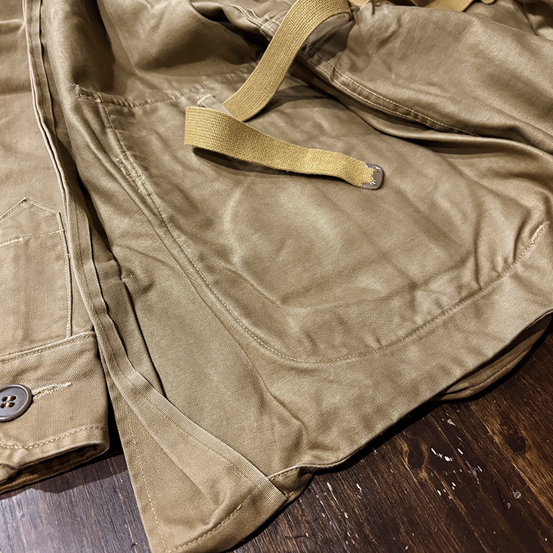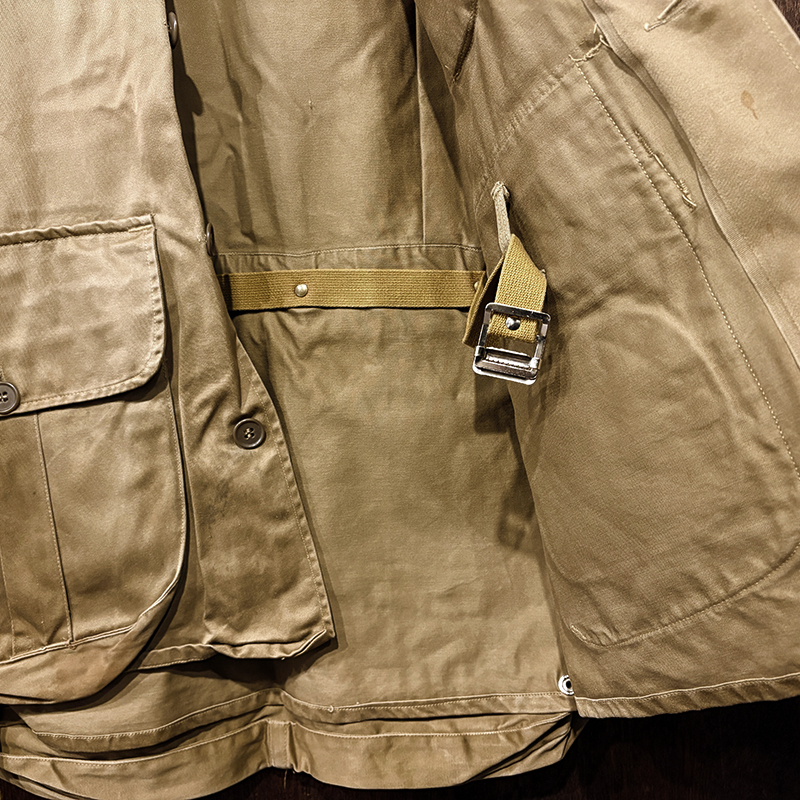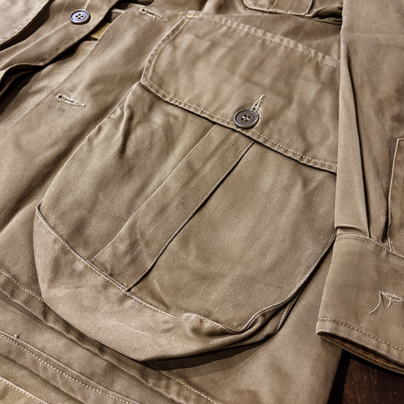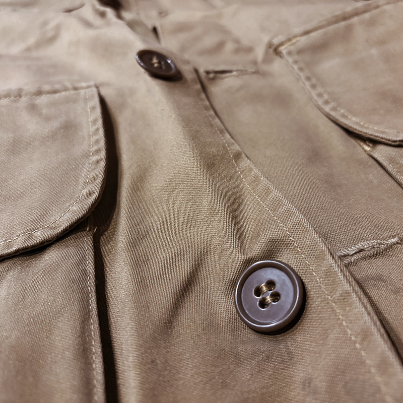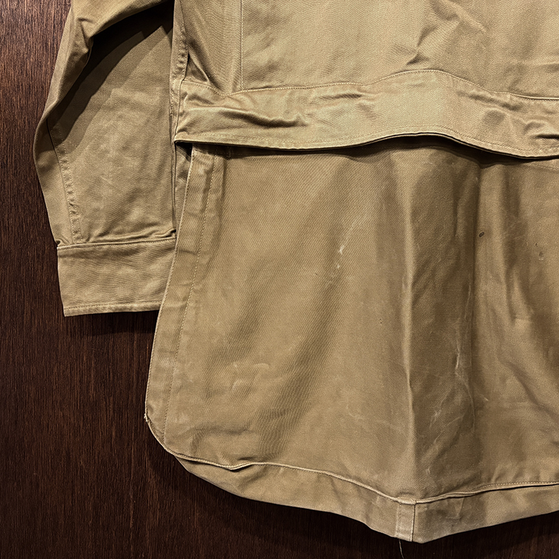 本品のハンティングジャケットは、おおよそ50年代当時のKing of Khaki とも称されたメーカーであるGaley&Lord’s社が供給していたKlondike(クロンダイク)コットンサテン生地を使用した非常に凝った一着、肉厚なサテン生地は光沢感が感じられ、襟元はブラウンコーデュロイの切り替えし、ハンティングディテールとしてのマチ付きのポケットはじめ、バックの大容量のサイドのTalonジッパー付属のゲームポケット、胸元にはガンパッチがつき、当時らしいディテールが詰まった重厚な一着です。