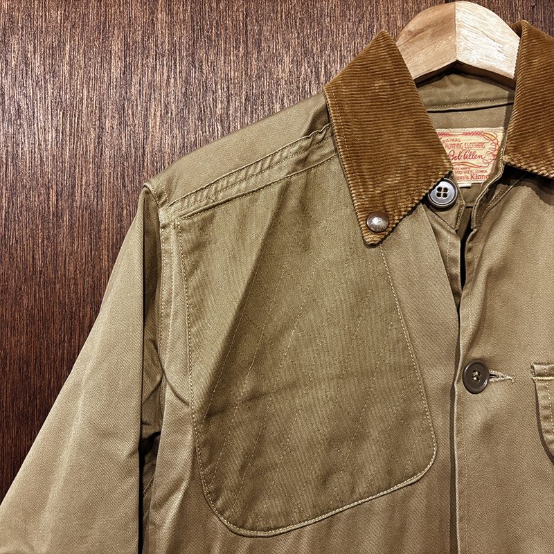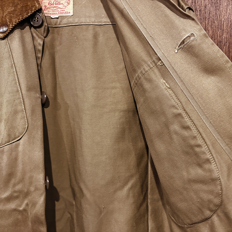 Bob Allenのおおよそ50sに展開したコットンサテンマテリアルのビンテージハンティングジャケット、肉厚なカーキブラウンカラーのGaley&Lord’sによるKlondikeサテンが非常に質感が良いクオリティの高い一着です、アウトドアシーンはもちろんタウンユースにも、是非ご検討ください。