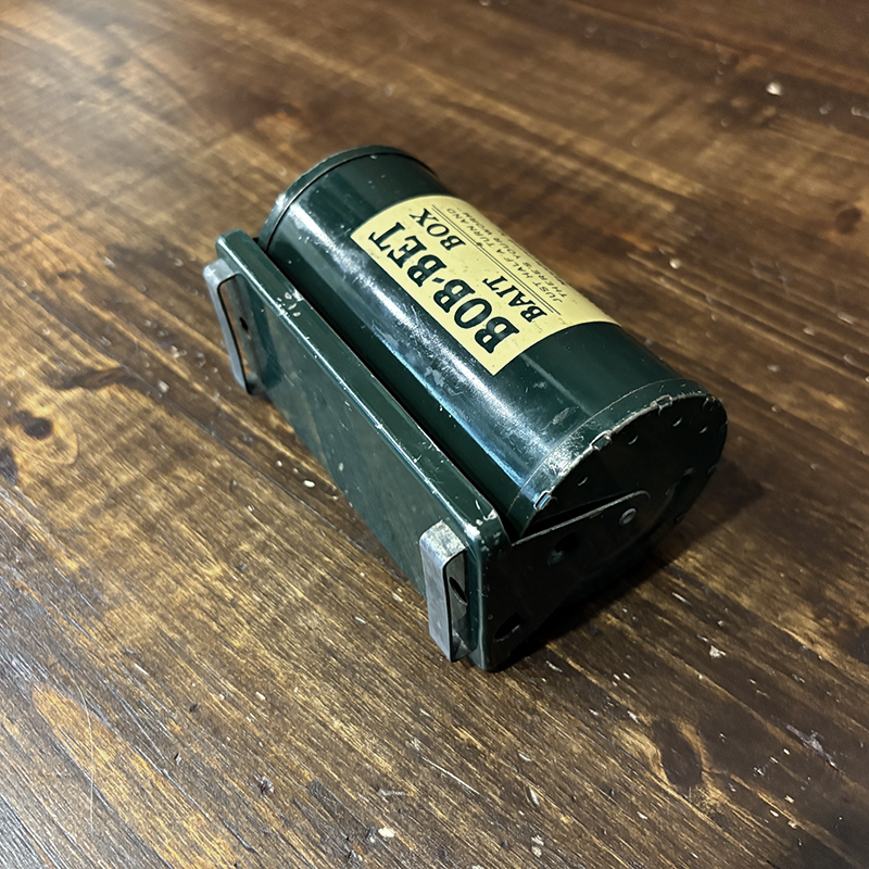 本品はBob-Betメイクの小ぶりな腰位置のベルト箇所に取り付けて使用する回転式ドラムフォルムのベイトボックス、いわゆる当時の餌入れとして販売されていたオールメタル製の一品です。
