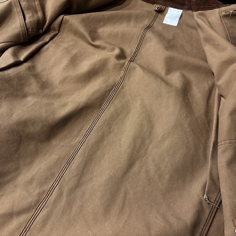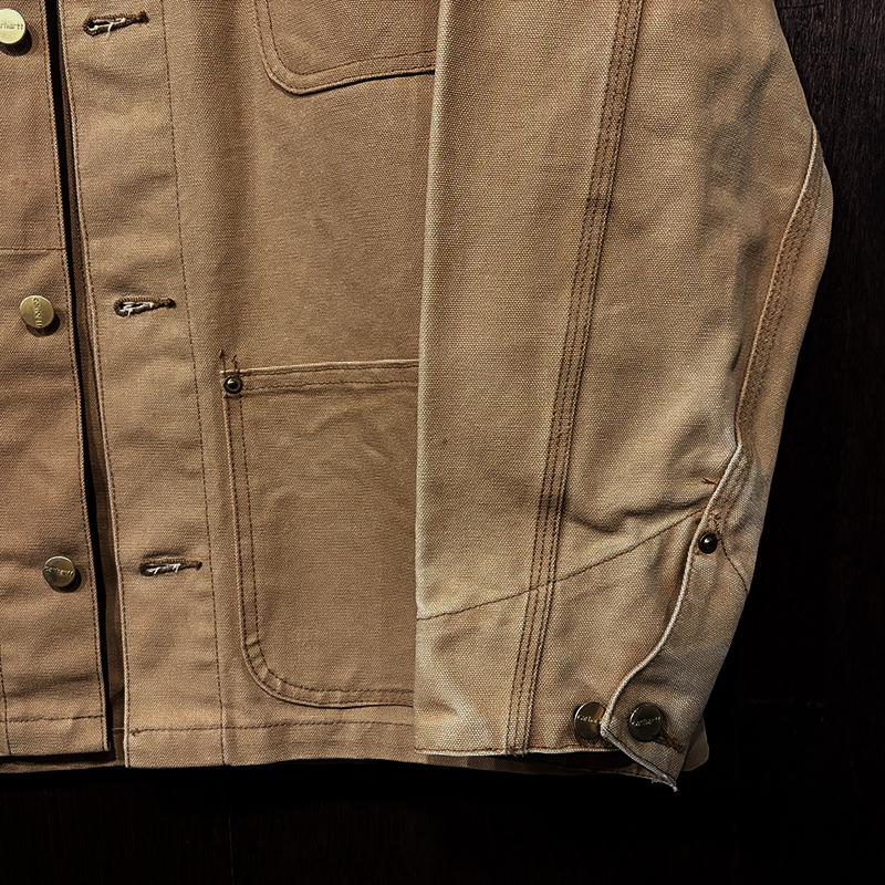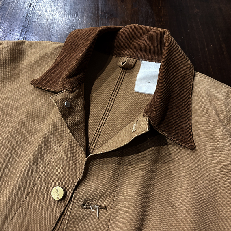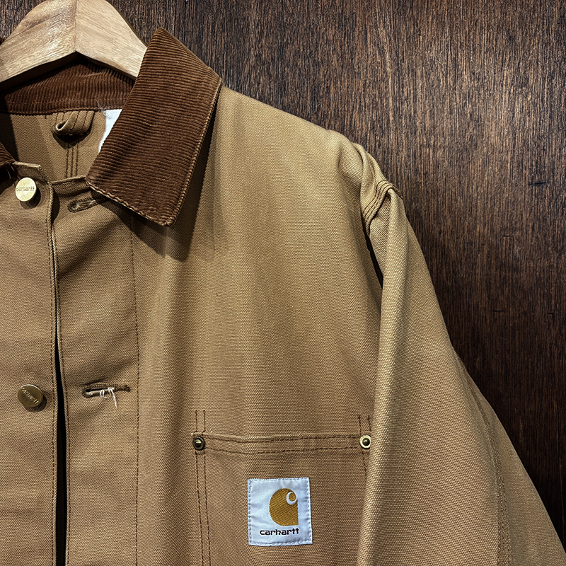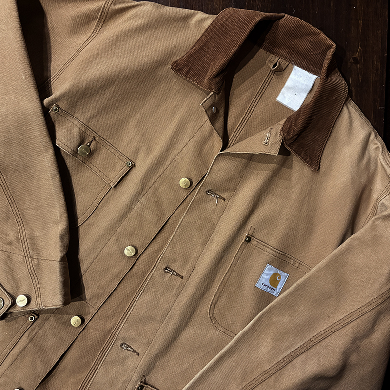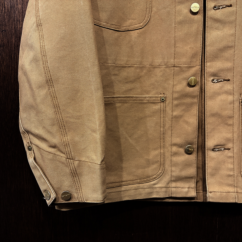 本品はカーハート社のダックキャンバス仕様のカバーオールジャケット、同社の定番的なモデルのひとつで、チョアコートとも称されるアウトドアワークに適した堅牢なつくりで非常に重厚なジャケットです。