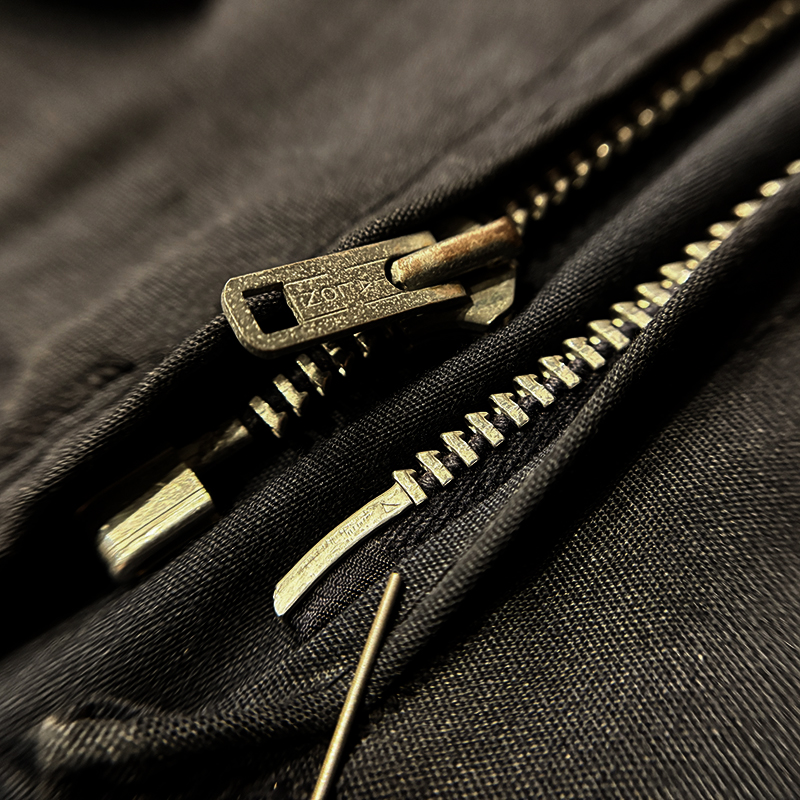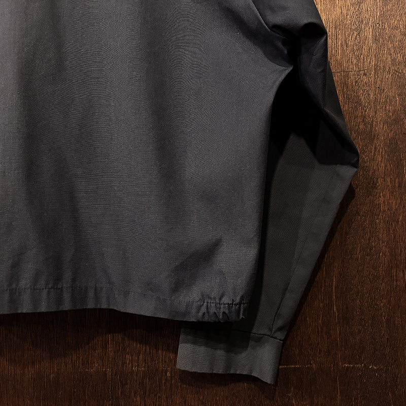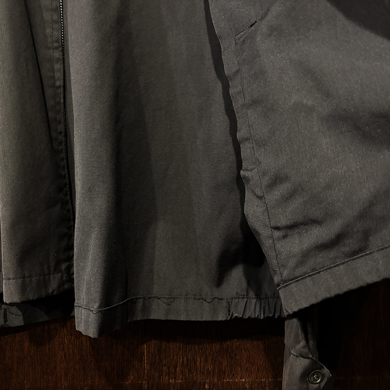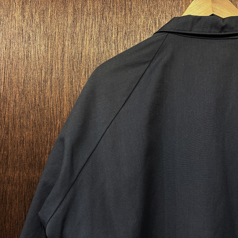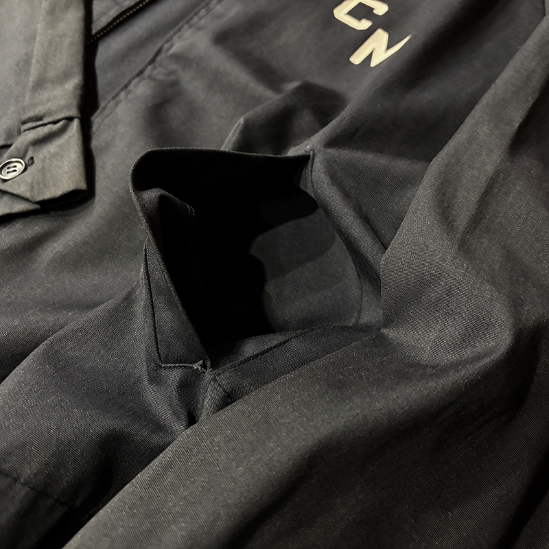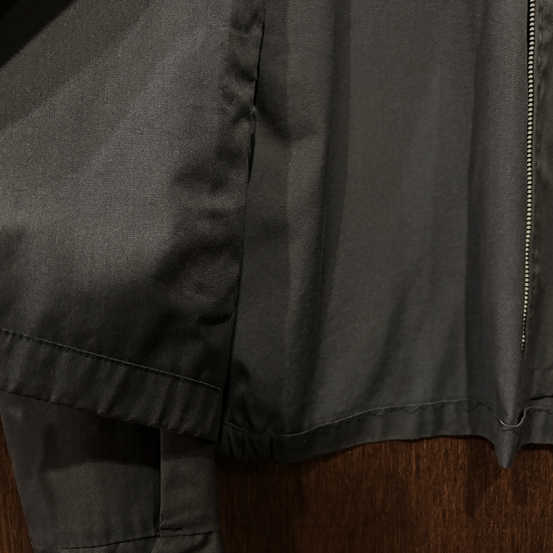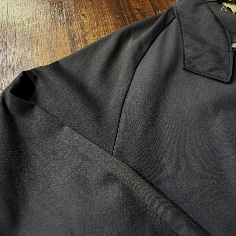 フロントには左右にハンドウォーマースリットポケット、フロントジッパーは当時らしいブラスの棒タロンジップ、首元にスマートに覆う犬の耳の形状から呼ばれるドッグイヤーカラー、袖はボタンカフ、袖付けは動きやすいラグランスリーブ、往年のクラシカルなスイングトップスタイルを取り入れた定番的なデザインとなっています。