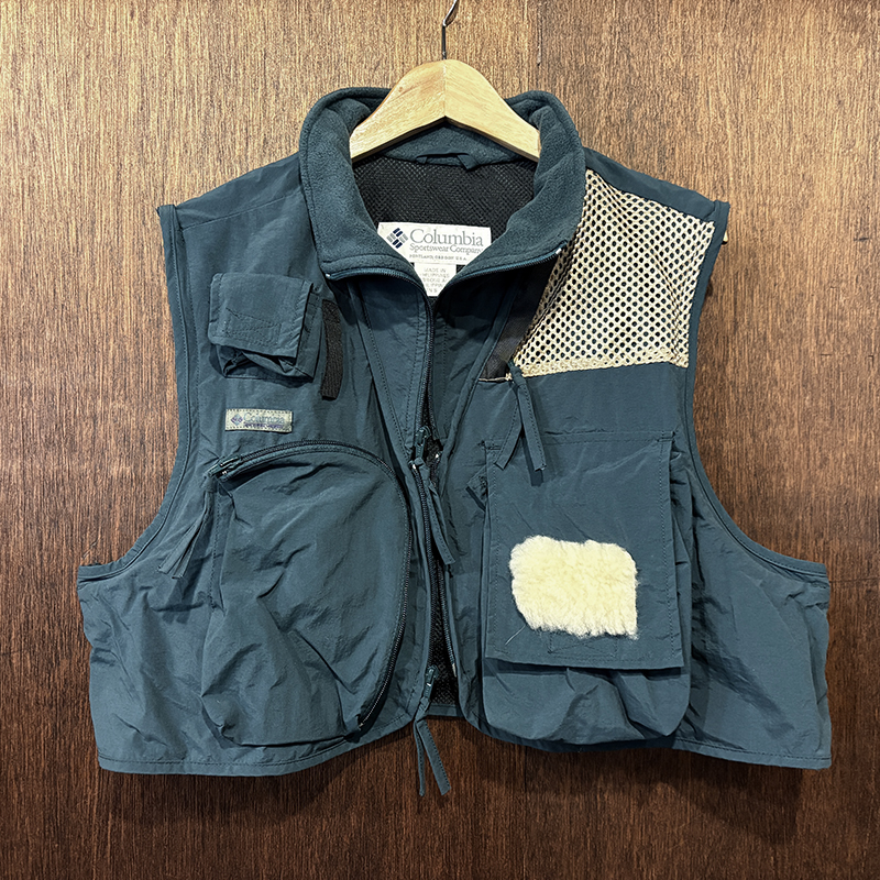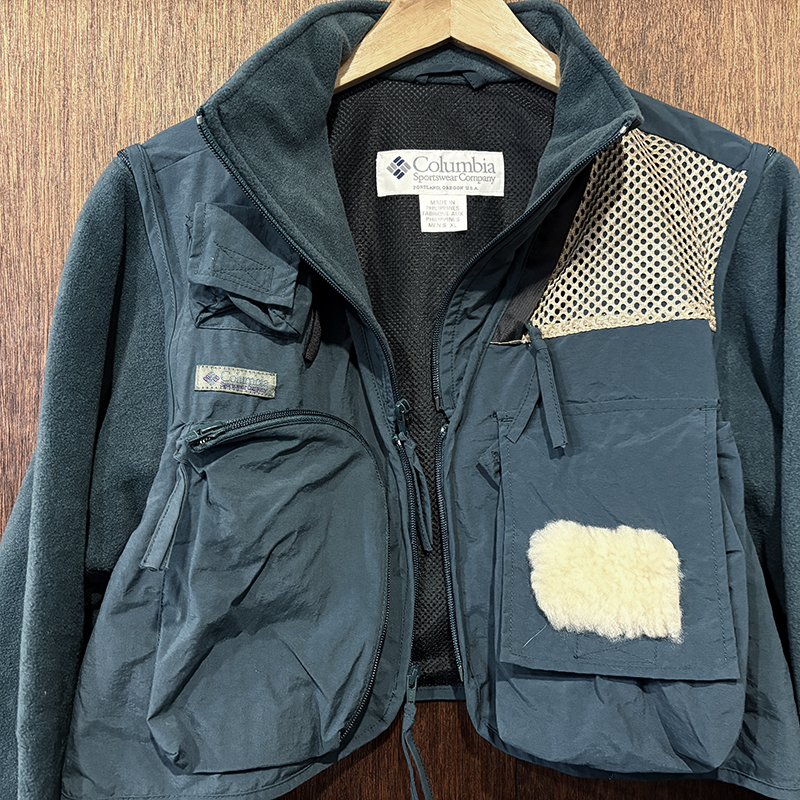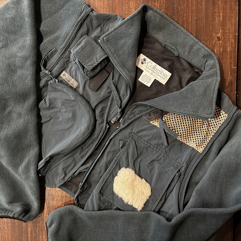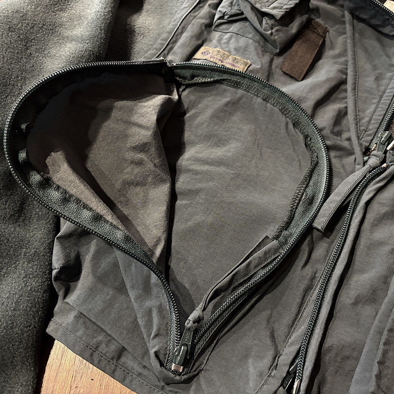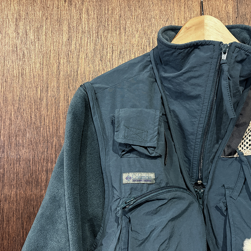 大変希少な仕様のコロンビアスポーツウェア デタッチャブルフィッシングベストジャケット、ウェーディング仕様のショート丈でフリーススリーブの脱着やベストの独特のジッパー使いなど個性的な非常に希少なスペックの一着です、フライフィッシング、ルアー、バスフローター等、あらゆるフィッシングシーンに、是非ご検討ください。