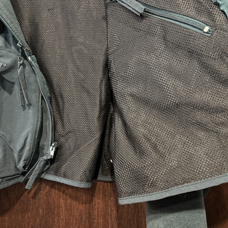 ベストには左右に大小の仕様違いのポケット収納が配され、左胸にはメッシュスリットポケット、下段にはフライドライヤームートン付きのフラップポケット、右上段にもフラップアクセサリーポケットやロッドホルダーベルクロ、下段にはジッパー開閉のラージサイズポケット、背後にも大きなジッパー開閉のストックポケットやネットホルダーようループが備わり、インナー側も総メッシュ仕様でジッパー開閉でさまざまな多くのものを収納できるため、機能性にも大変長けたスペックとなっています。