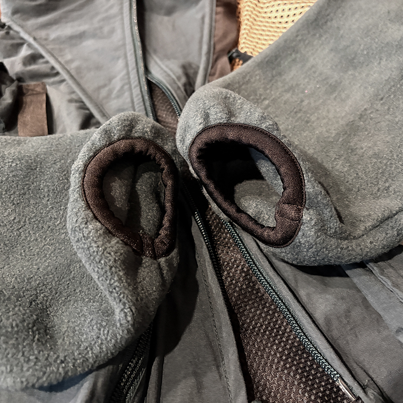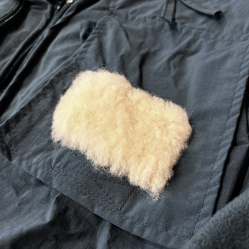 デタッチャブル仕様のベストジャケットとなっているため、ジッパー取り外し可能な袖のフリースは通常より長めのサイズで設定されており、袖先はハイピング処理で当時らしいディテールとなっています。