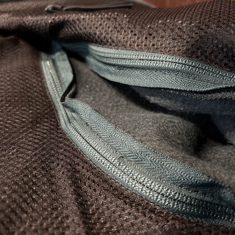 ボディのベストはジャケットと併用するため、ネックがデザインされており、ジップによって大きく開閉が可能、下段にもボディフロントのジッパーがありフルオープンにもできる独特のジッパー使いでショート丈のウェーディング対応のとなっています。