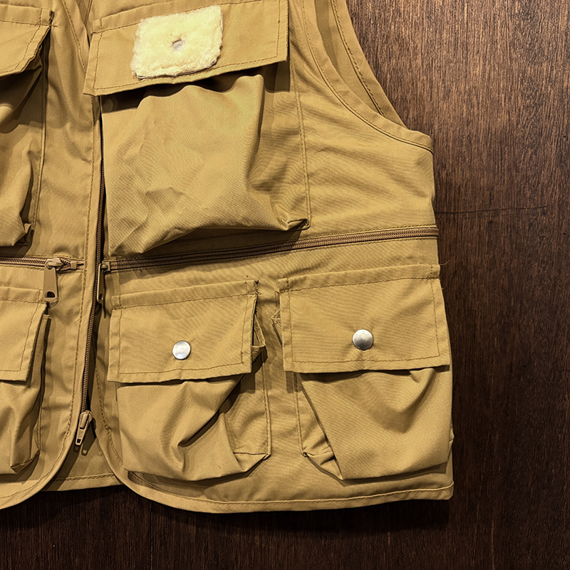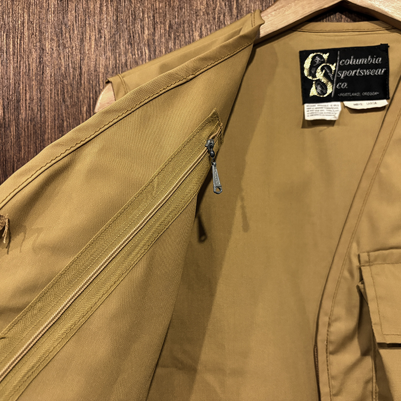 本品はコロンビアらしいデザインが良いビンテージフィッシングベスト、古い初期ディティールが特徴の個体となっており、生地は当時らしい速乾性のある混紡素材でカラーは希少なキャメルオーカーカラー、前身頃には多数のポケットがつき、収納性も高く、後身頃は大きなストックポケットがあり、様々な荷物を収納することができます。
