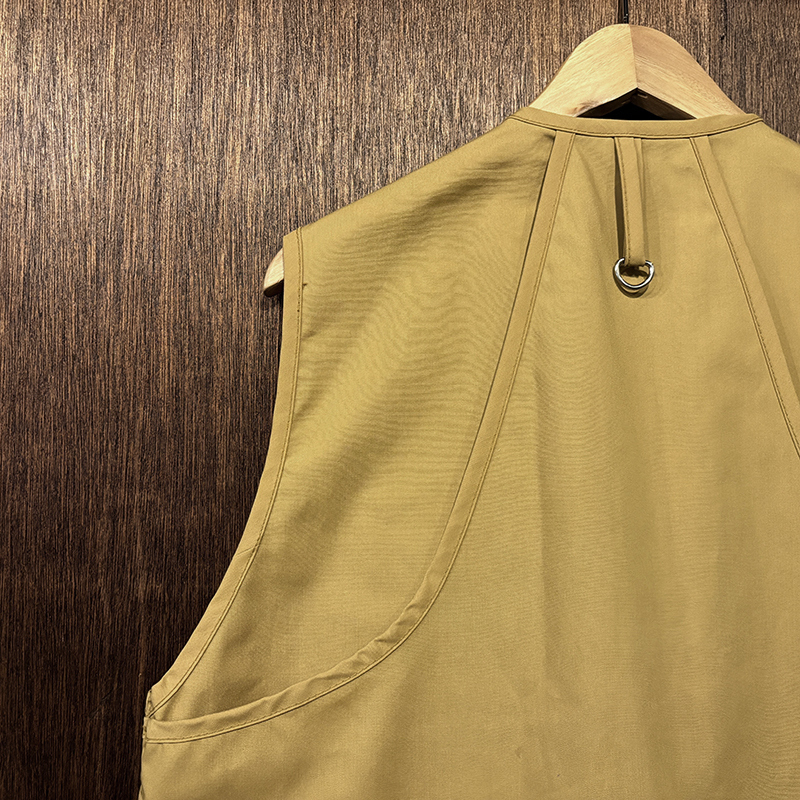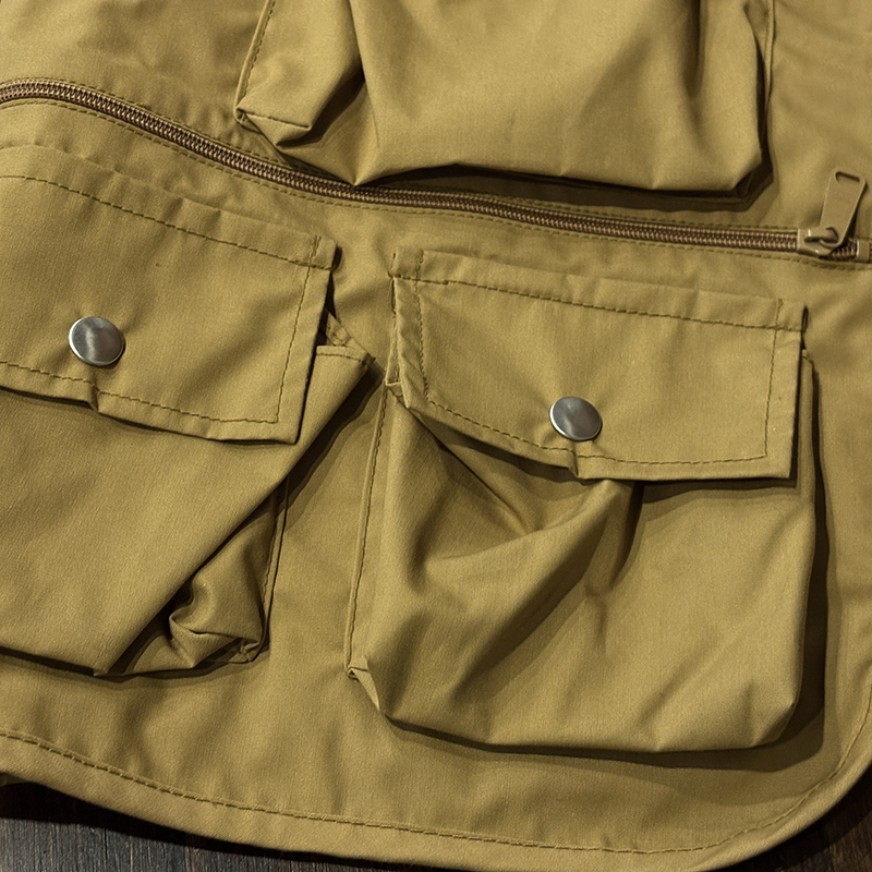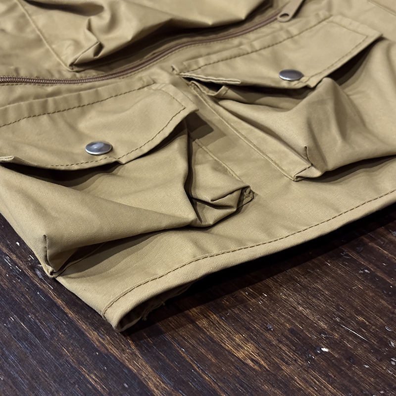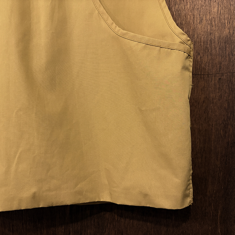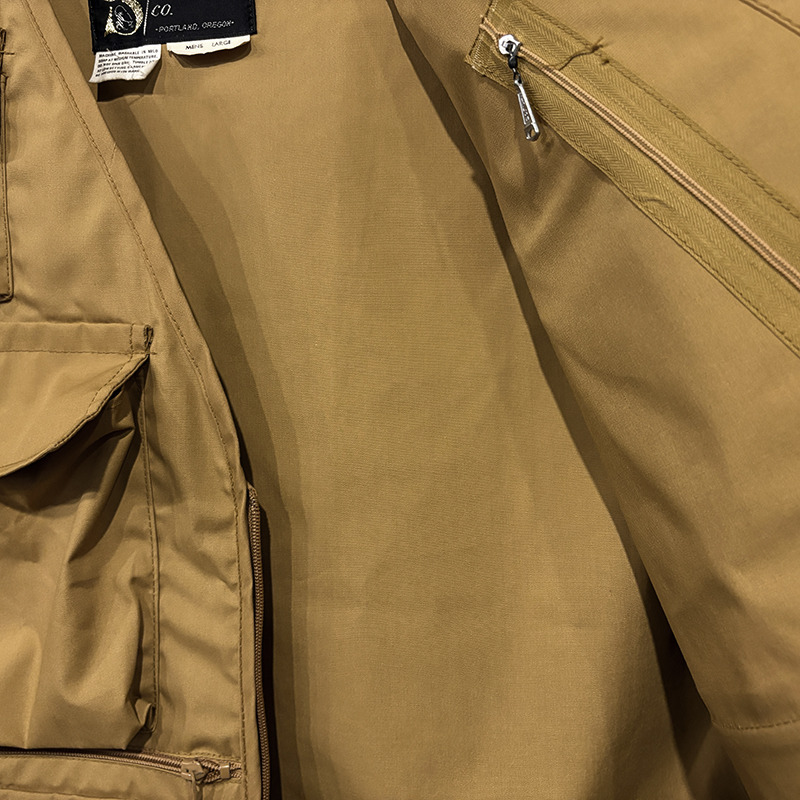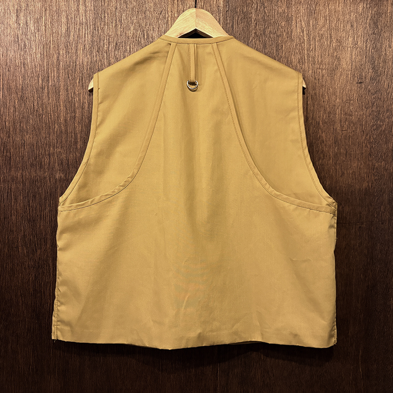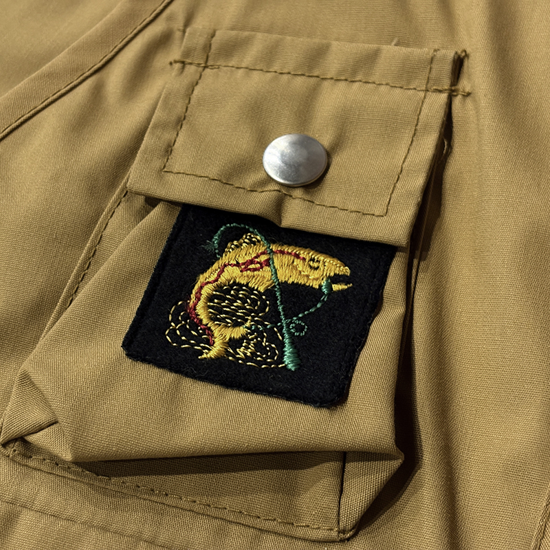 フロントのチェストポケットには個性的な同社らしさが出た当時オリジナルのトラウトワッペンが縫い付けられており、ポケットフラップ箇所にはムートンのフライドライヤーパッチ、アクセサリーツールホルダーDリング、バック側にはクラシカルなネットリリーサーDリング、ジッパーなどもティアドロップ型であったりと、当時のフィッシングベストとしての良いディテールが備わった一着です。
