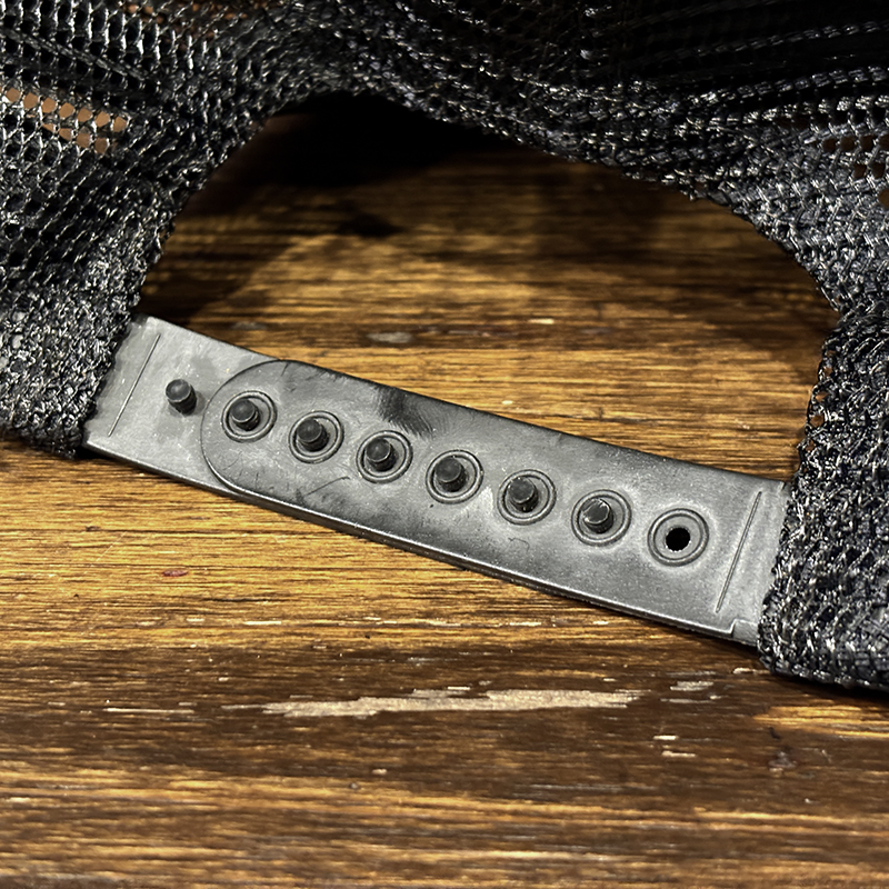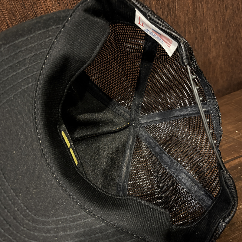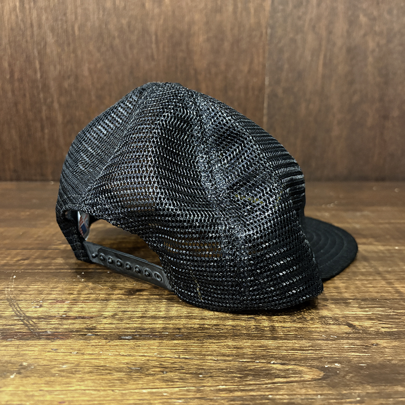 メッシュ生地は堅牢な編みのナイロン製、後方には一般的なメッシュキャップにあるナイロンストラップのスナップバック仕様でMADE IN USAの刻印あり、インナータグも当時らしいトリコロールプリントのMADE IN USAの表記があるタグしっかりと残り、フリーサイズで幅広いサイズに対応します。