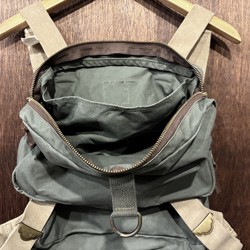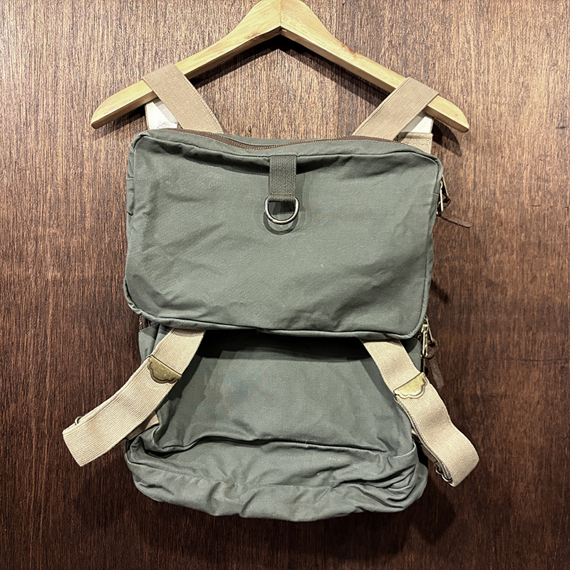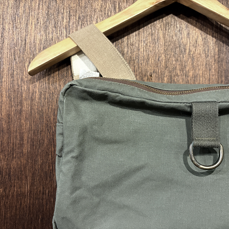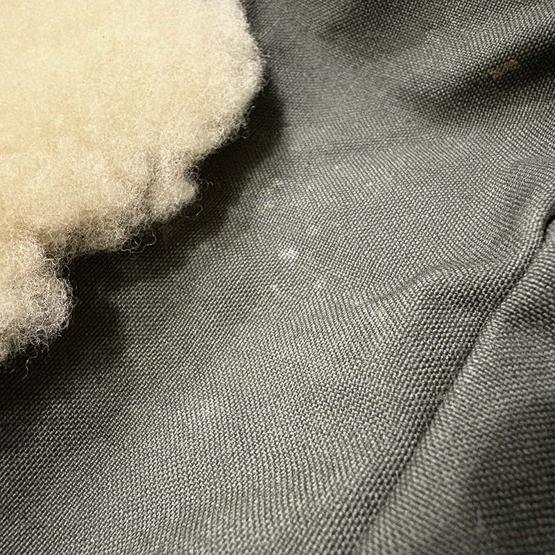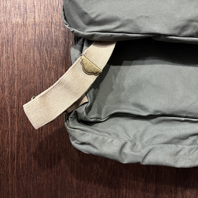 状態は経年の軽度な使用と主に保管による生地の細かなシミやくすみ汚れ、ブラス表面の金属パーツの部分的な酸化変色やくすみ、ショルダーベルトなどのストッパー跡などが見られますが、古いオールドモデルですが極めて使用感自体は浅く、ドライフィニッシュのコットンクロスはしっかりとした張りのある生地感を維持しており、各部の細かなディテールも大変良好、欠損しやすいムートンフライドライヤーも極めてクリーンな状態でトータルとしてもミントなコンディションを維持した一着です。