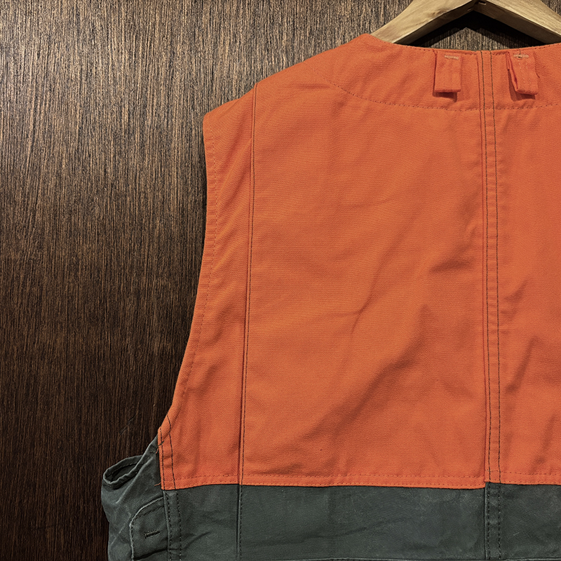 本品はフィルソン独特のマテリアルである極めて強靭なドライワックスフィニッシュのヘビーコットンクロスを用いたアップランドハーフムーンハンティングベスト、最大の特徴な身頃上下で切り返されたブレイズオレンジとオリーブドラブの2トーン仕様となっているところ、ハンティングの際に誤射を未然に防ぐなど、その鮮やかなオレンジが設定されたハンティングらしい本格的な実践用ベストとなっています。