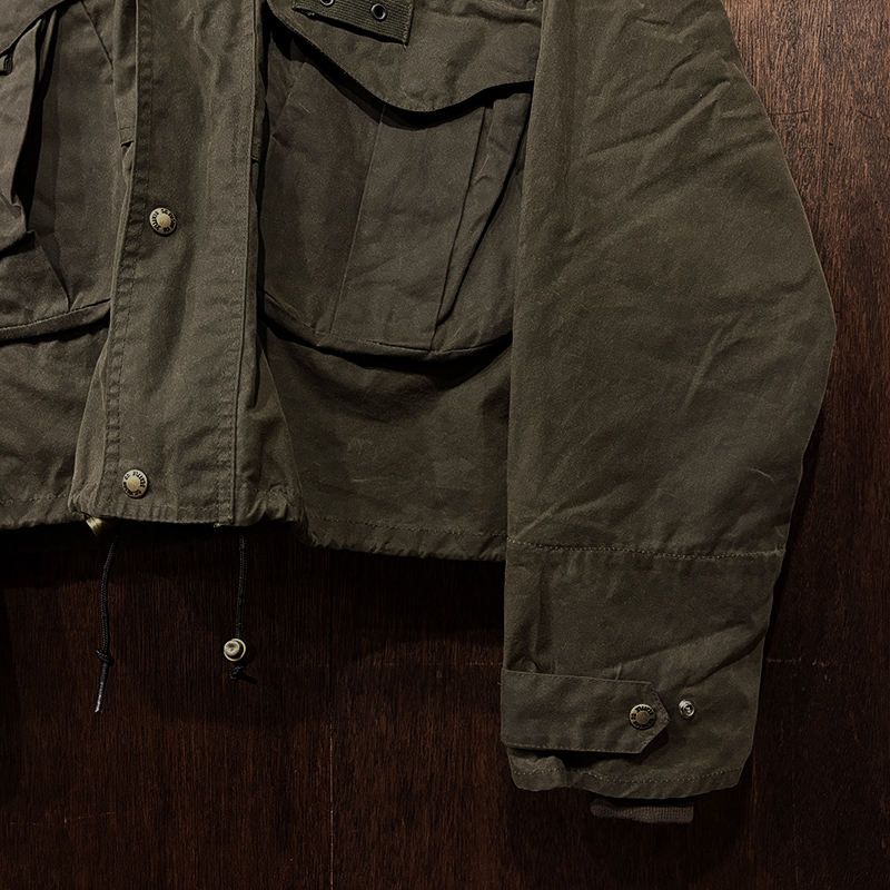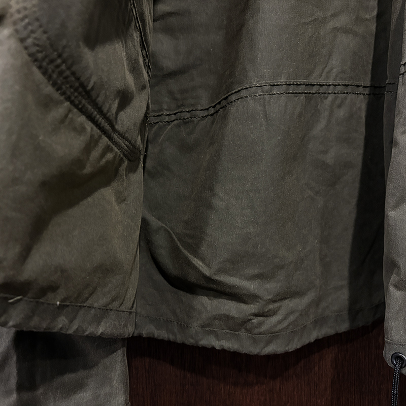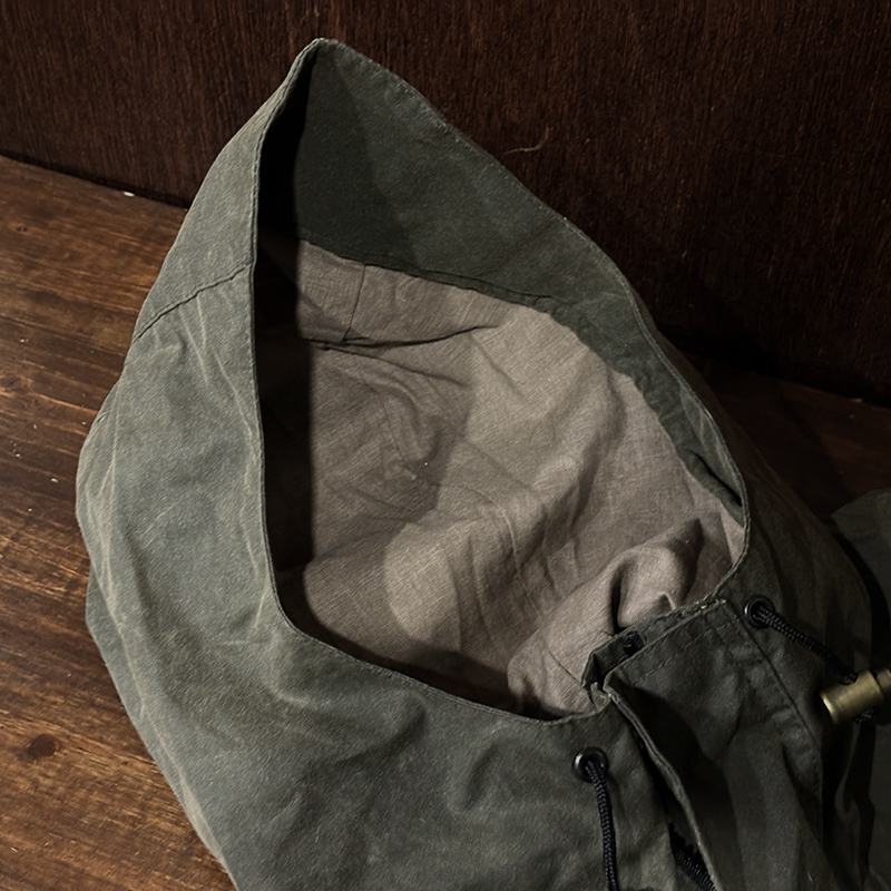 本品は着丈が大変短く、身幅からアームホールにかけてはなだらかな余裕のあるシルエットを持つ非常にワイドな設計のドルマンスリーブスタイル、インナーにベストやその他の防寒着をしっかりとレイヤリングでき、大きめのフードと深い立襟によりワッチやキャップ等と共に被ることができる耐候性に優れた仕様です。