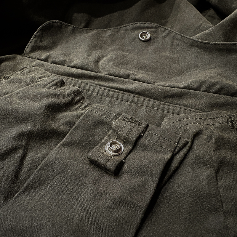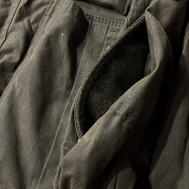 状態は経年のわずかな使用と主には保管による、生地表面のワックス処理のムラや保管によるシワやくすみこそみられますが、画像のように極めて使用感が浅く、おそらくほとんど使用されていない印象の生地感となっており、インナー側も非常にクリーンで、ボタンやジッパー、各部のDリングをはじめとしたハードパーツにおいても極めて良好な状態を維持したトップコンディションを維持した貴重な一着です。