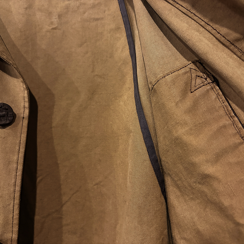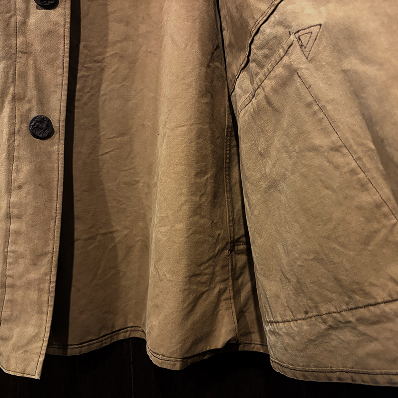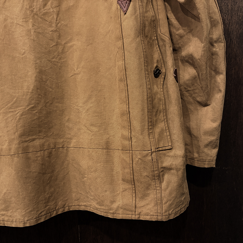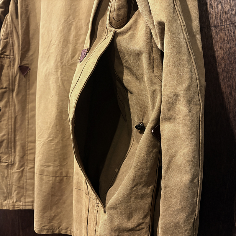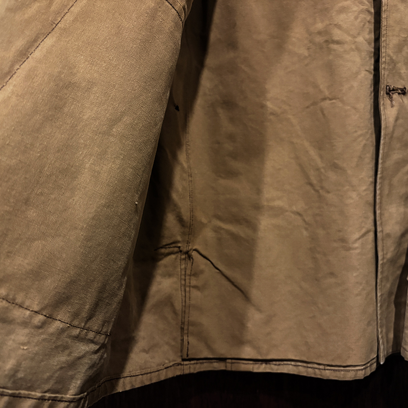 袖付けも脇箇所の深く下に切り込んだ切り返しは動きやすいパターンとなっており、襟周りも開襟が良く合った希少で独特のシルエットディテールとなっています。