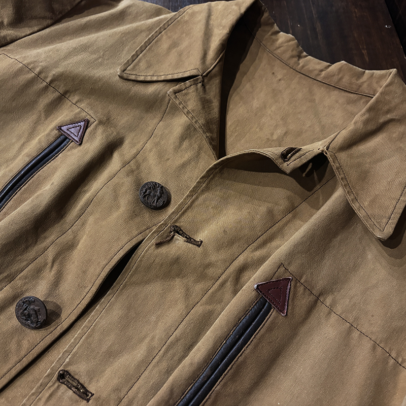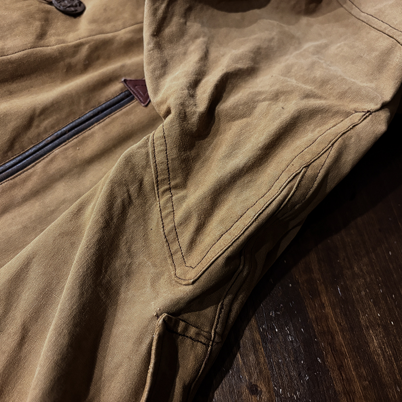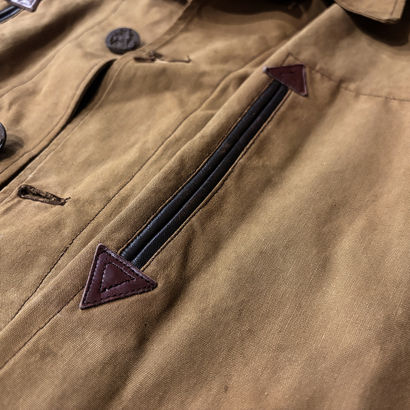 ハンティングジャケットとしてのデザインも非常に凝ったディテールが見られ、フロントには左右胸元には縦スリットのリアルレザーによる玉縁ポケットでエンドには三角のレザーでの補強、下段はフラップポケットで同じくレザー補強がつくなど良いアクセントとなっています。