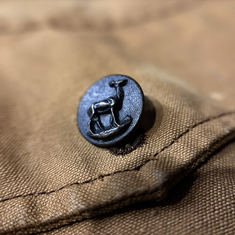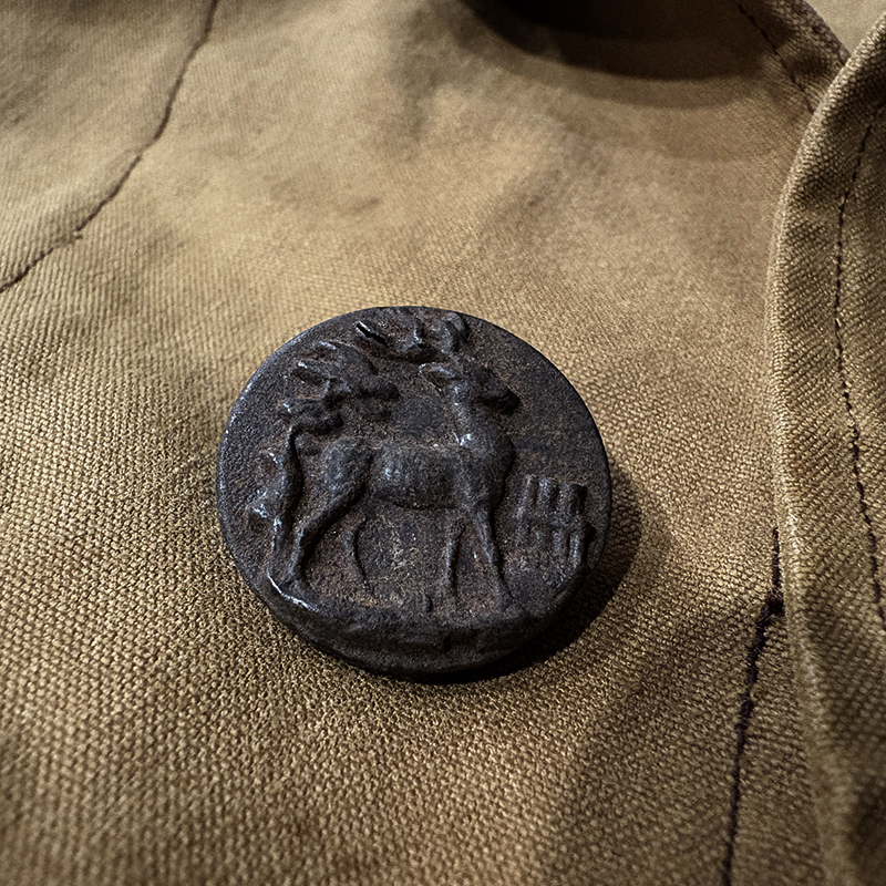 ボタンはフレンチハンティングを象徴する狩猟関連の動物をレリーフのメタルボタンが採用されており、狩猟にまつわるモチーフとして猟犬や鹿、兎などのデザインが立体的に表現されています。