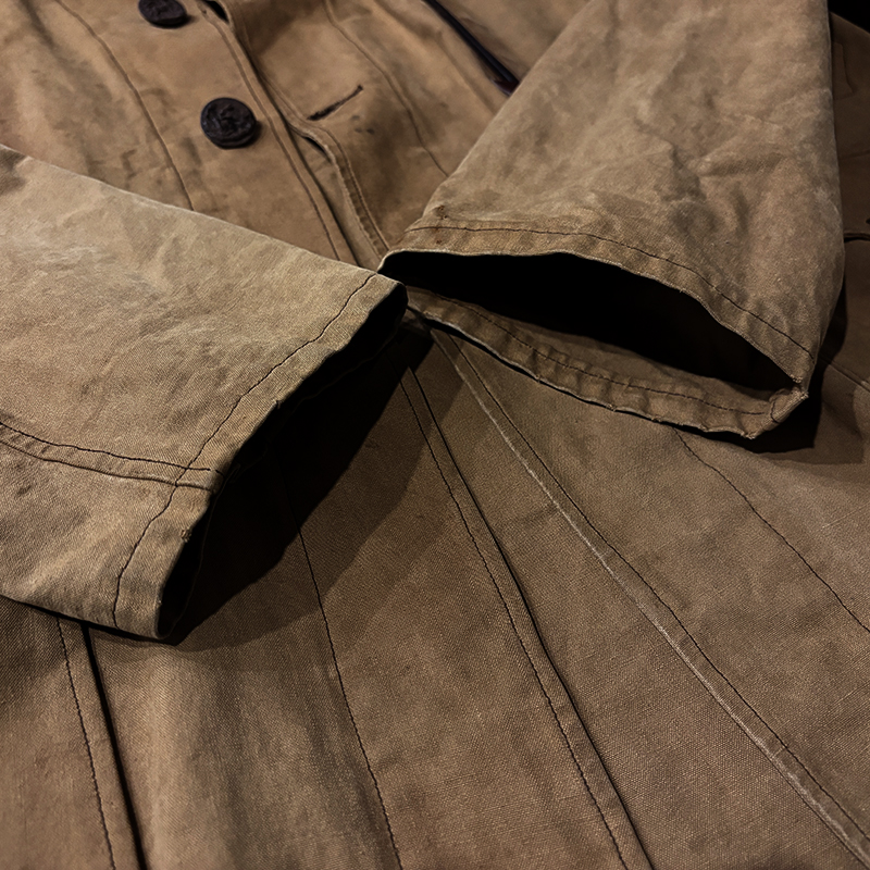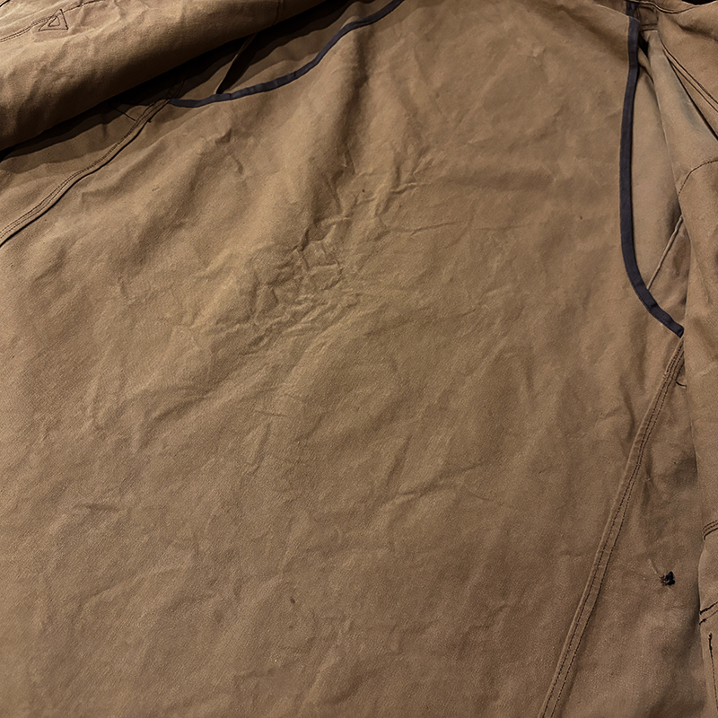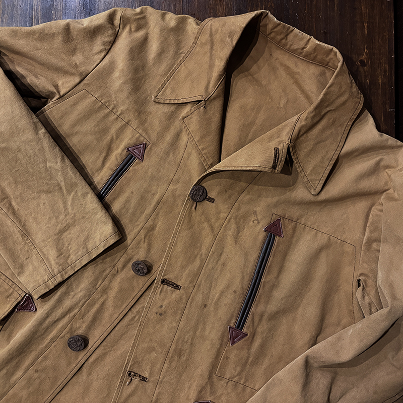 本品は質感の良い堅牢なコットンダックキャンバスがメインマテリアルのフレンチハンティングジャケット、フレンチビンテージでもこのコットンダックものは非常に希少なモデルとなっており、さらに経年のダックらしいフェードカラーの濃淡も大変雰囲気の良い一着となっています。