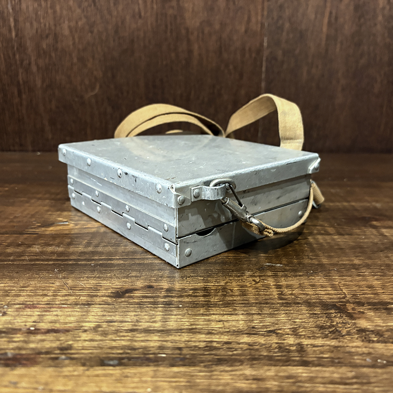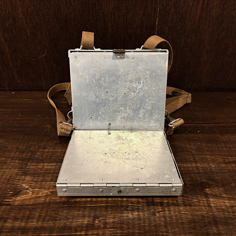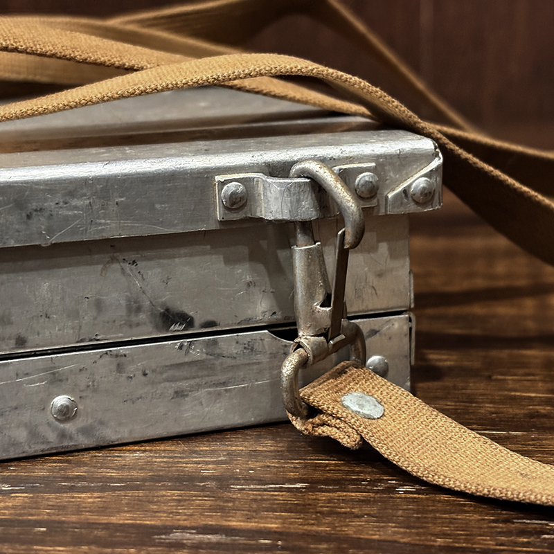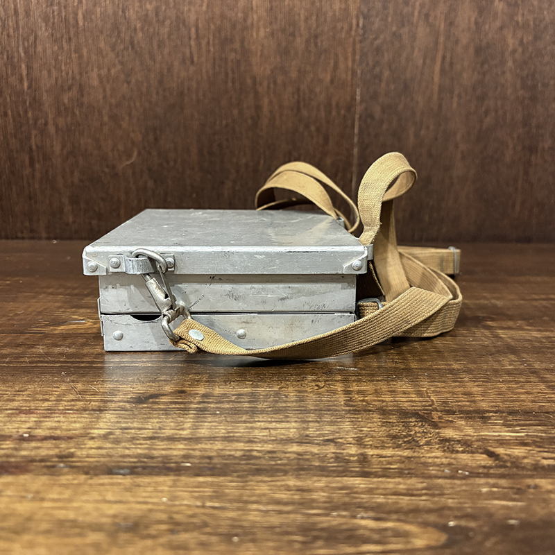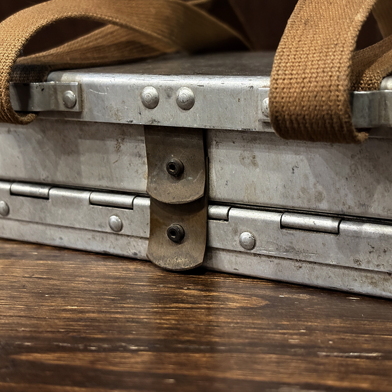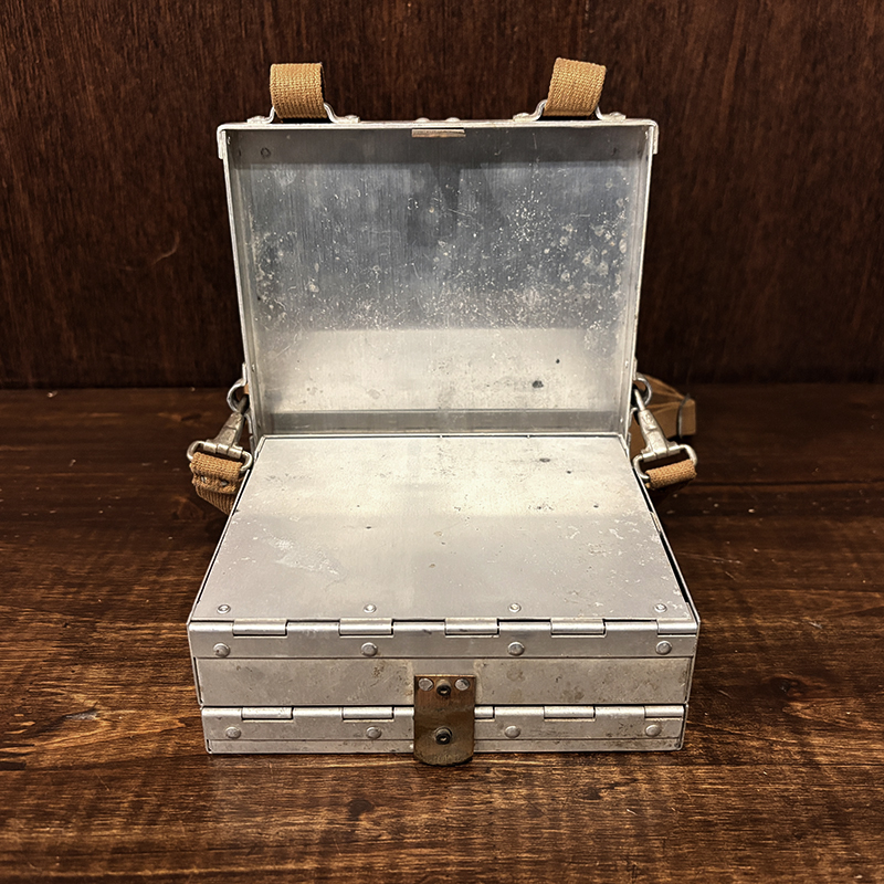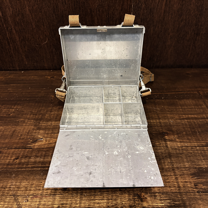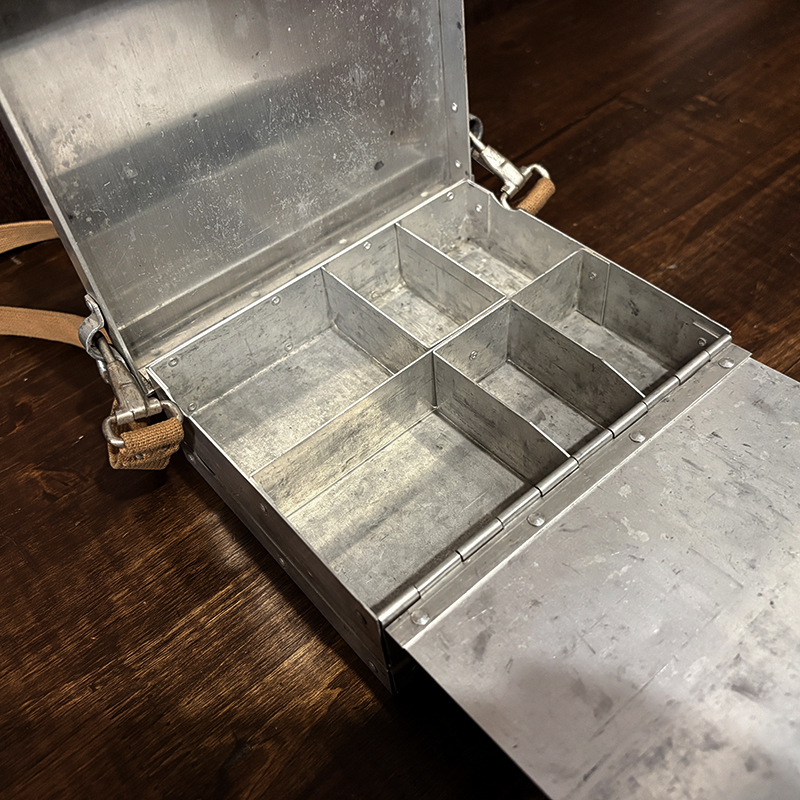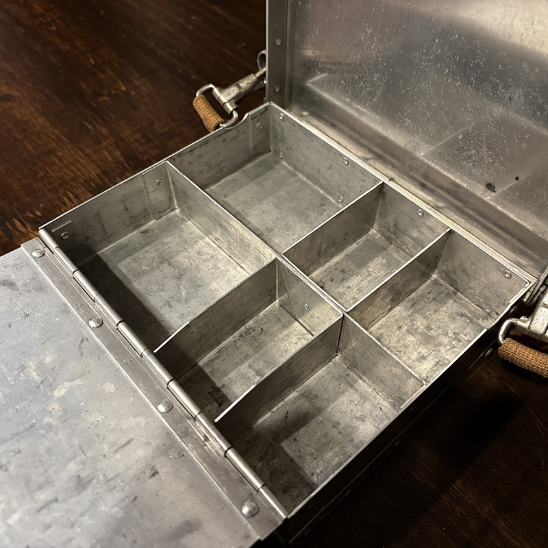状態は経年の使用と保管によるボックス躯体アルミニウム表面のところどころの擦れ傷はじめアルミ特有のくすみや酸化変色、バインダーストッパーはじめストラップベルトやメタルホルダーの金属表面の変色こそみられますが、本体ボックスはまだまだ開閉もスムーズで堅牢な質感を維持しており、アルミニウムも強度のある厚みがあることで堅牢で、内部のコンパートメント仕切りやヒンジなどの細部各部ディテールも大変良好な状態を維持した、大変初期ビンテージチェストボックスとしてはまだまだ末長くお使いいただけるオリジナルコンディションのボックスとなっています。