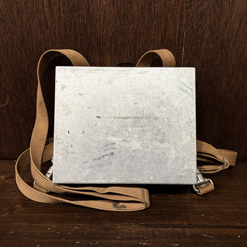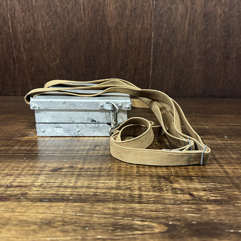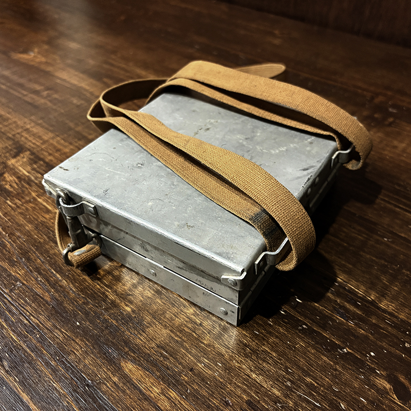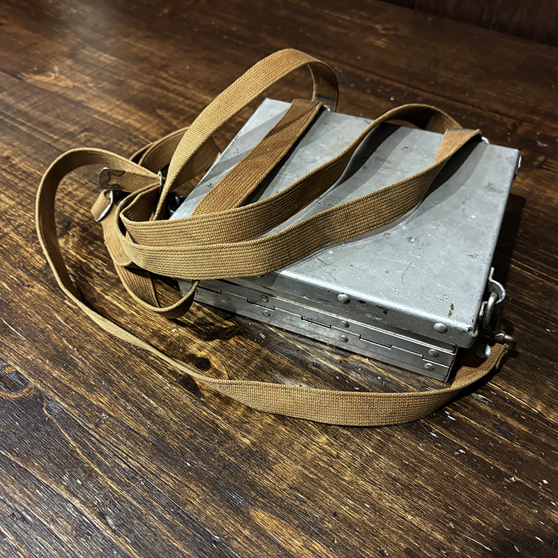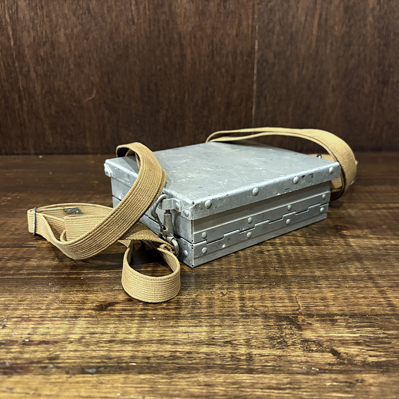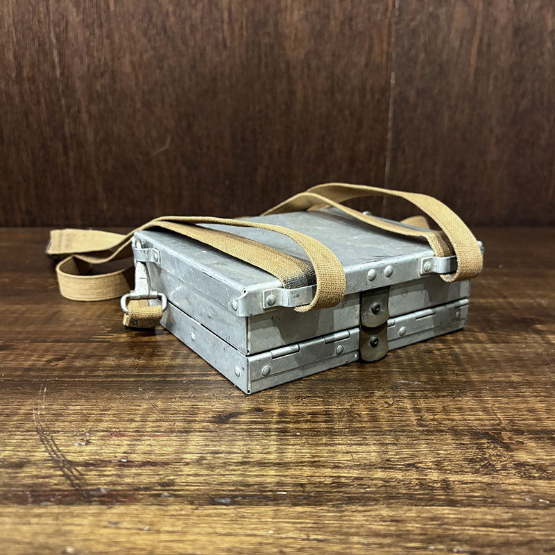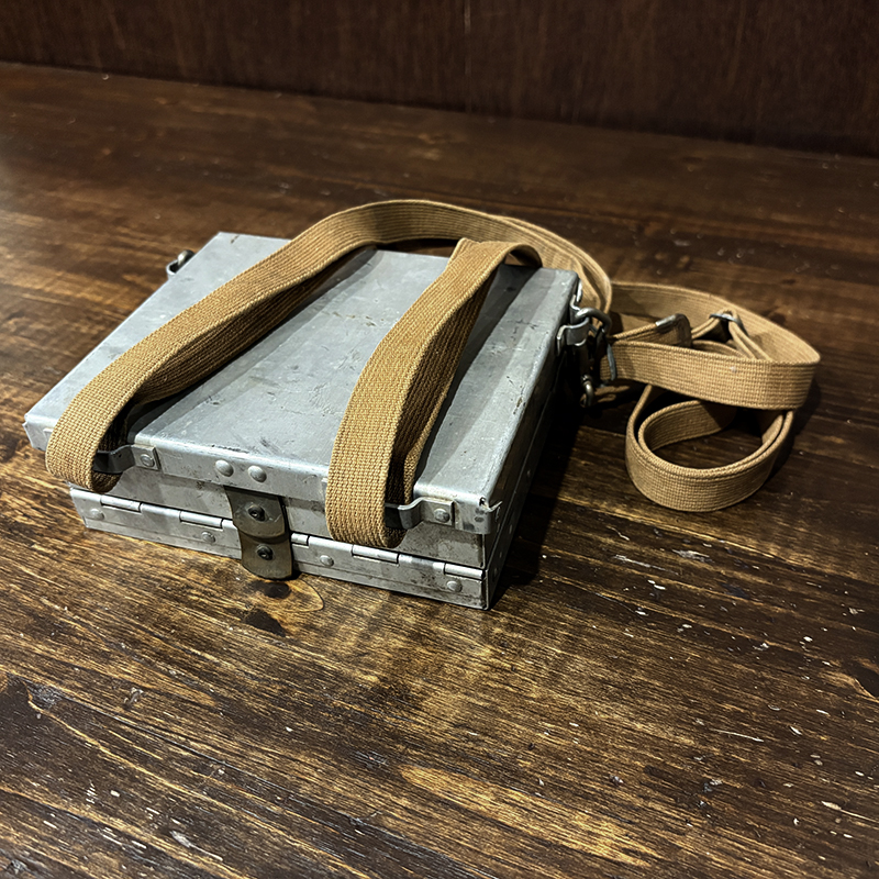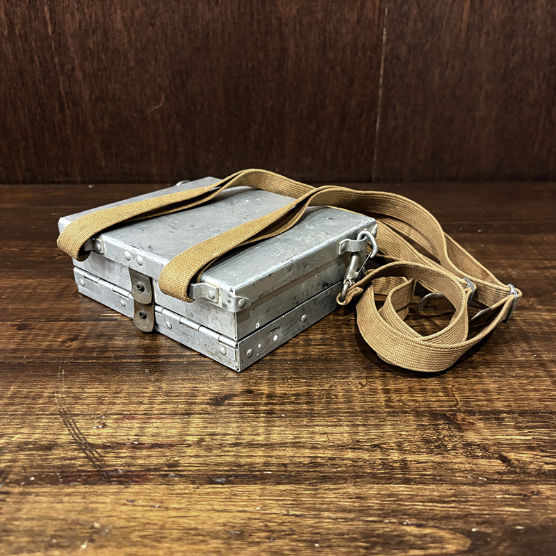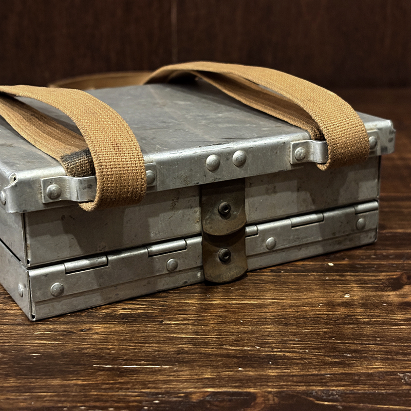 状態は経年の使用と保管によるボックス躯体アルミニウム表面のところどころの擦れ傷はじめアルミ特有のくすみや酸化変色、バインダーストッパーはじめストラップベルトやメタルホルダーの金属表面の変色こそみられますが、本体ボックスはまだまだ開閉もスムーズで堅牢な質感を維持しており、アルミニウムも強度のある厚みがあることで堅牢で、内部のコンパートメント仕切りやヒンジなどの細部各部ディテールも大変良好な状態を維持した、大変初期ビンテージチェストボックスとしてはまだまだ末長くお使いいただけるオリジナルコンディションのボックスとなっています。