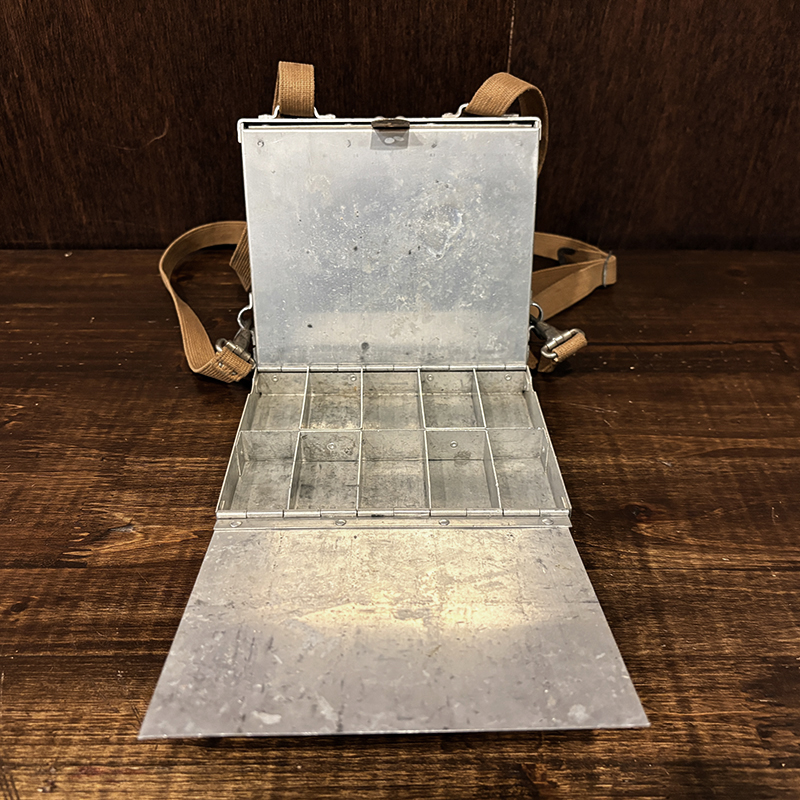 本品はチェスト型ボックスメーカーとなるリチャードソン チェストフライボックスの起源的前身となるFYE BOX銘 OSCEOLA MILLS, PA. の初期オリジナル、創業者であるRonald Fyeを継ぐことになるRex Richardson当人がストラップによって胸元で固定する独自のフライボックスとして特許取得しさらに発展させました。