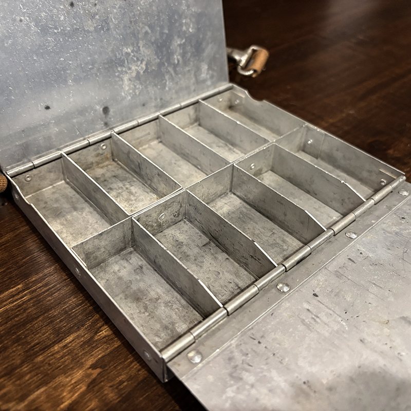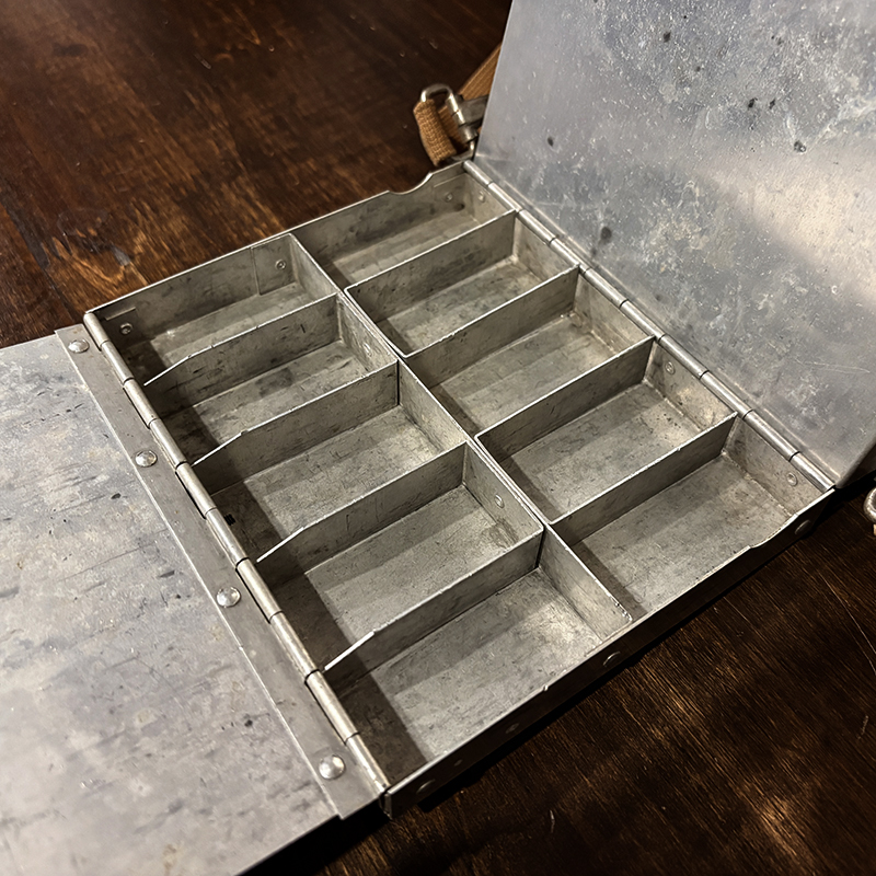 リチャードソンボックスのさらに前身にあたる 極めて希少な Fye Box、アルミニウム躯体で軽量なスペックである2段仕様のドライフライ専用チェストボックス、アルミ特有の鈍い輝きと風合いがさらに使い込むと増していくクラシックな道具です、フライフィッシングはもちろんコルクなどを敷いて小型のルアーボックスとしても良い雰囲気です、是非ご検討ください。