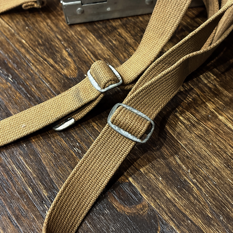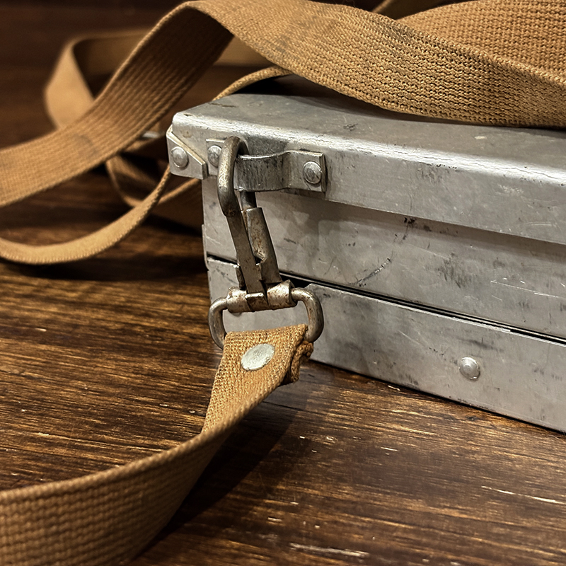 ストラップはライトブラウンコットン製の厚手で丈夫なベルト仕様となっており、ボックスの4箇所で連結させて肩にかけることで、ボックス本体を胸箇所にフィットさせて調節できホールドして使用することが可能です。