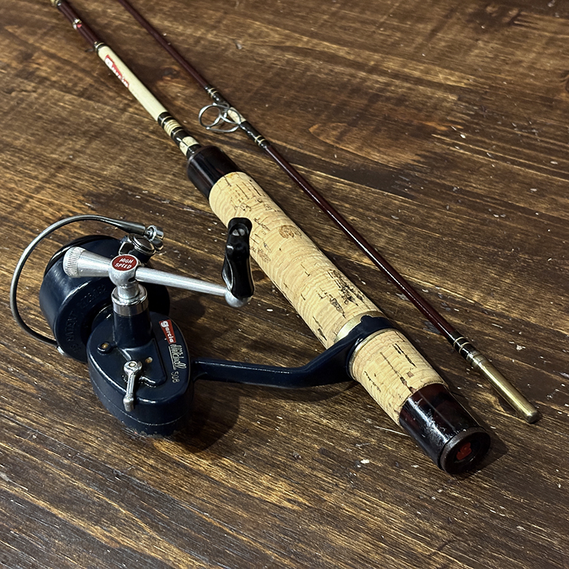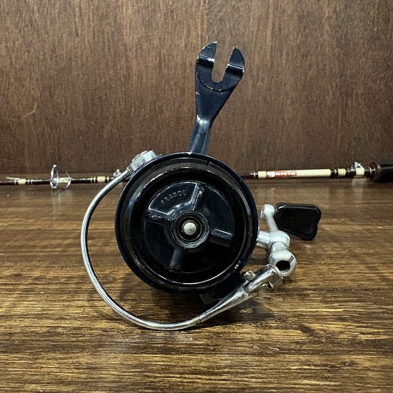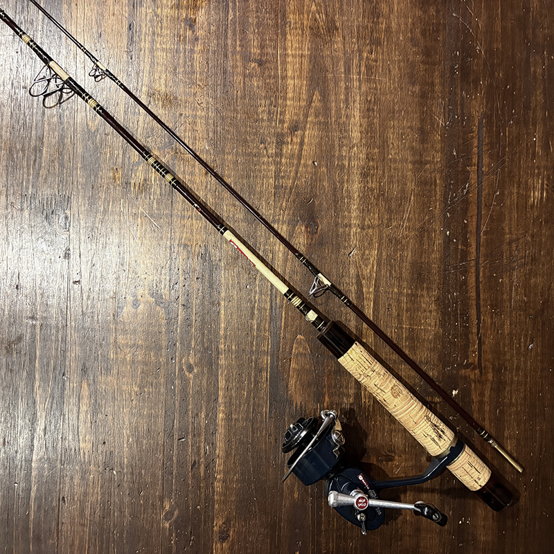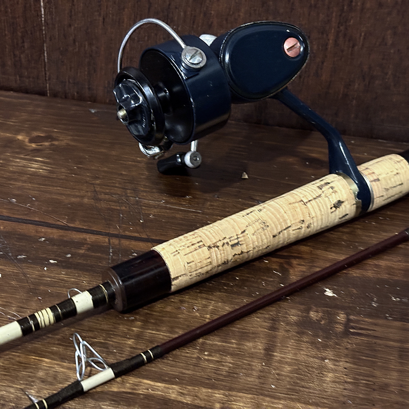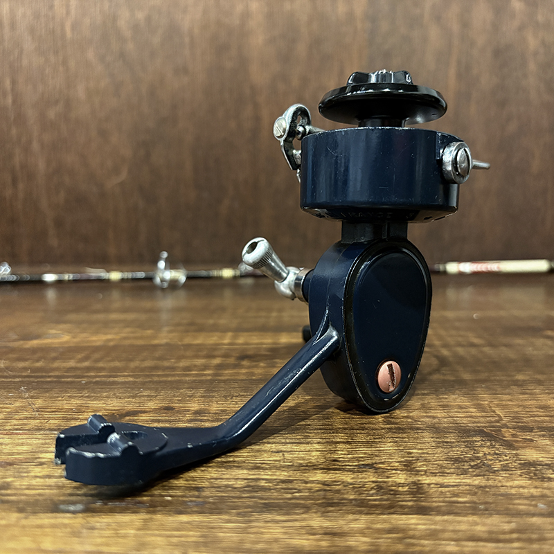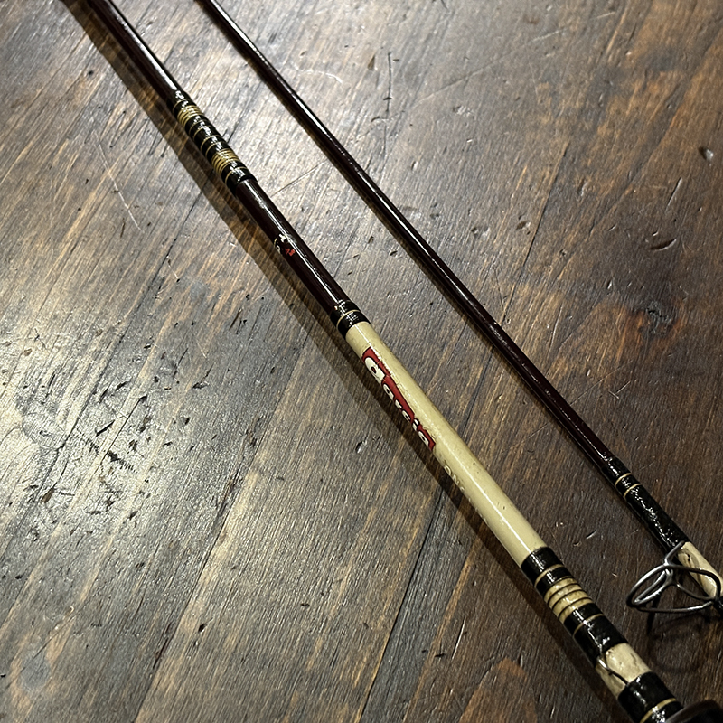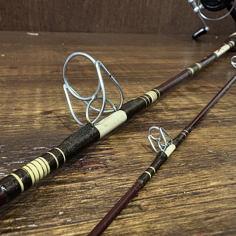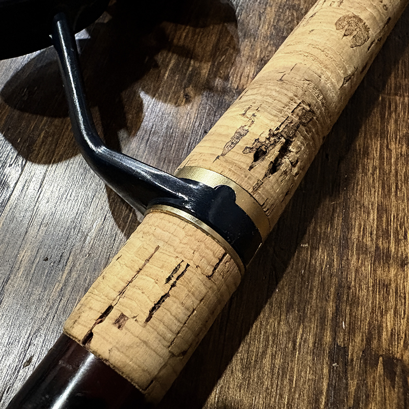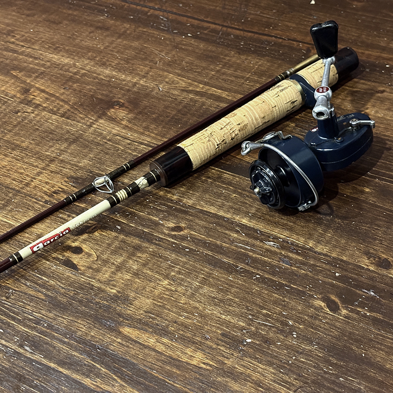 ロッドは大変貴重で現存数の少ないフォークドフットシリーズの Garcia Conolon 2584モデルで、ティップが長い2ピース構成5フィートのスピニングロッド、ティップはコノロングラスらしい張りもありつつ大変しなやか、一方バット側にはパワーを持たせたファストテーパー のウルトラライトアクションのグラスロッドです。