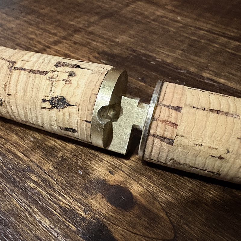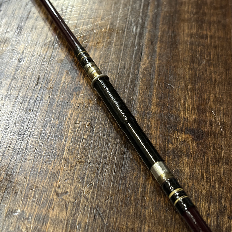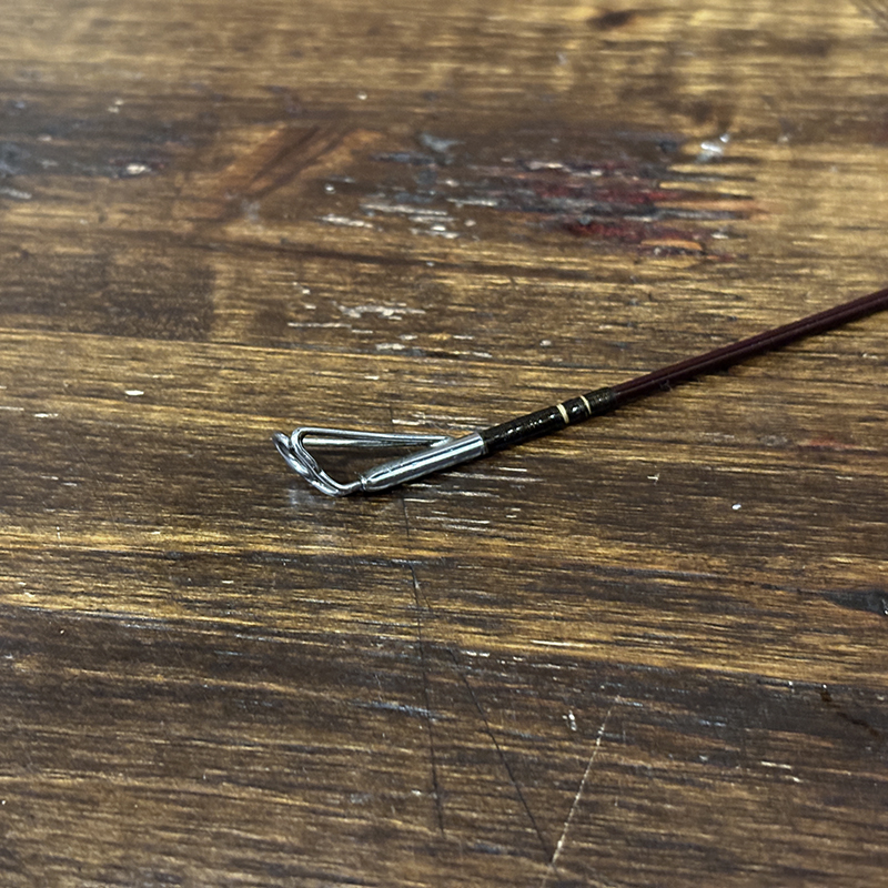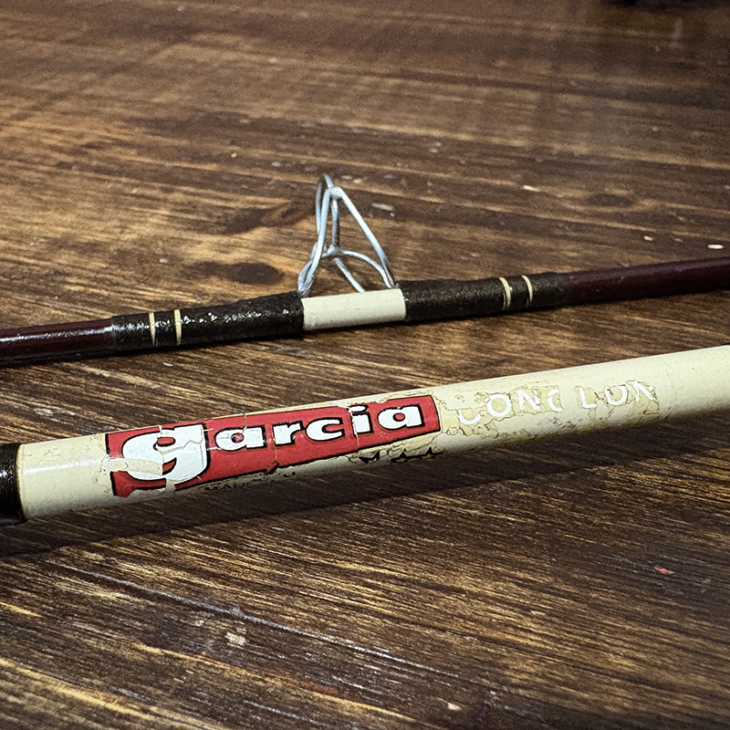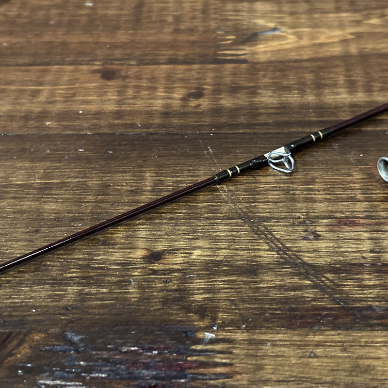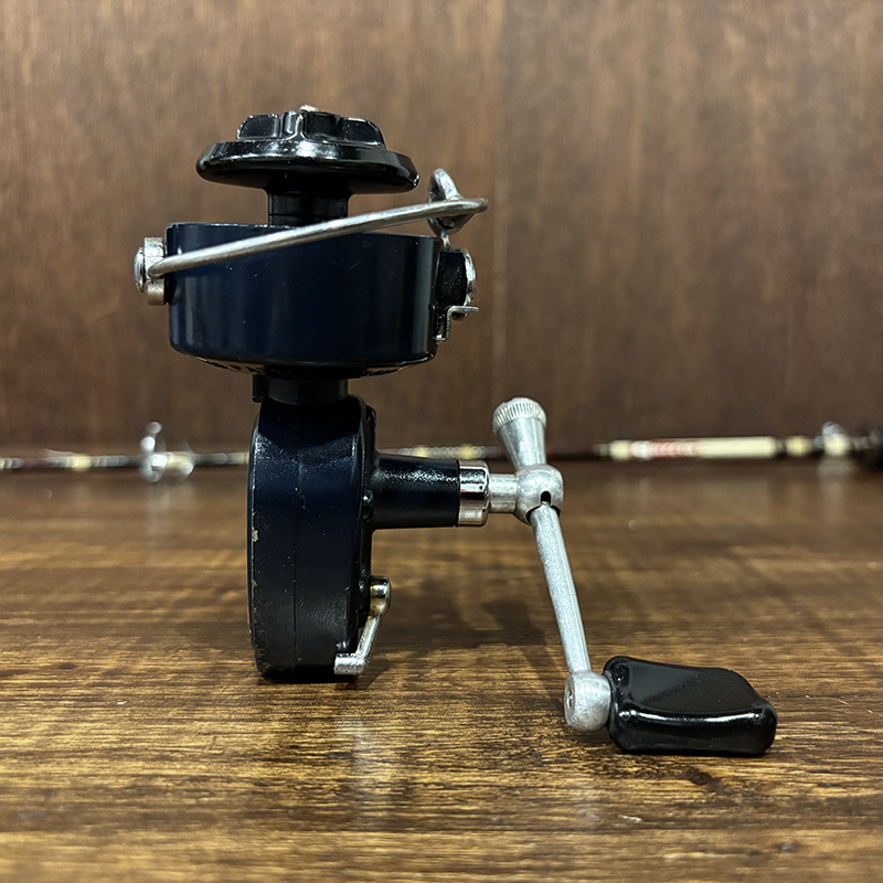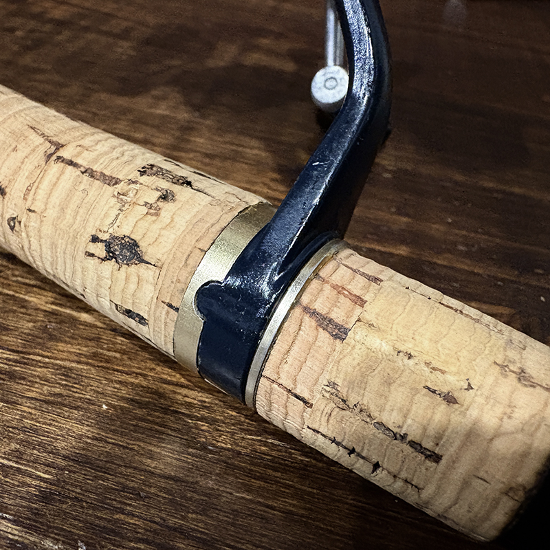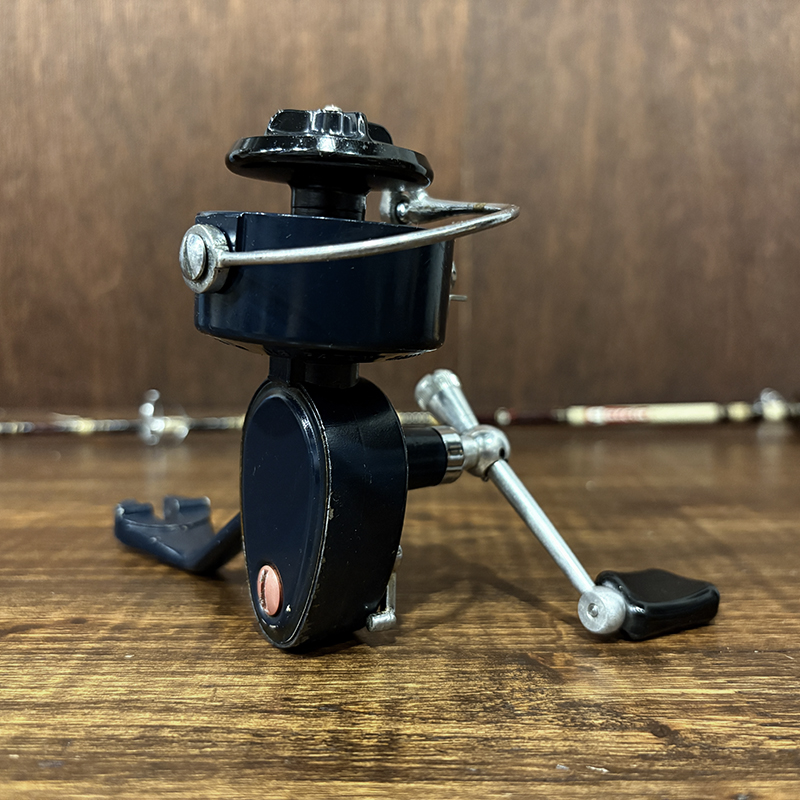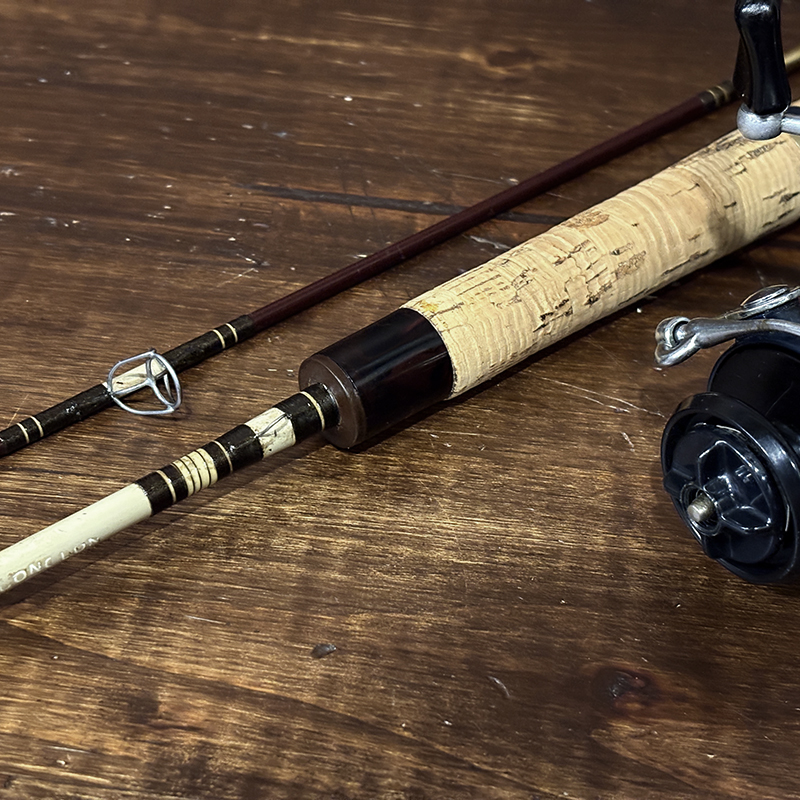 ロッドは大変貴重で現存数の少ないフォークドフットシリーズの Garcia Conolon 2584モデルで、ティップが長い2ピース構成5フィートのスピニングロッド、ティップはコノロングラスらしい張りもありつつ大変しなやか、一方バット側にはパワーを持たせたファストテーパー のウルトラライトアクションのグラスロッドです。
