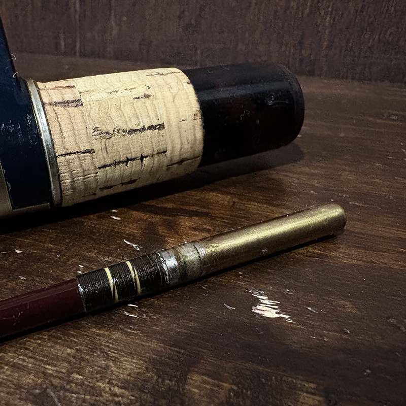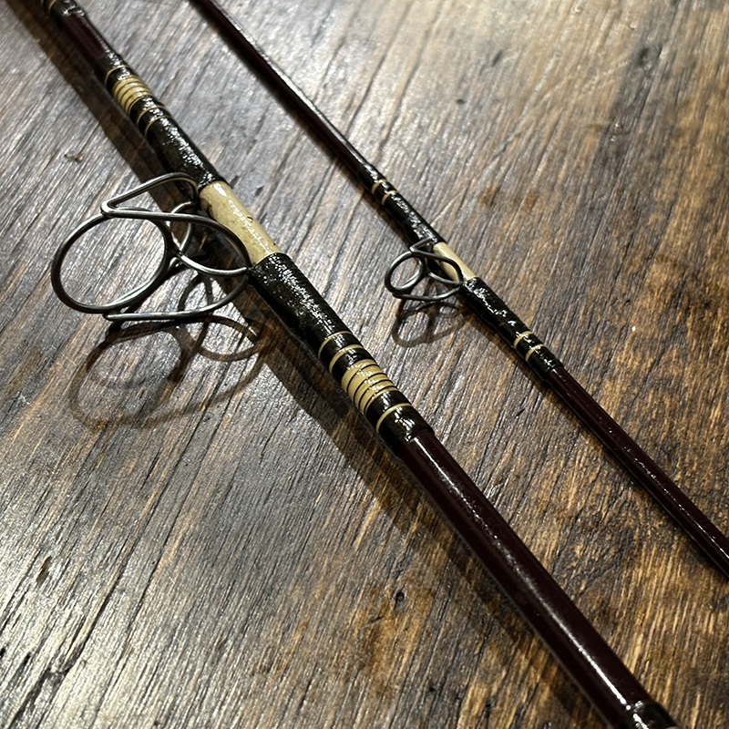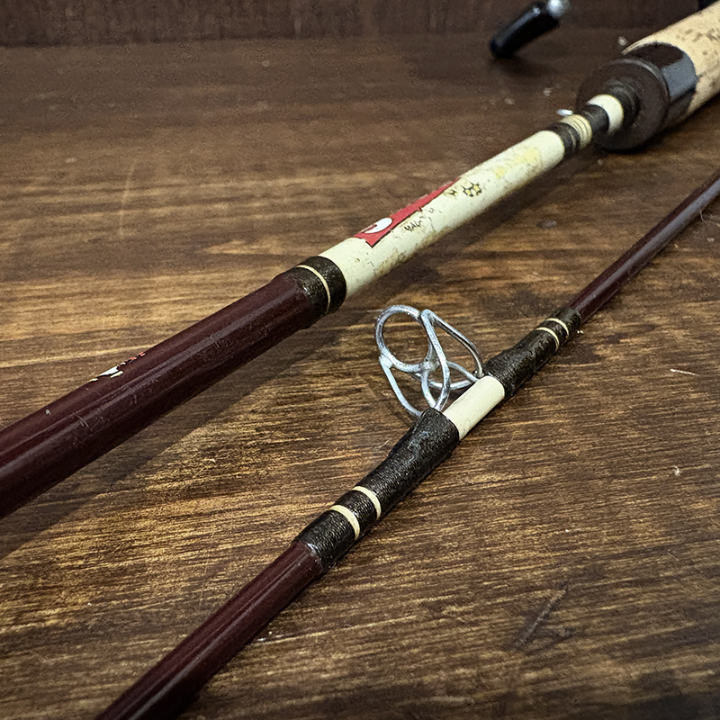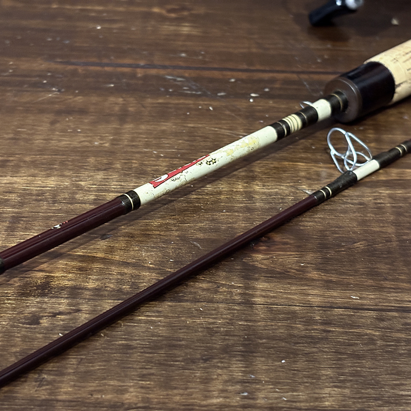 ロッドの状態は経年の使用感によるブランク表面のペイントロスや擦れやくすみ、スレッドの部分的な解け、またスペックおよびデカールロゴはところどころの剥がれや変色こそ見られますが、ブランクス自体はまだまだ良好な状態で張りもありしっかりとしており、ハンドル周りもコルクの少々の擦れや痩せこそありますが美観を保っており、付随するフォークドフットの固定機構箇所のパーツも歪みなく精度をしっかりと保った大変良好な状態、トータルとしてもまだまだ使い込んでいただける良好なコンディションを維持した個体となっています。