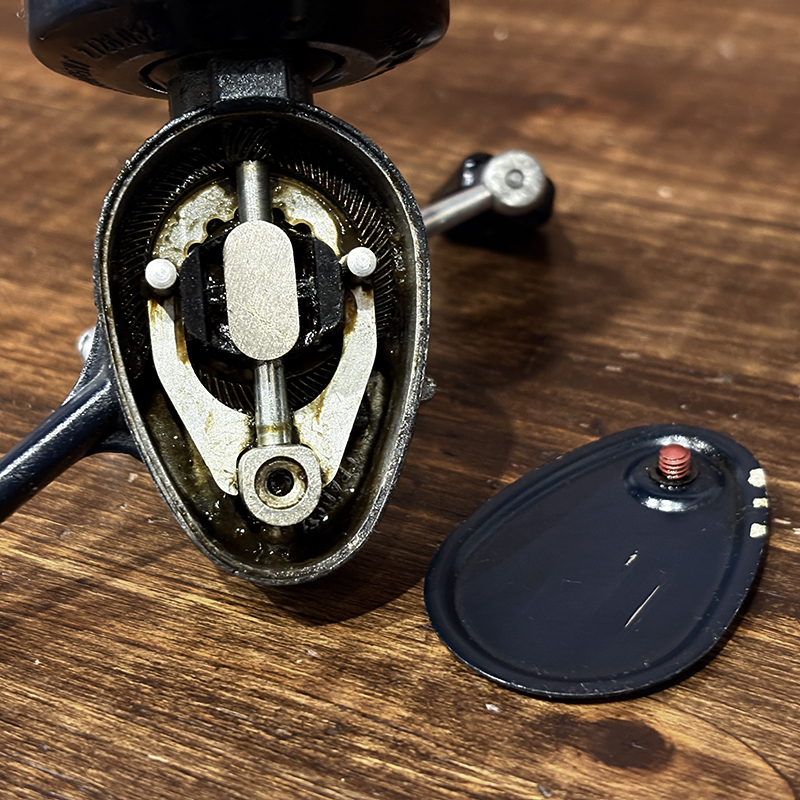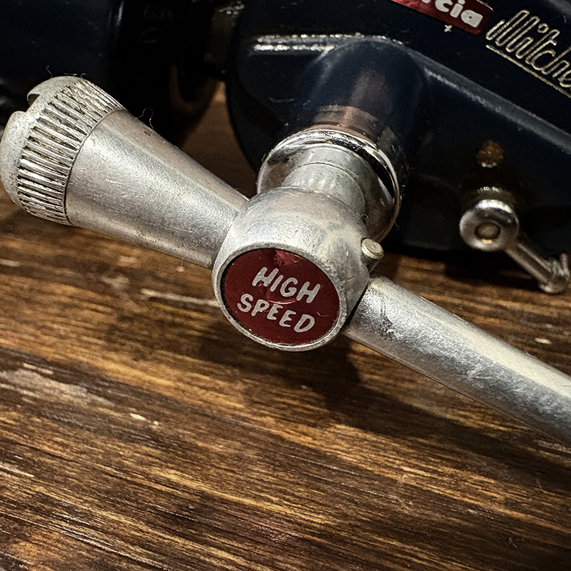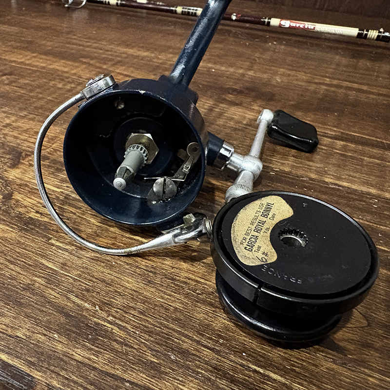 リールの状態はボディの表面的なペイント部の擦れやくすみ、金属各部摩耗や傷などの細かな使用感が見られますが、トータルでもボディから各部のディテールにおいて良好な状態を維持しており、内部の動作機構によるギア周りも注油済みで大変スムーズで状態良好なエクセレントなコンディションとなっています。