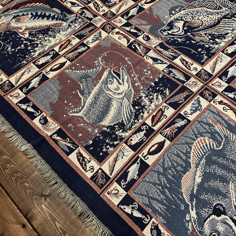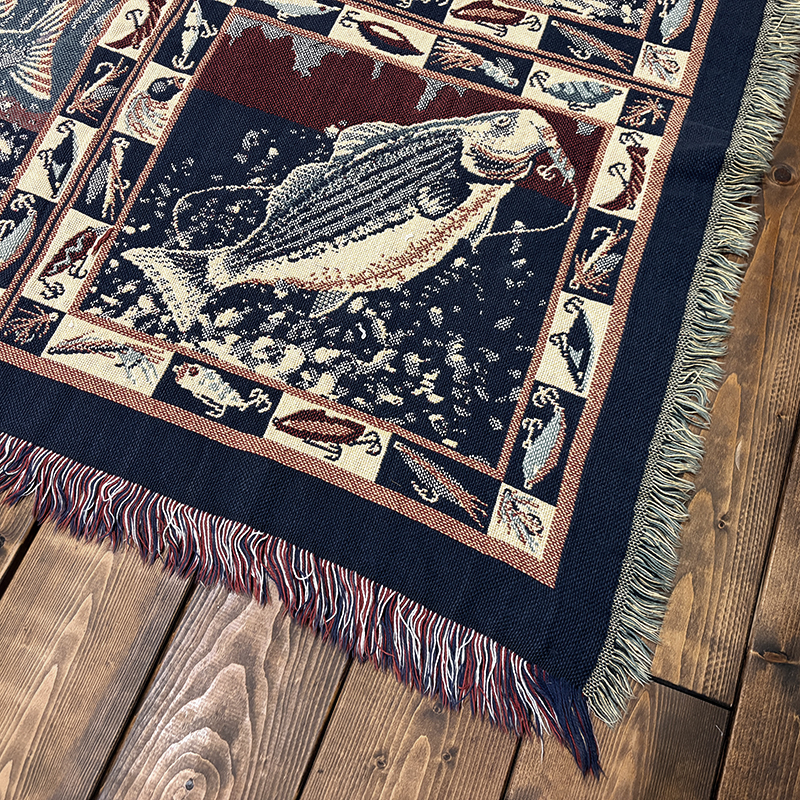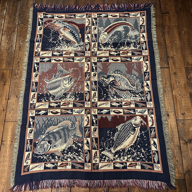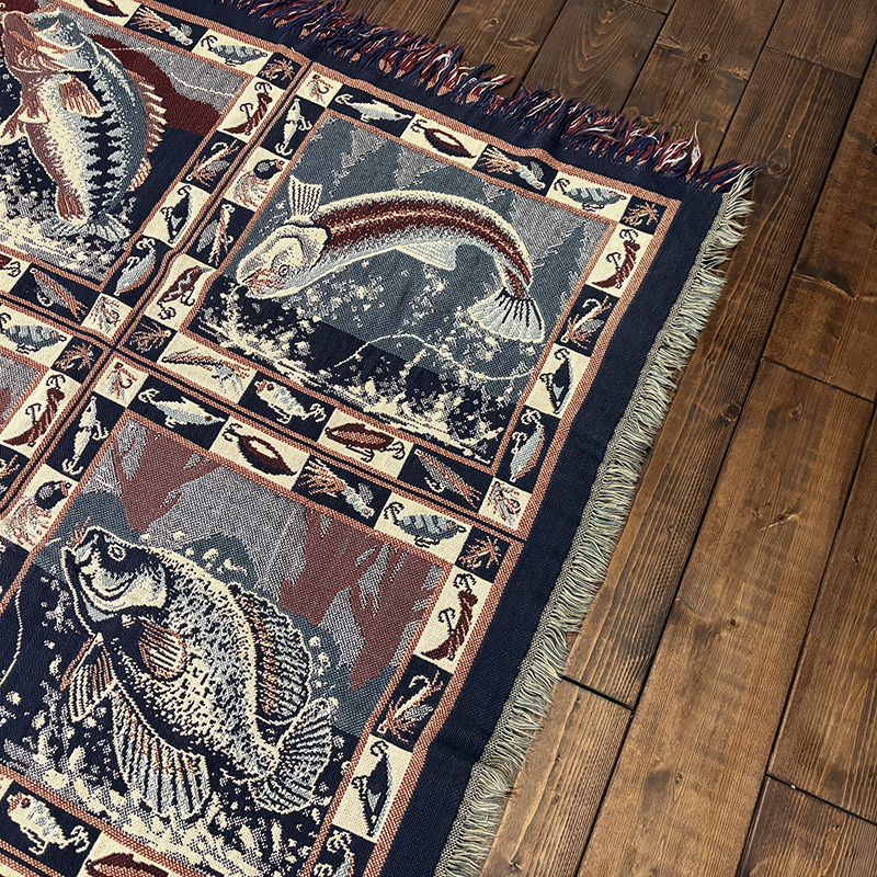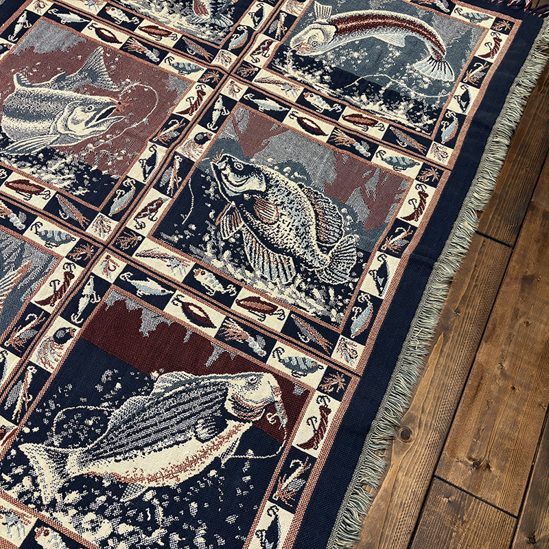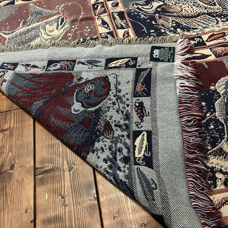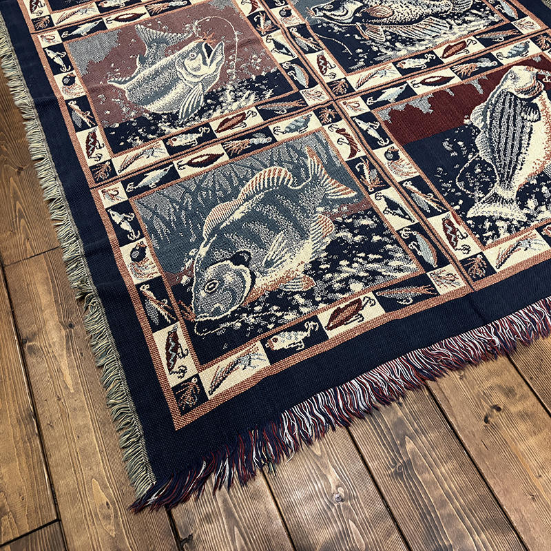 Goodwin Weaversを代表するコットンスローブランケットの希少なフィッシングゲームフィッシュモチーフの迫力ある一枚です、キャンプやフィッシング、インテリアにも、是非ご検討ください。