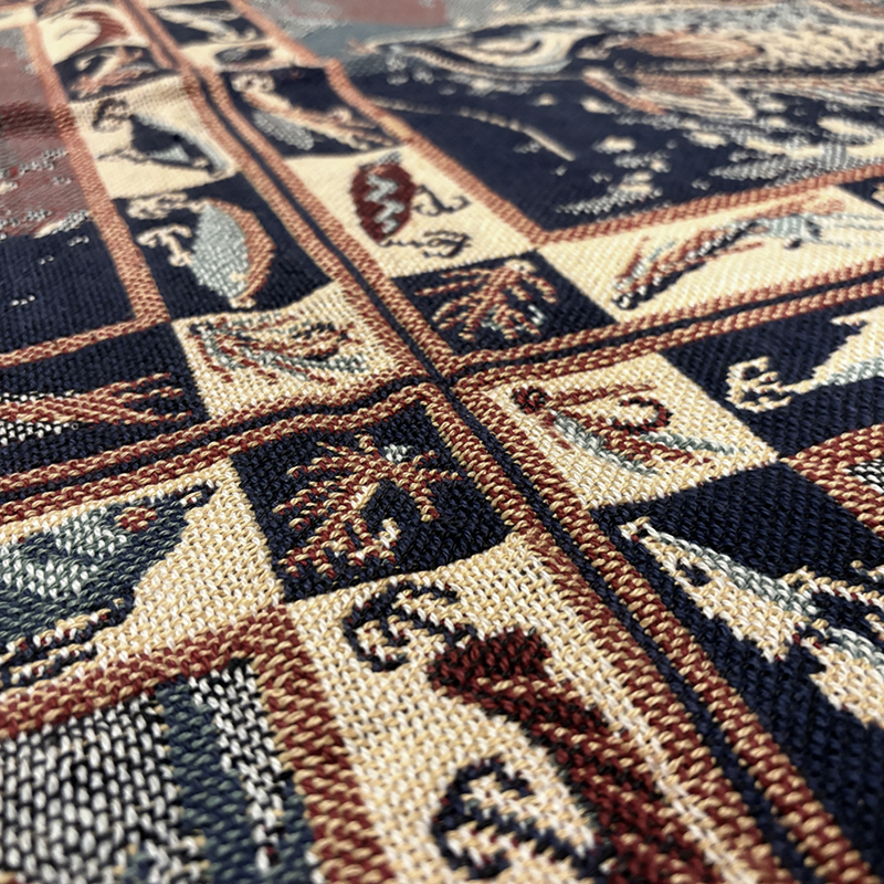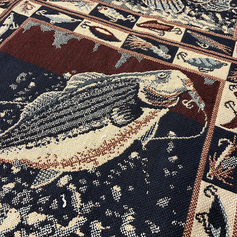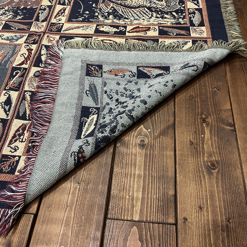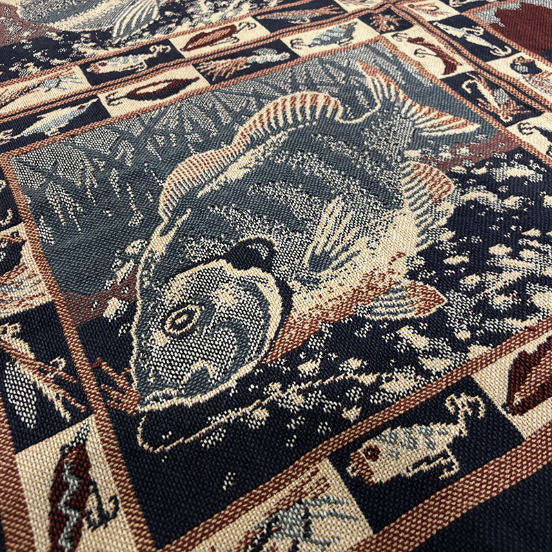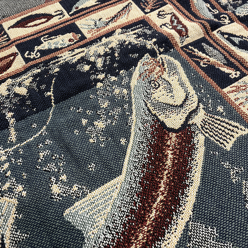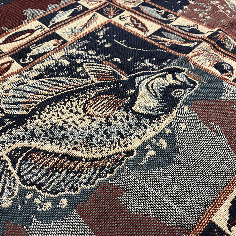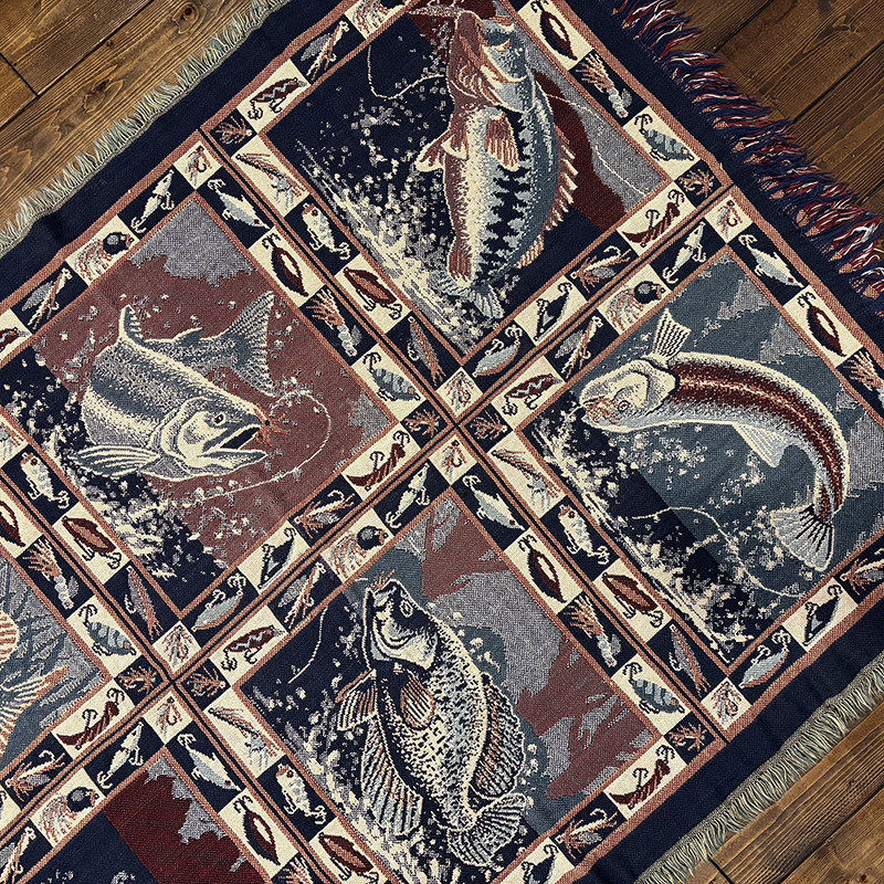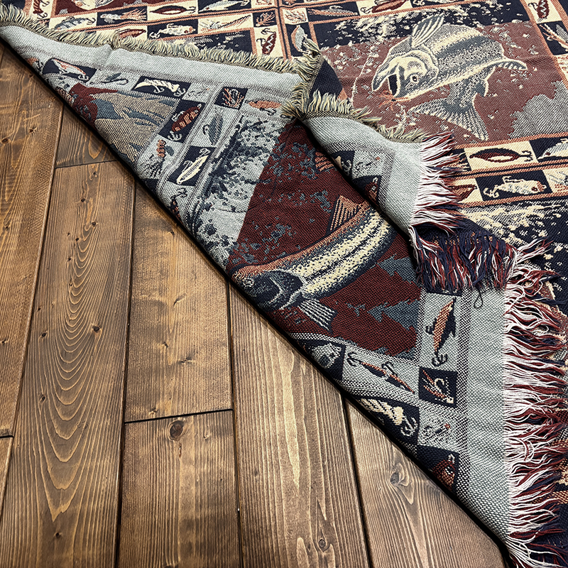 Goodwin Weaversを代表するコットンスローブランケットの希少なフィッシングゲームフィッシュモチーフの迫力ある一枚です、キャンプやフィッシング、インテリアにも、是非ご検討ください。