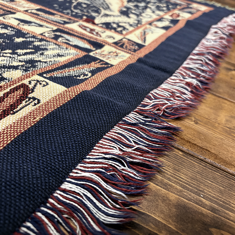一般的な大判のブランケットサイズで、ソファー等のインテリアに合わせたり、ベッドカバー、アウトドアでのキャンプなどの際にもクラシカルな雰囲気を加えてくれます。