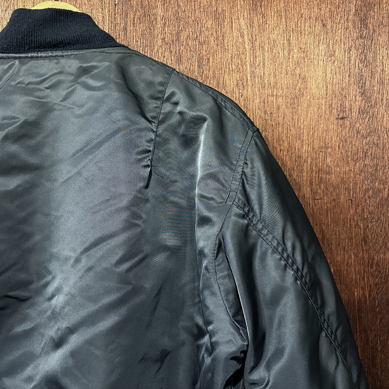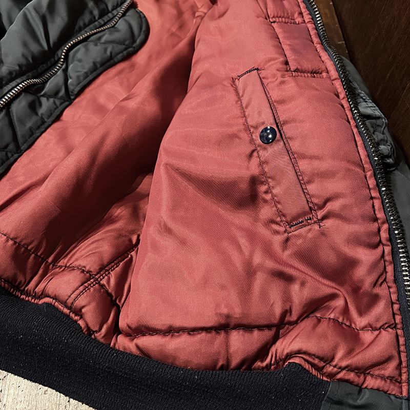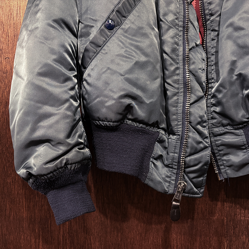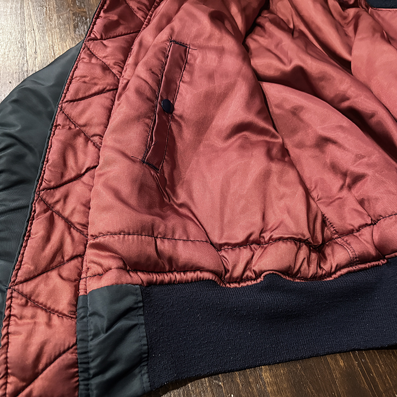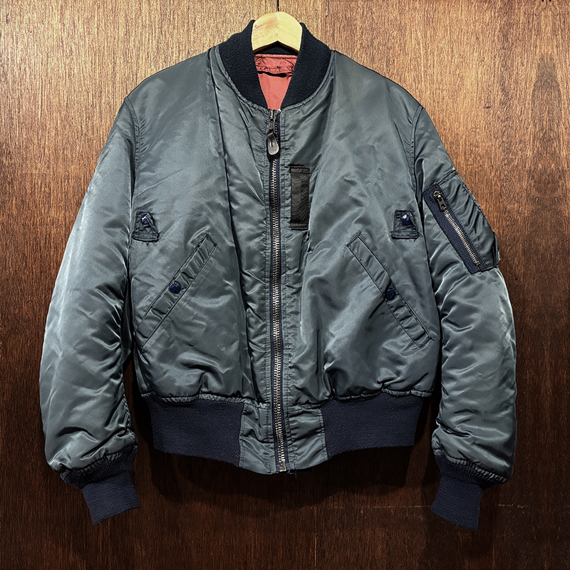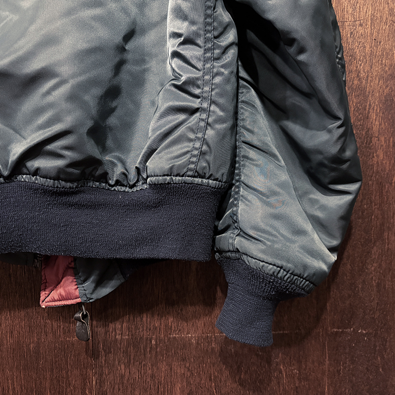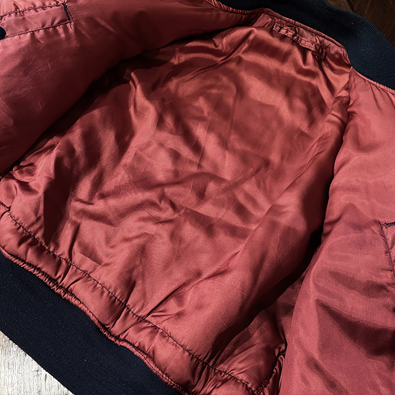 本品はUSAFのインターメディエイトゾーンセクションの名作フライトジャケットであるMA-1シビリアンモデル、中でも希少カラーであるくすんだグレーがかったネイビーカラーのナイロンツイルシェルにインナーは非常に珍しいボルドーカラーインナーのリバーシブル仕様が特徴となっており、メイン側のネイビーツイルのくすんだ濃淡のある独特の色味と光沢感がとりわけ印象的なMA-1となっています。