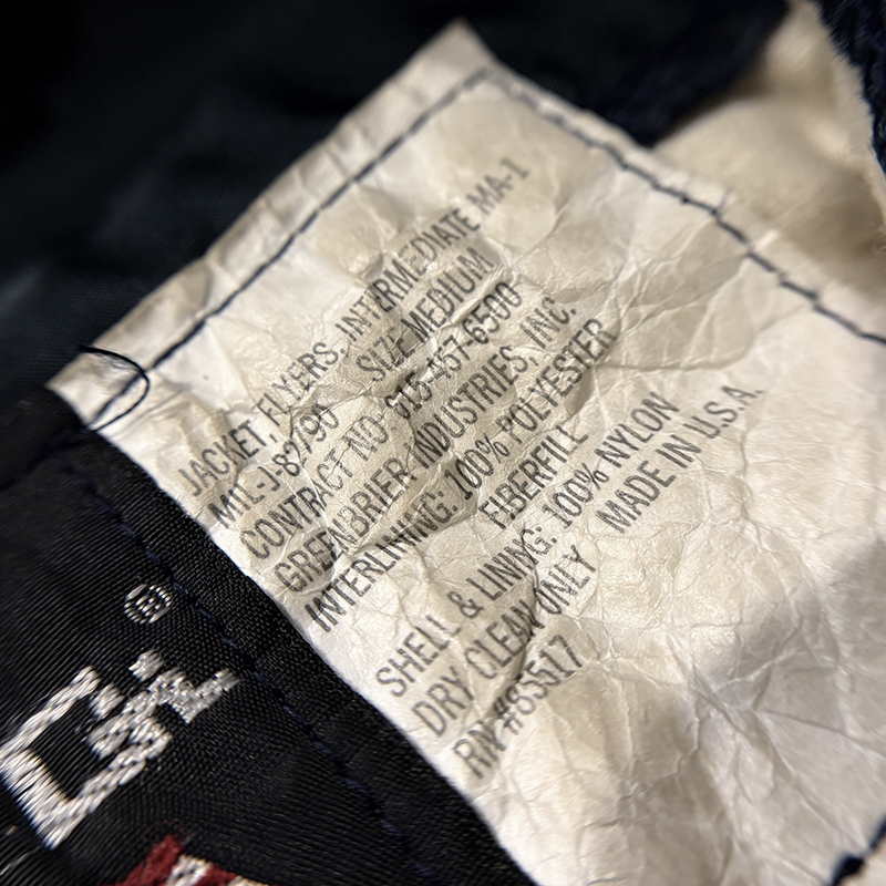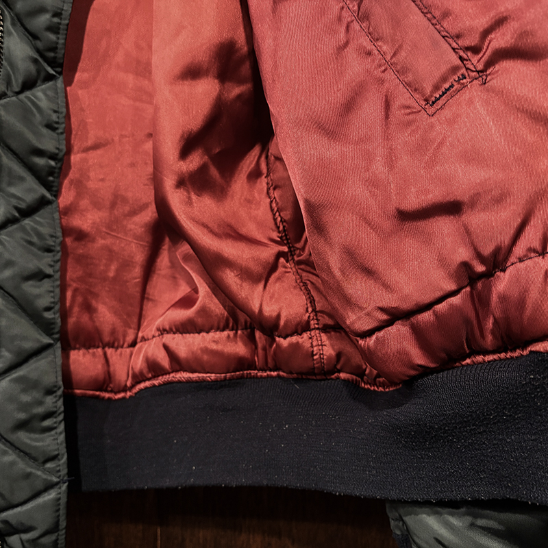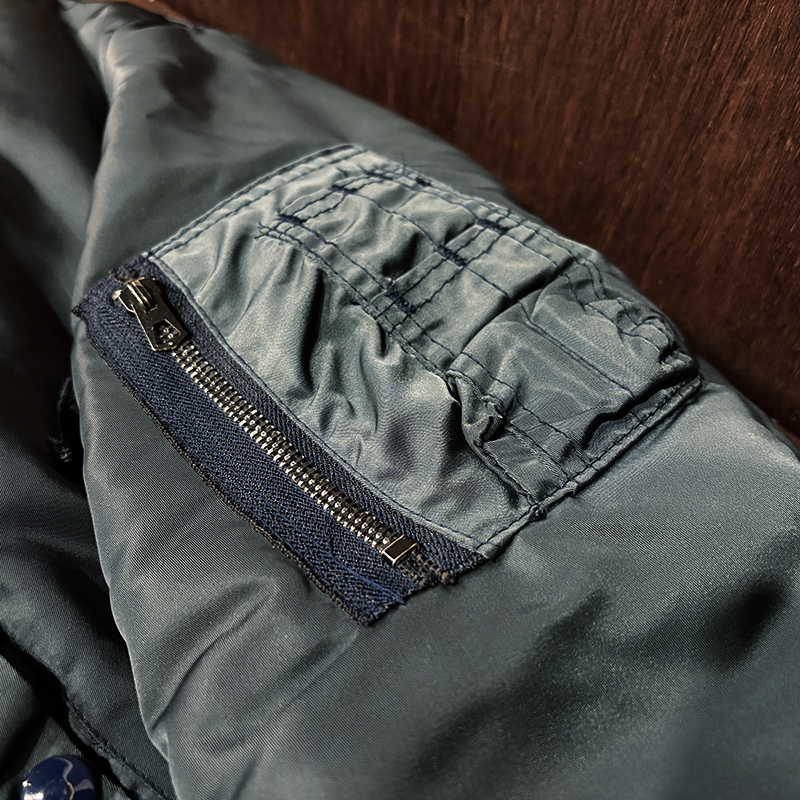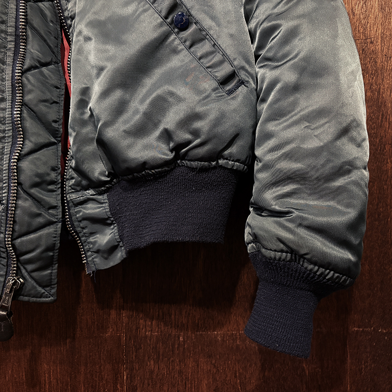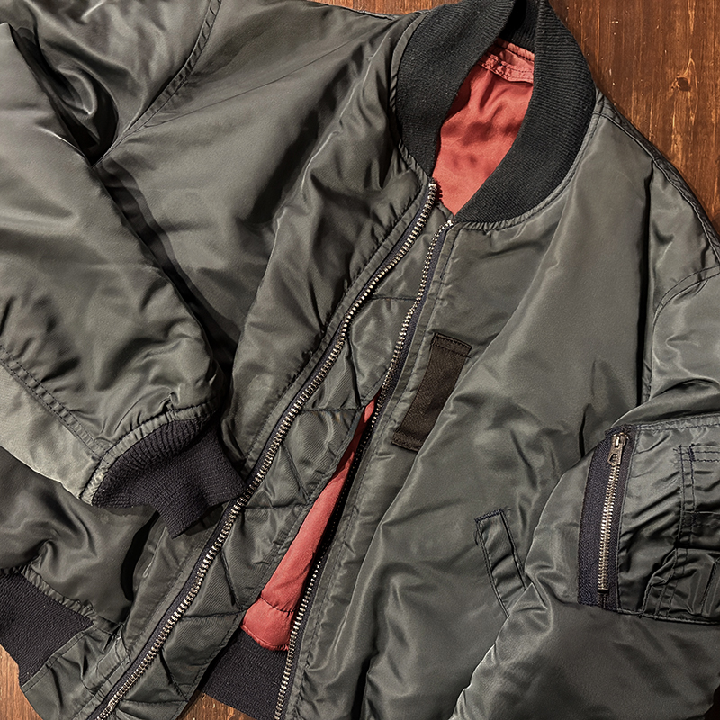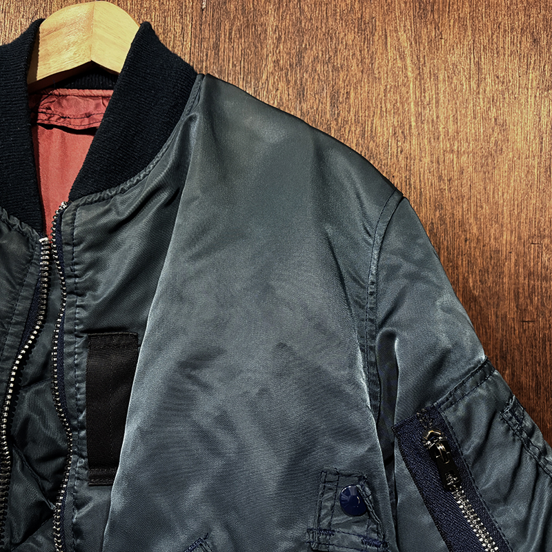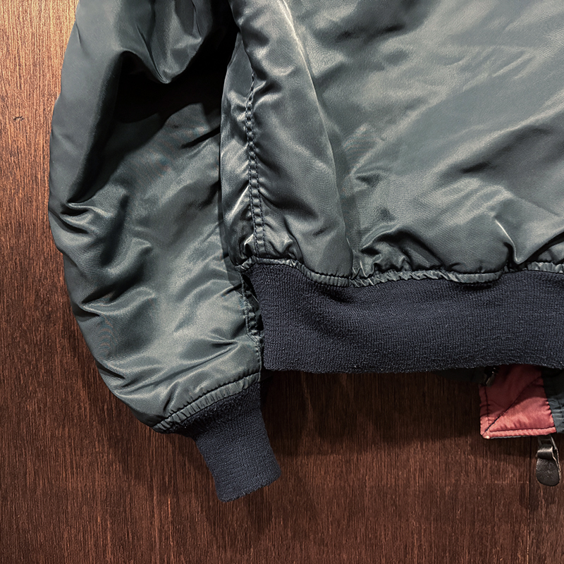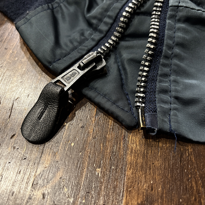 本品はUSAFのインターメディエイトゾーンセクションの名作フライトジャケットであるMA-1シビリアンモデル、中でも希少カラーであるくすんだグレーがかったネイビーカラーのナイロンツイルシェルにインナーは非常に珍しいボルドーカラーインナーのリバーシブル仕様が特徴となっており、メイン側のネイビーツイルのくすんだ濃淡のある独特の色味と光沢感がとりわけ印象的なMA-1となっています。
