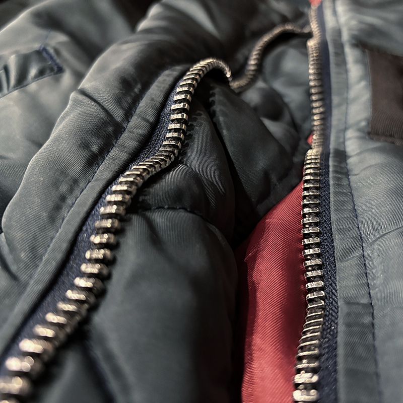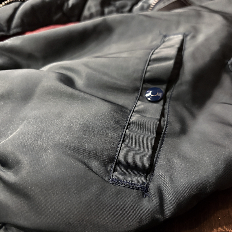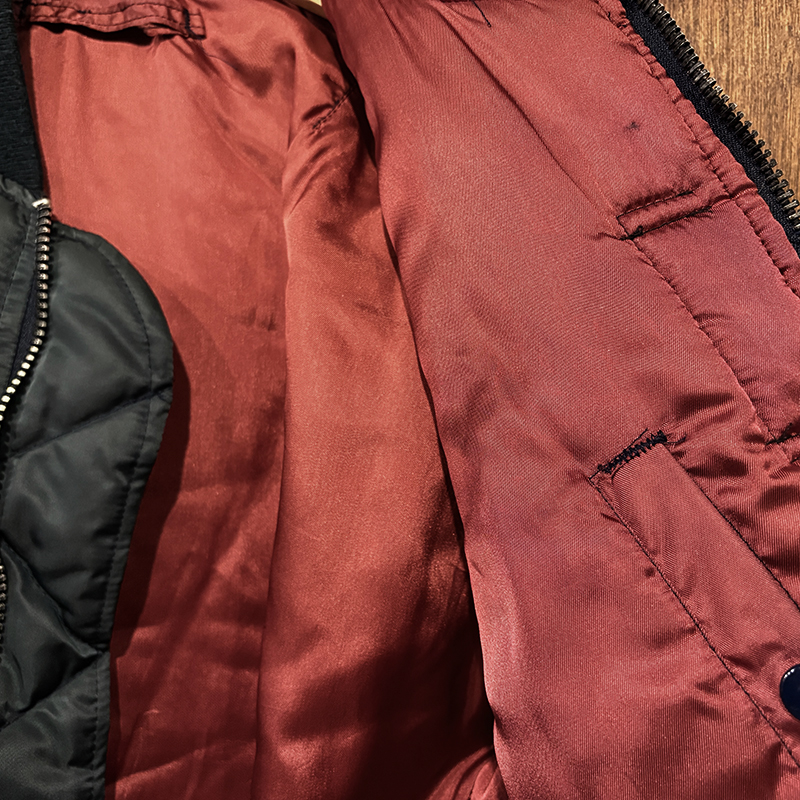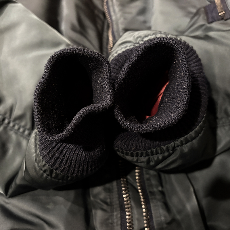 状態は、主には経年の保管と軽度な使用による、ナイロンツイルのわずかな擦れやくすみ、リブ生地の細かな毛玉や起毛こそみられますが、画像のようにネイビーナイロンは光沢もしっかりと残るほどの非常に良好な状態を維持しており、傷みやすいリブ周りも良好な状態、ボルドーカラーのインナーはじめ各部のジッパーやホック、ポケット内部の生地やタグ周りも良好なトータルとしても使用感の浅いミントコンディション相当の一着です。
