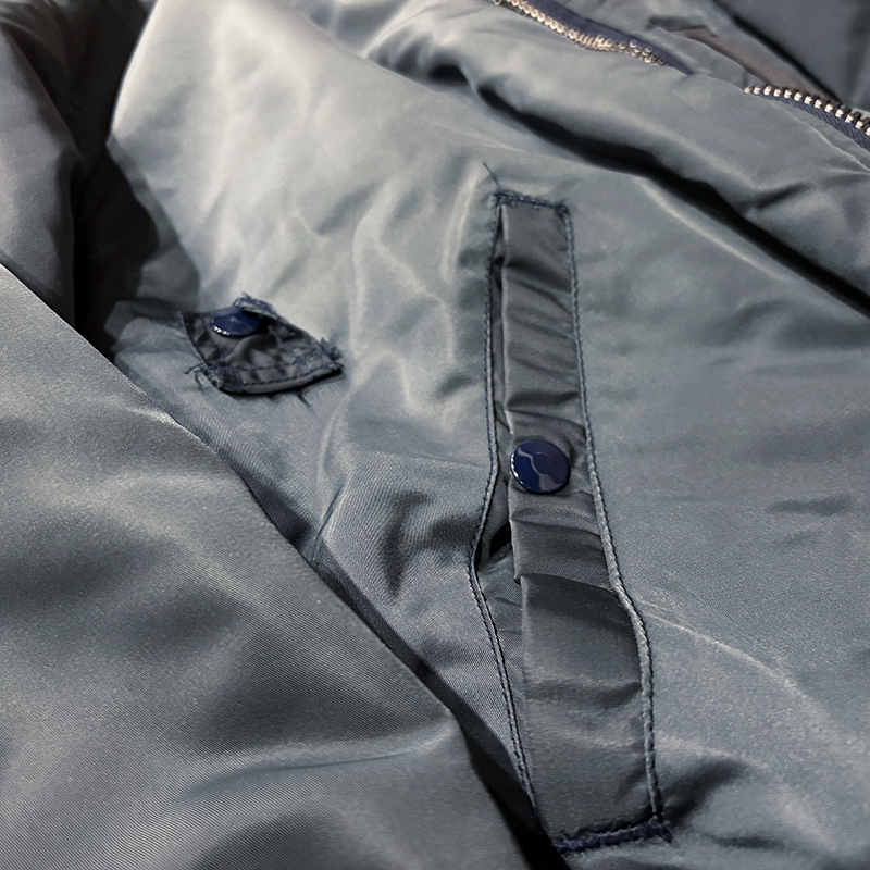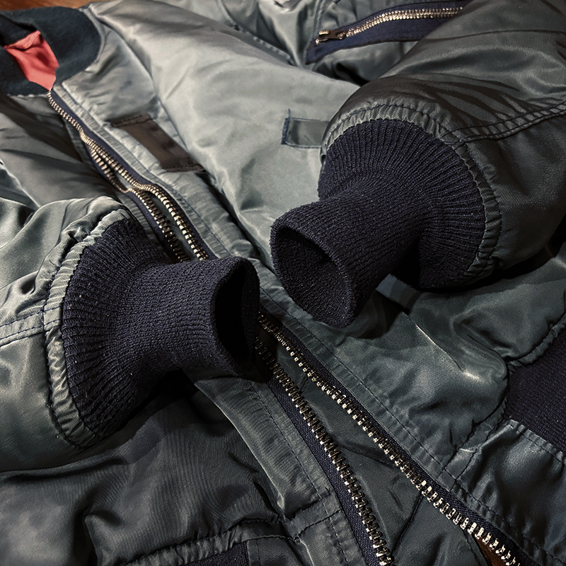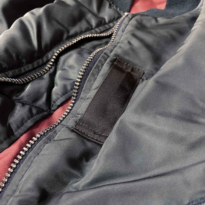 アウター側は非常に初期のMA-1のディテールを踏襲したものとなっており、ツイルシェルは前述したグレートーンのネイビーナイロン、そして襟袖裾のダークネイビーリブ仕様、EMARフロントジッパー、そしてウィンドストームフラップ、アームにはシガレットポケット、フラップ無しスラッシュハンドウォーマーポケット、フロント中央のオキシジェンボックスタブ、脇部には音声コード専用のICSループなどなど、往年のMA-1特有のビンテージディテールが揃っています。