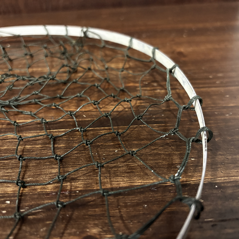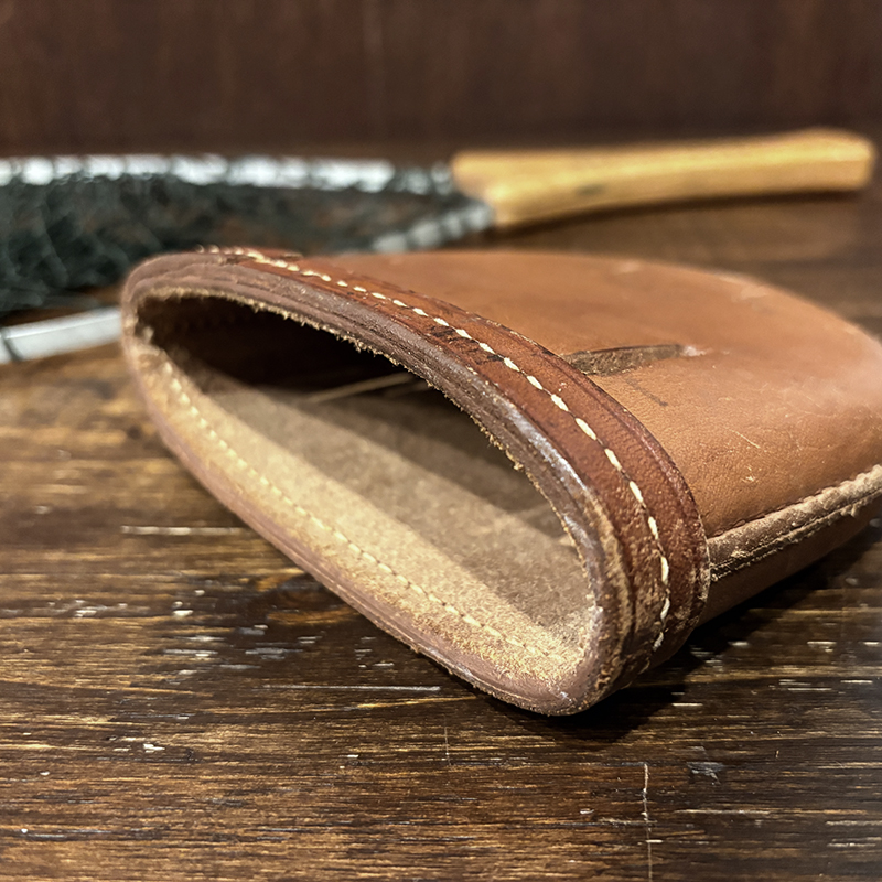 状態は経年の使用によるハンドルウッド表面やエッジの擦れや摩耗やくすみ汚れ、メタルフレーム枠の金属特有の変色、レザーケース裏側の手書きのインクサイン、コットンネットの部分的な一部の糸の切れ箇所の補修(画像参照)こそみられますが、ウッドハンドルはじめフレームなどもまだまだ良好なオリジナルシェイプを保っており、痛みやすいレザーケースも非常に状態が良好なビンテージフォールディングネットとしては良好なオリジナルの状態を維持した個体となっています。