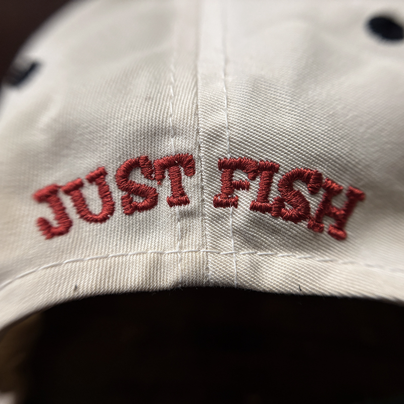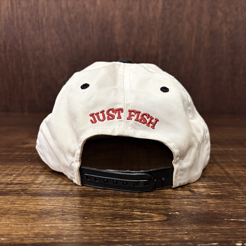 クラウンはコットンツイルがベースとなっており、ツバはブラックの切り返しで内部には芯が入っており堅牢でツバ裏はグリーンバック仕様、後頭部はJUST FISHの文言と共に一般的なスナップバック仕様となっており幅広くサイズ調整が可能なスタンダードスポーツキャップのディテールです。