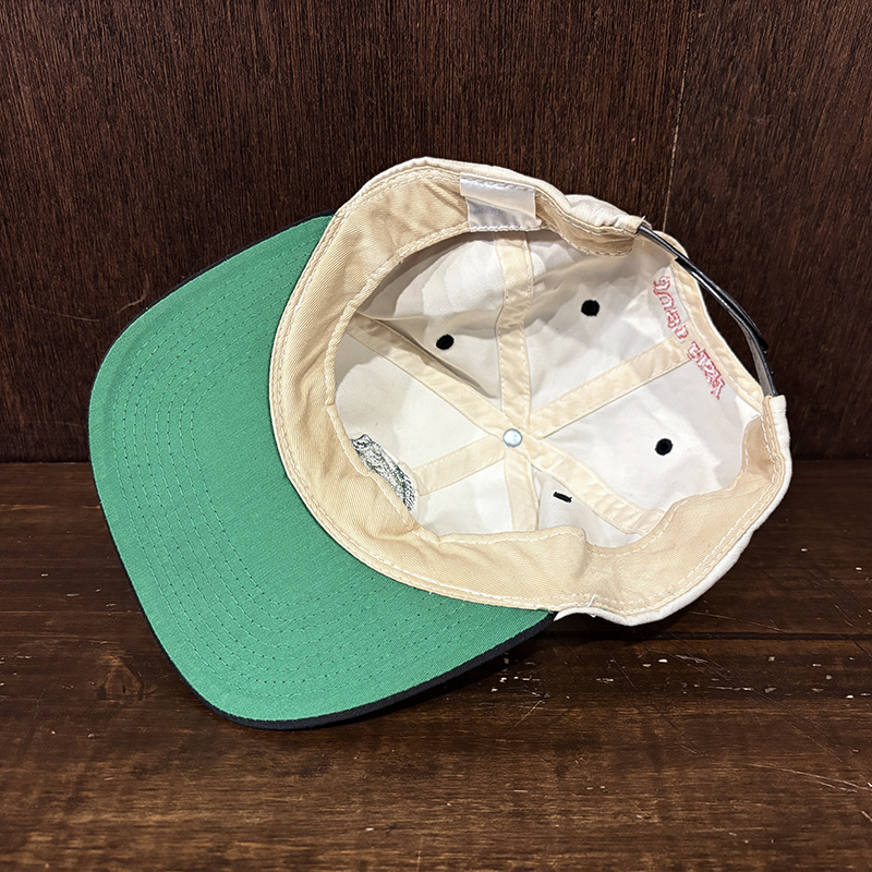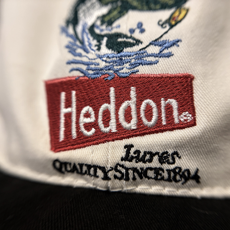 Heddonらしいルアーにバイトしたジャンピングバスとフラッグロゴがフロントに刺繍されたフィッシングキャップ、ブラックとアイボリーにツバ裏のグリーンバックで良いカラーコンビの絵になる個体です、トップウォーターフィッシングはじめさまざまなアウトドアシーンや日常使いにも、是非ご検討ください。