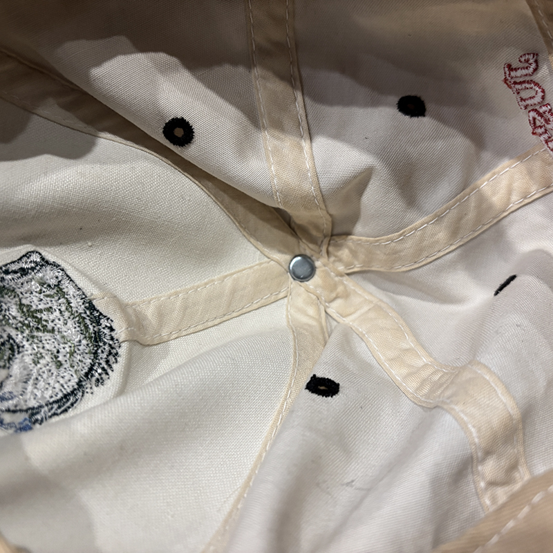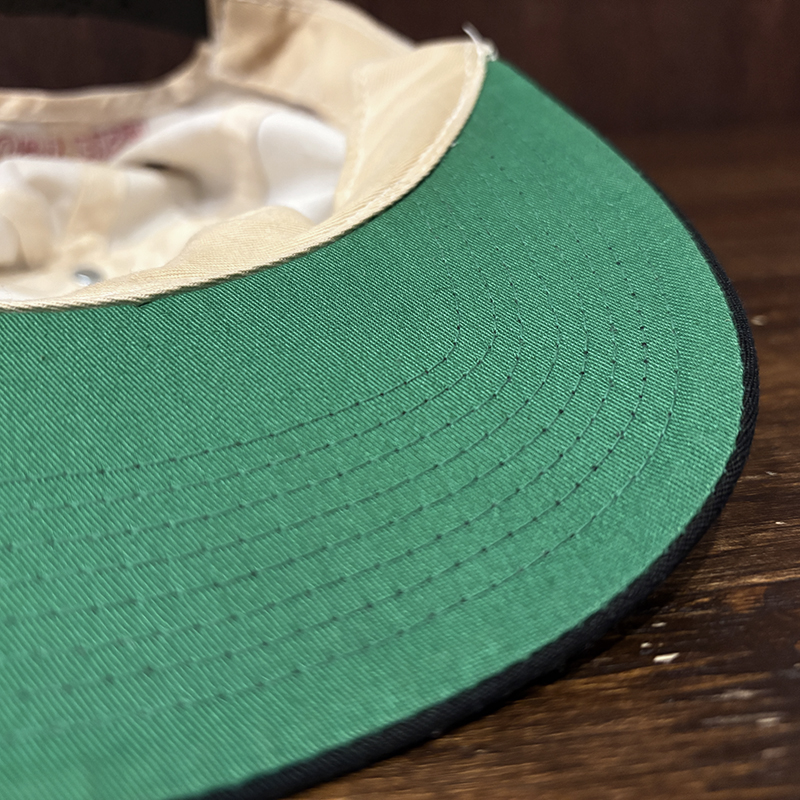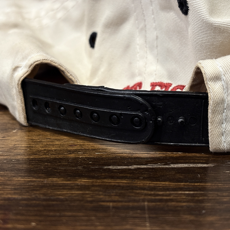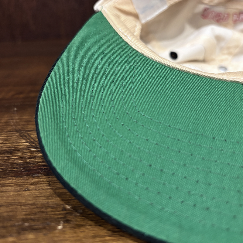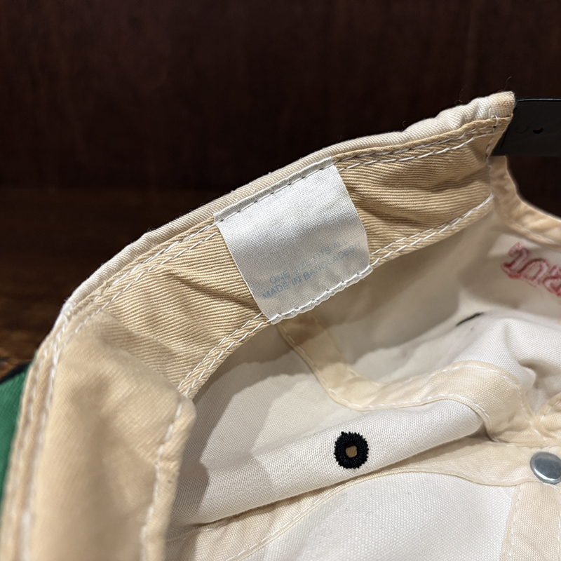 状態は経年の使用と保管によるツイル生地表面の擦れやくすみ汚れ、スナップバックのバンド箇所のところどころの小さな凹みなどが散見されますが、クラウンはじめツバの生地もまだまだしっかりとした良い状態を保っており、クラウンフロントのバス刺繍も綺麗な状態を維持したまだまだ使い込んでいただけるオールドキャップとなっています。