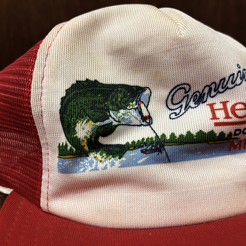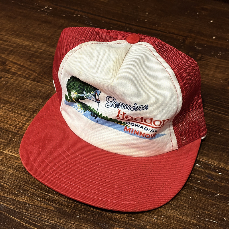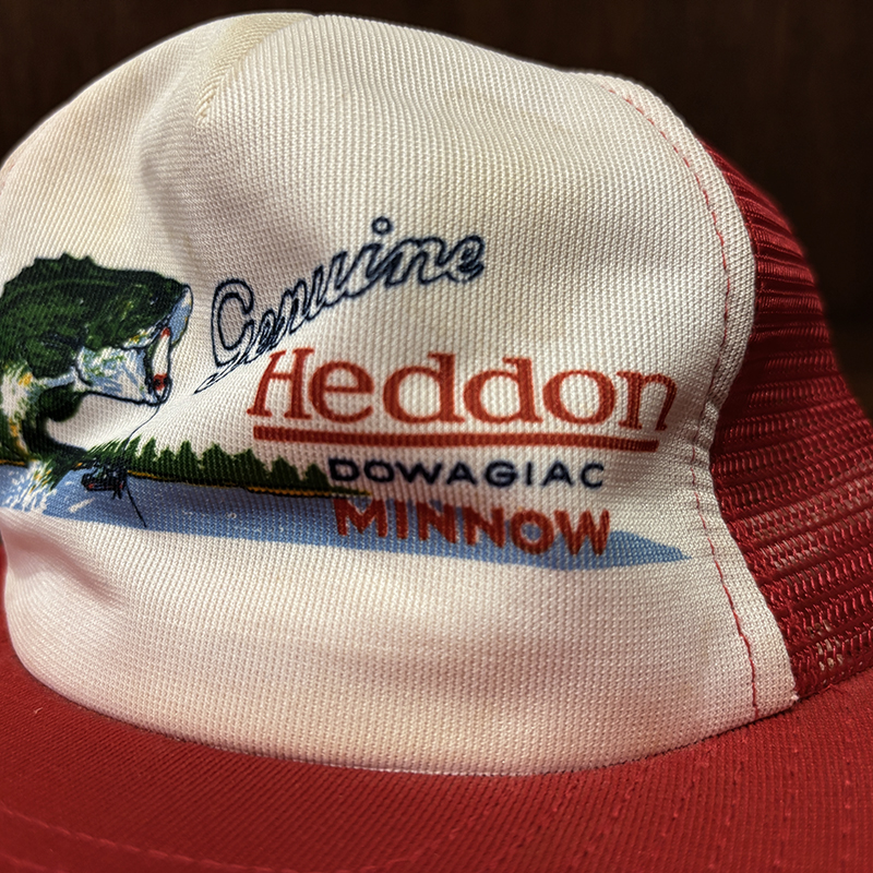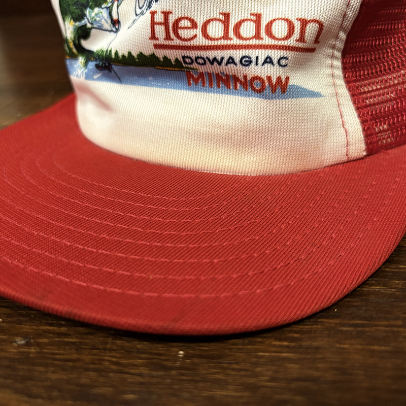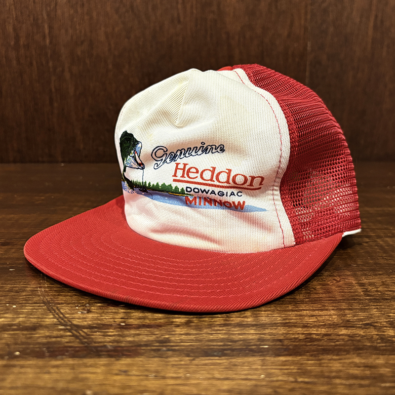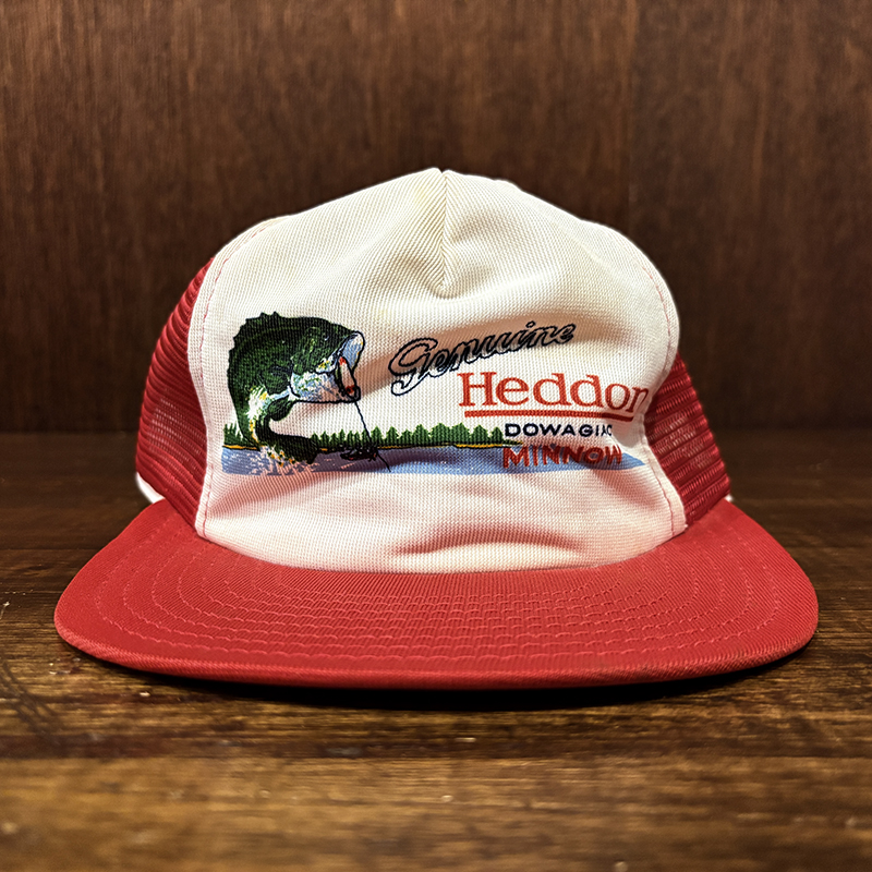 Heddon Dowagiac Minnowロゴでジャンピングバスとのフィールドでのやりとりが描かれたオールドメッシュキャップ、イラストタッチやレッドとアイボリーのツートンがなんともアメリカを代表するヘドンらしい仕上がりのオールドキャップです、ヘドンキャップでも非常にレアな一品、アウトドアシーン全般からトップウォーターフィッシングなどにマッチします、是非ご検討ください。