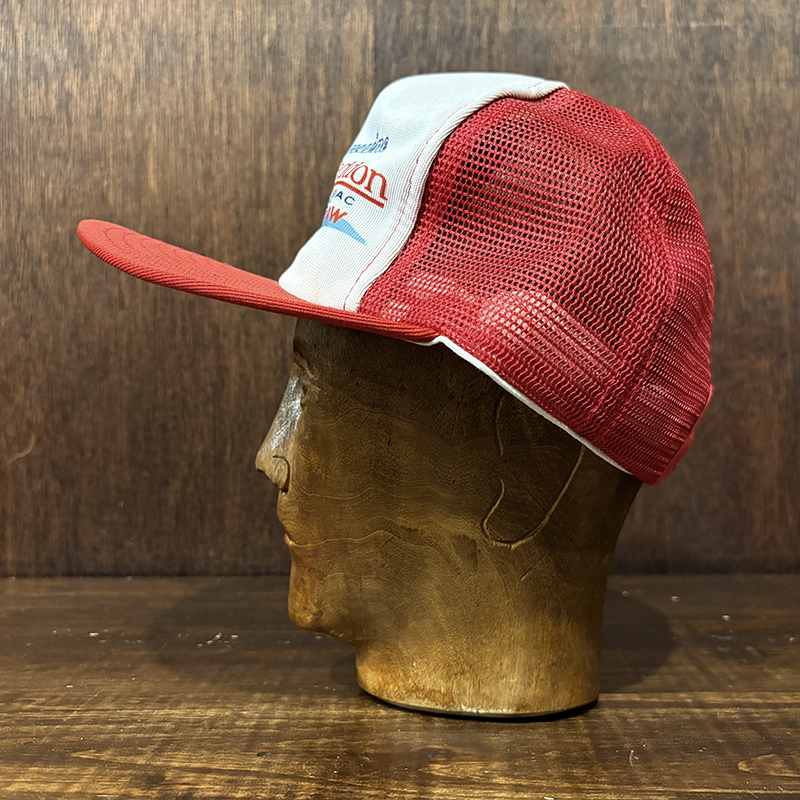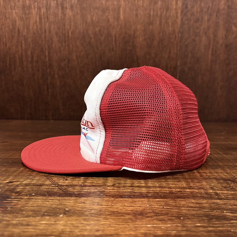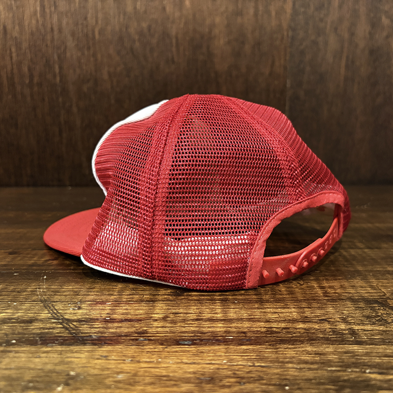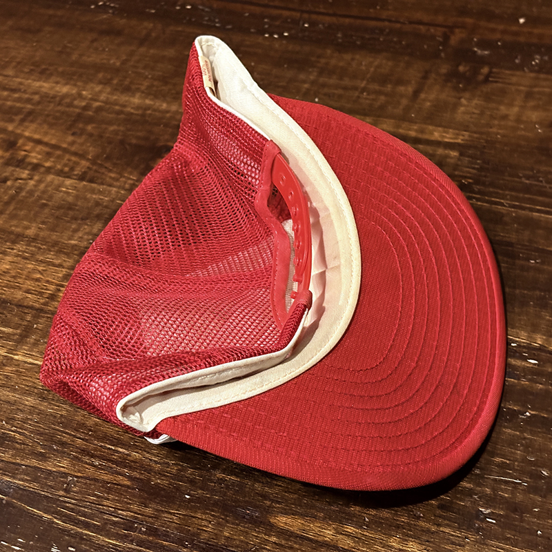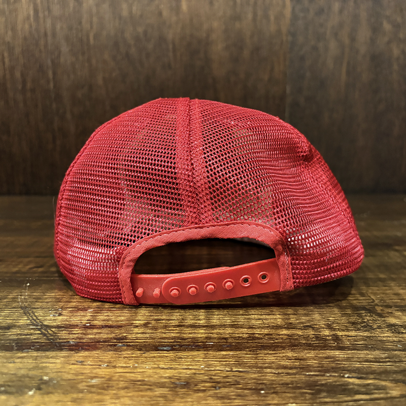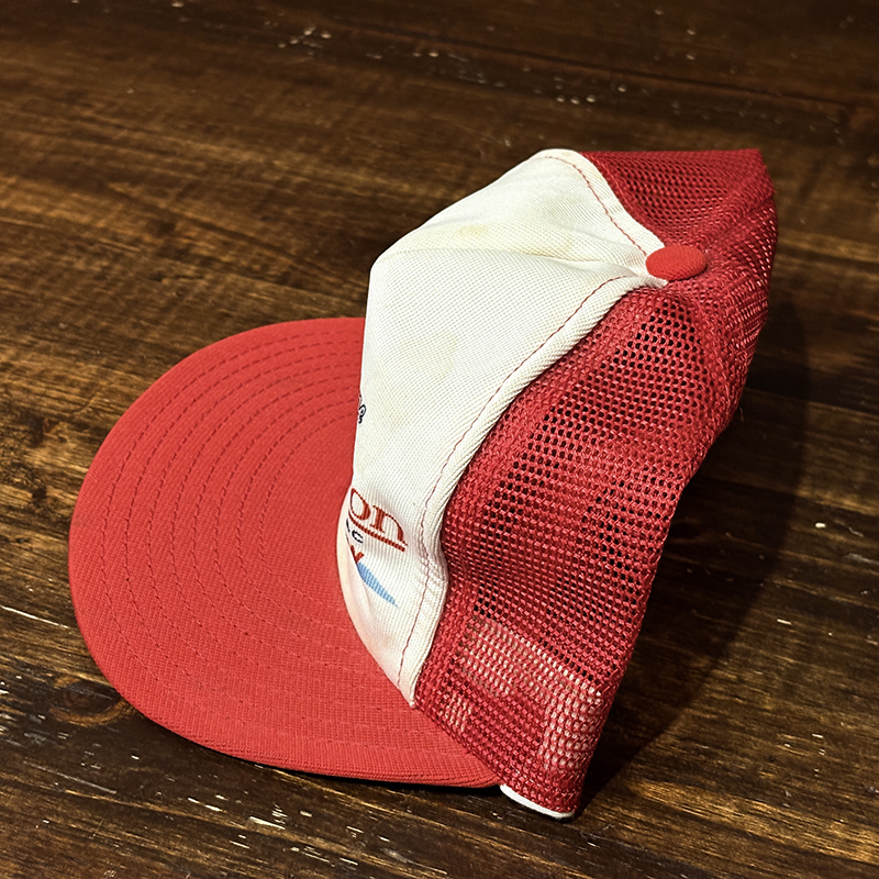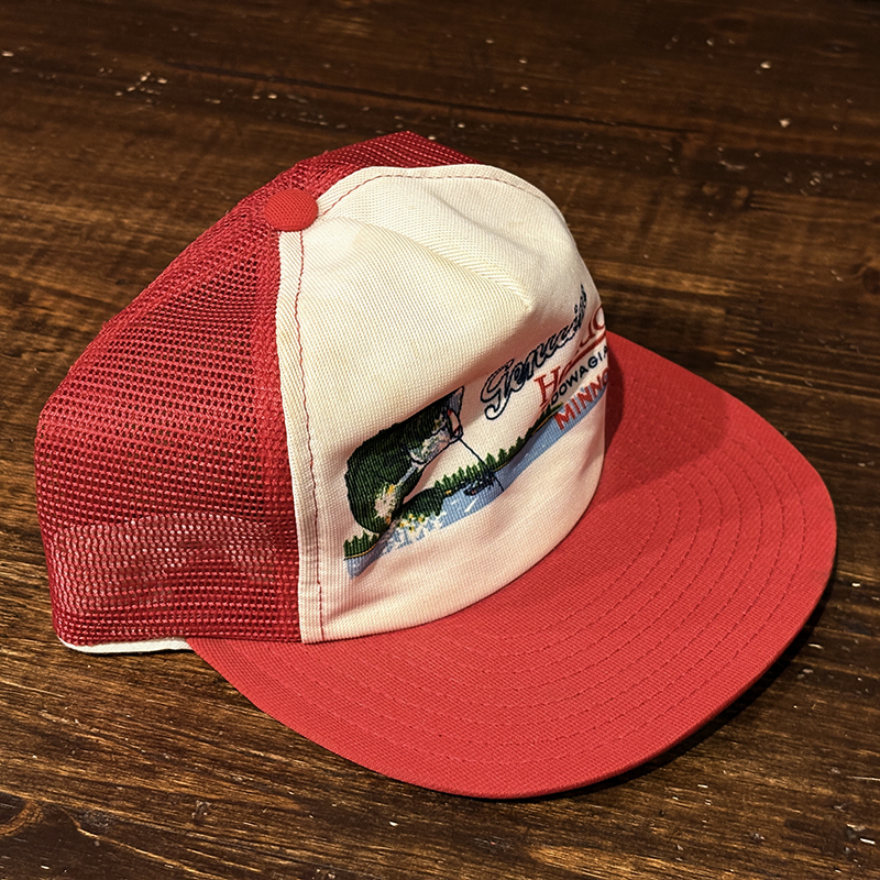 Heddon Dowagiac Minnowロゴでジャンピングバスとのフィールドでのやりとりが描かれたオールドメッシュキャップ、イラストタッチやレッドとアイボリーのツートンがなんともアメリカを代表するヘドンらしい仕上がりのオールドキャップです、ヘドンキャップでも非常にレアな一品、アウトドアシーン全般からトップウォーターフィッシングなどにマッチします、是非ご検討ください。
